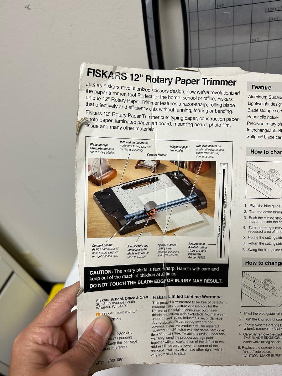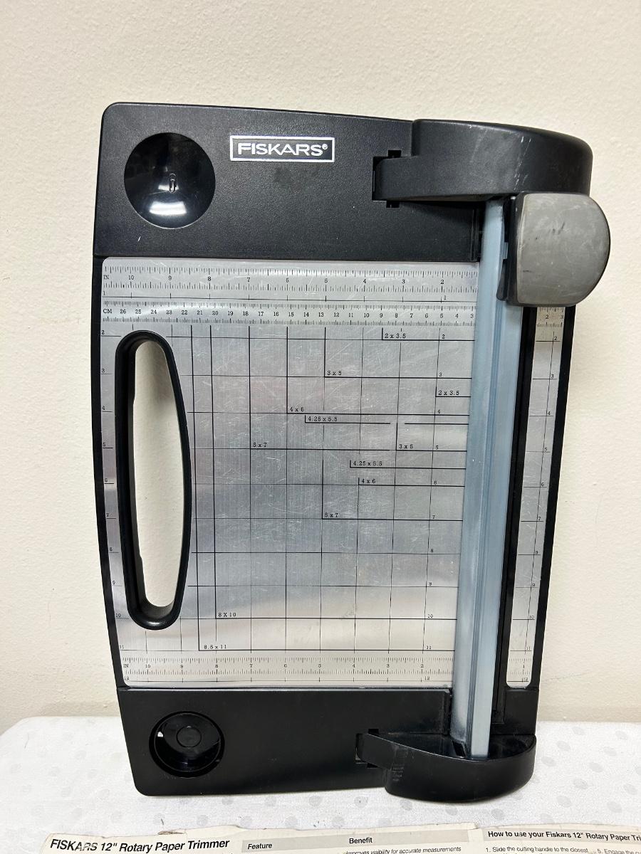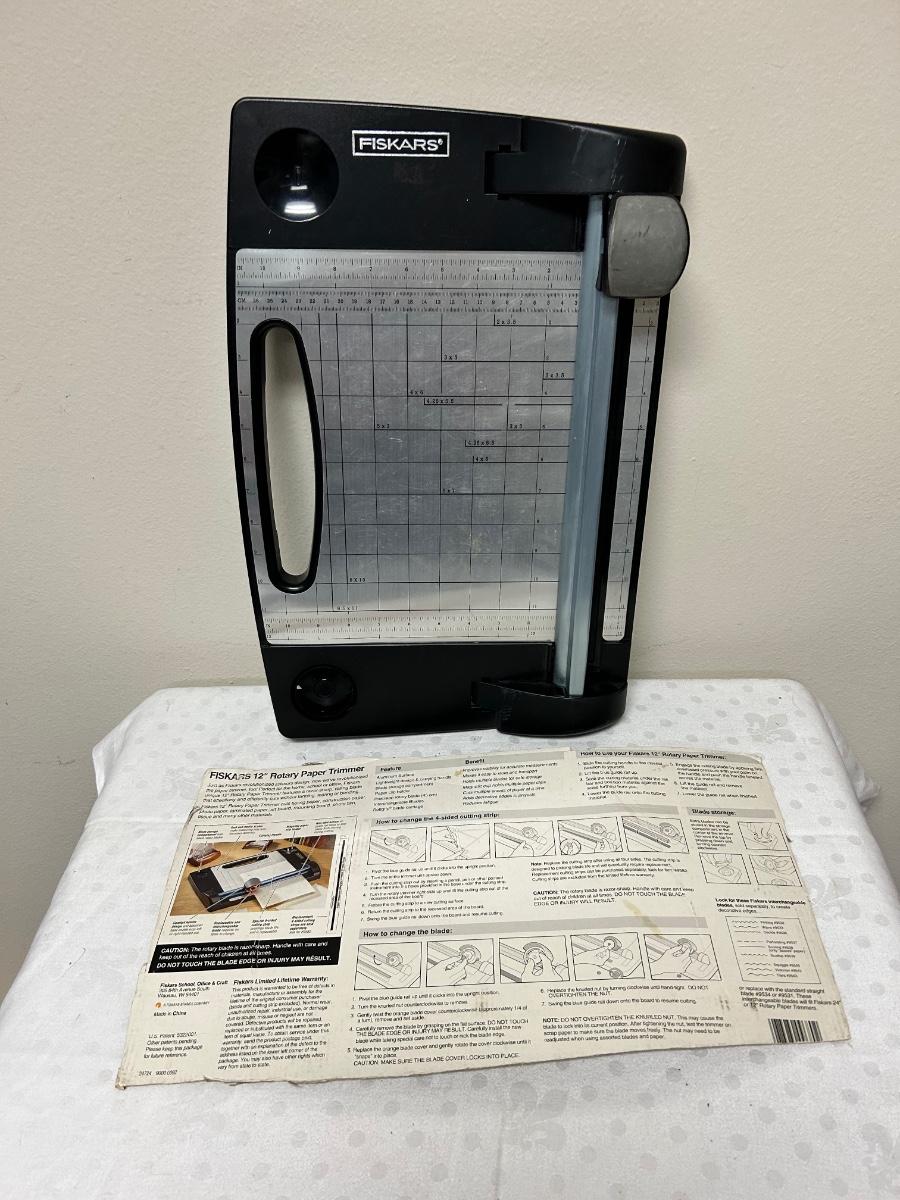 Fiskars 12" Rotary Paper Trimmer with Instructions. Previous owner kept the part of packaging with instructions. In good condition.