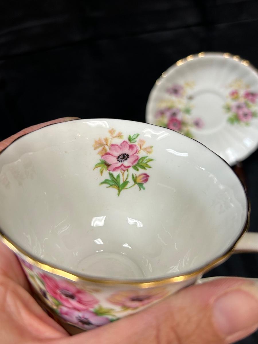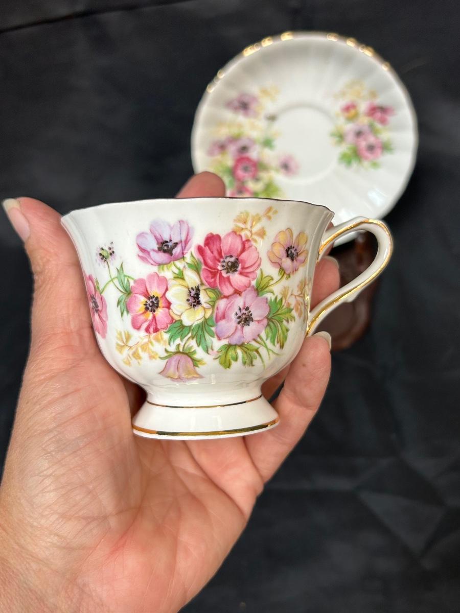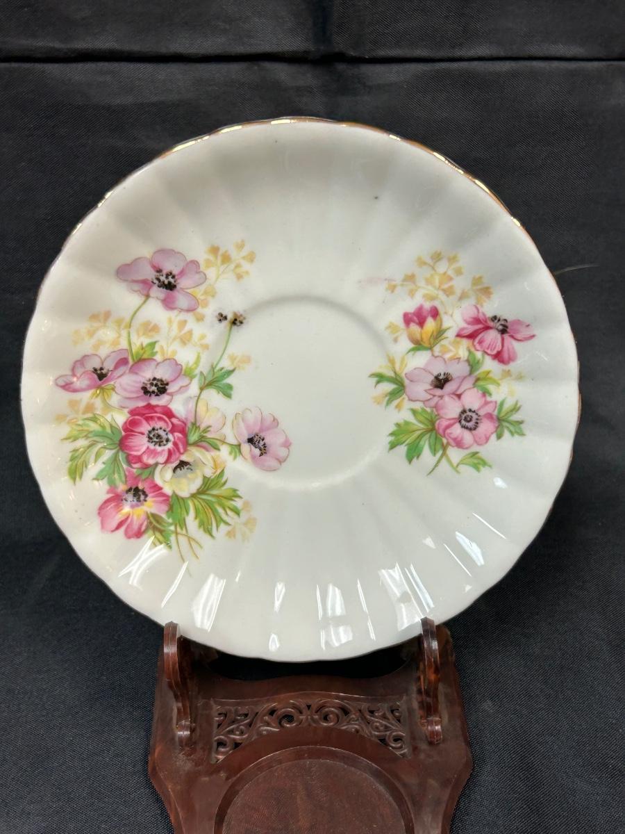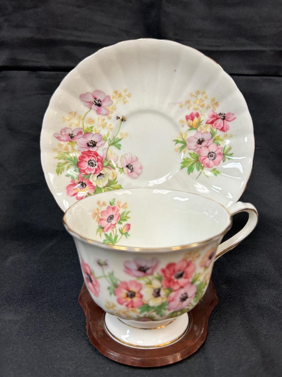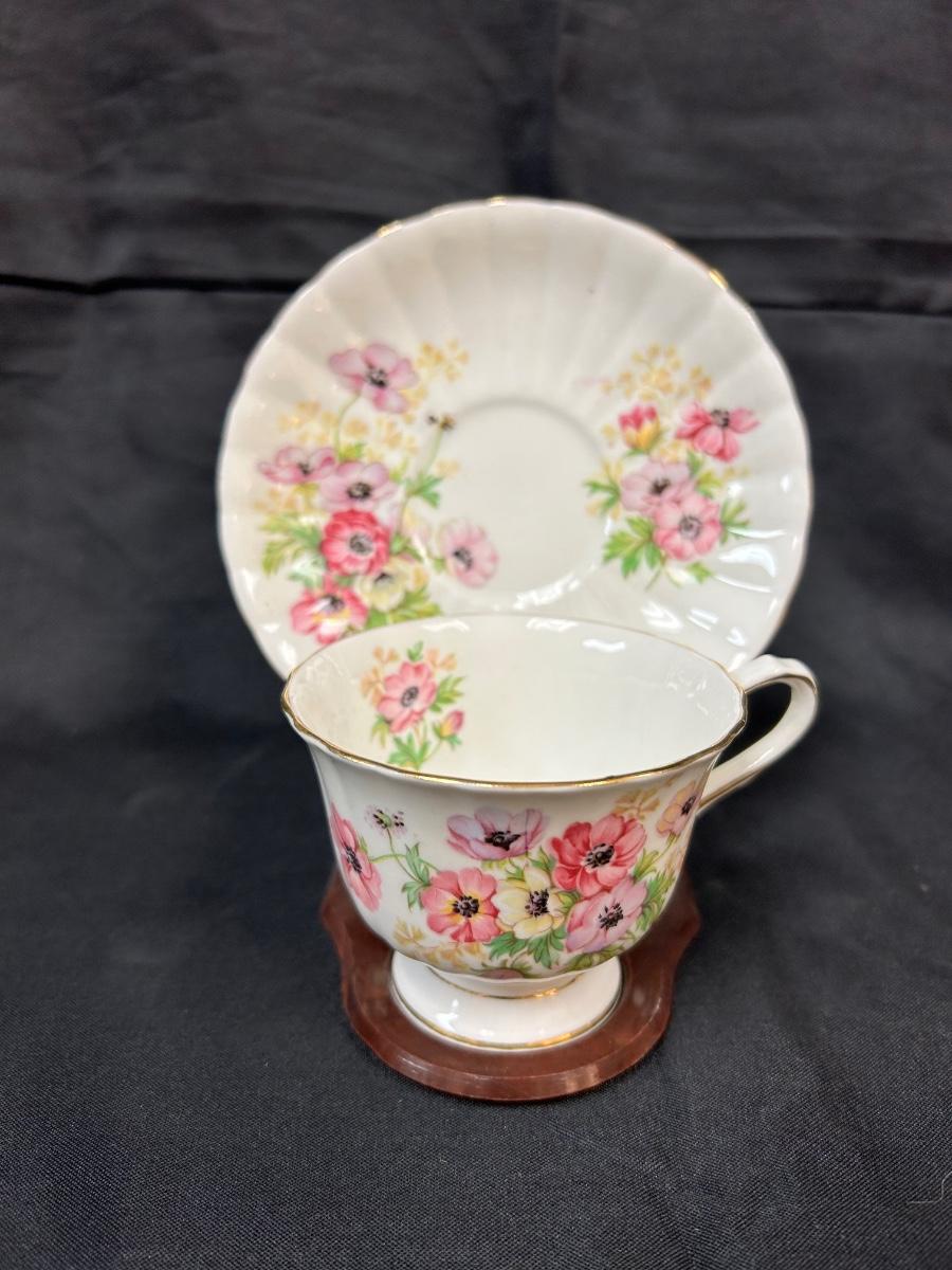 Vintage Clarence England Bone China Colorful Poppy Flower Teacup and Saucer with Display Stand