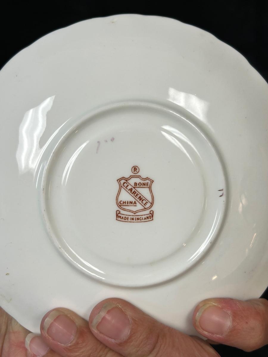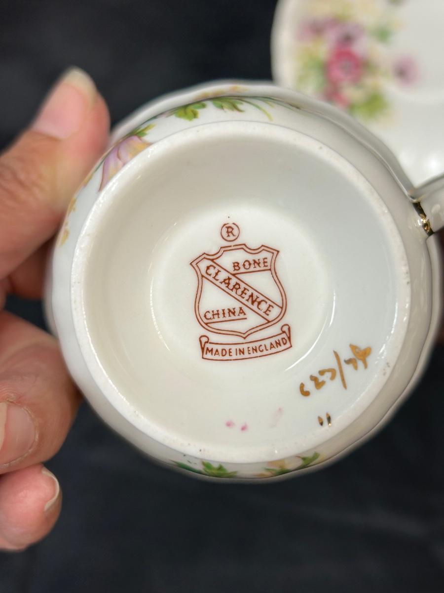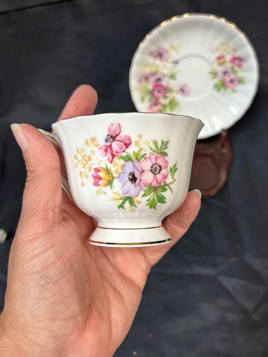 Vintage Clarence England Bone China Colorful Poppy Flower Teacup and Saucer with Display Stand. In good condition. No chips or cracks noticed.