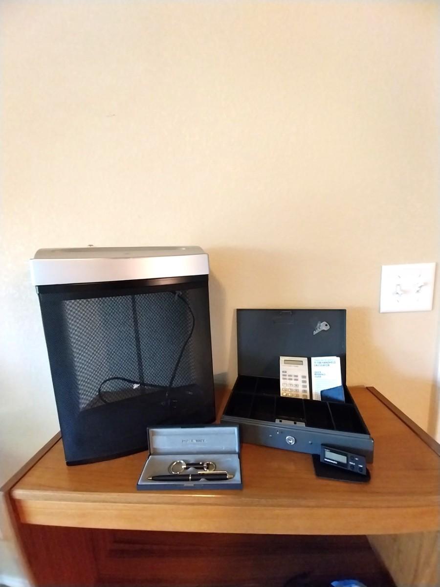 FELLOWES PAPER SHREDDER, CASH BOX, PEN & KEYCHAIN SET