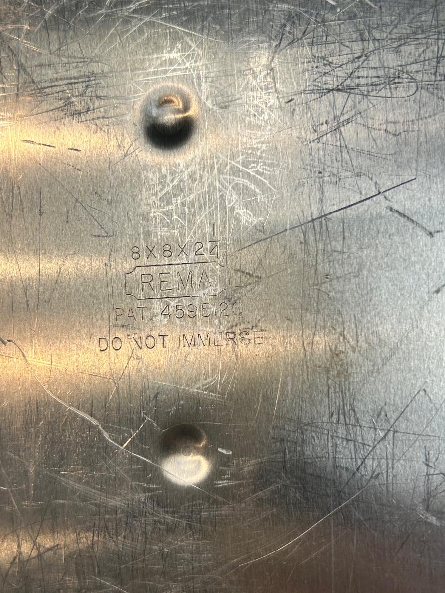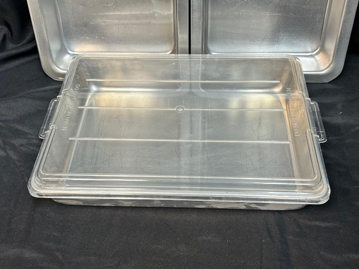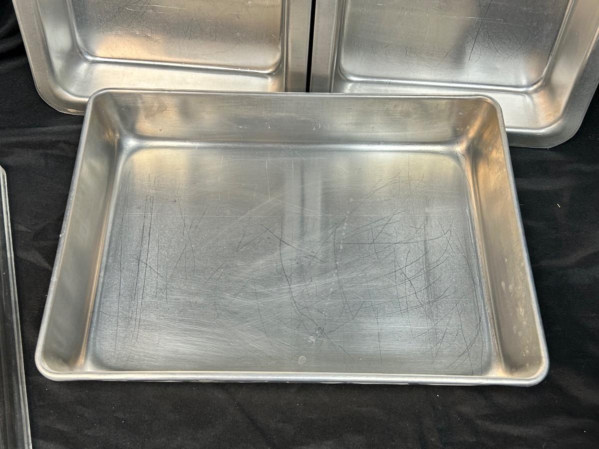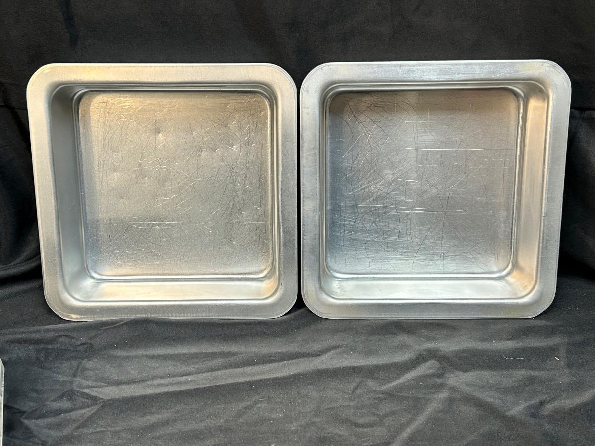 Vintage Aluminum Bakeware Cake Pans and Sifter. Square pans are insulated, thick wall. Rectangle pan has plastic lid to help keep food fresh. Sifter is in good vintage condition.