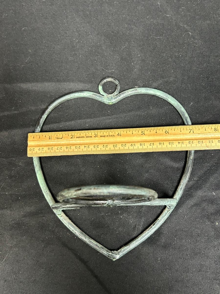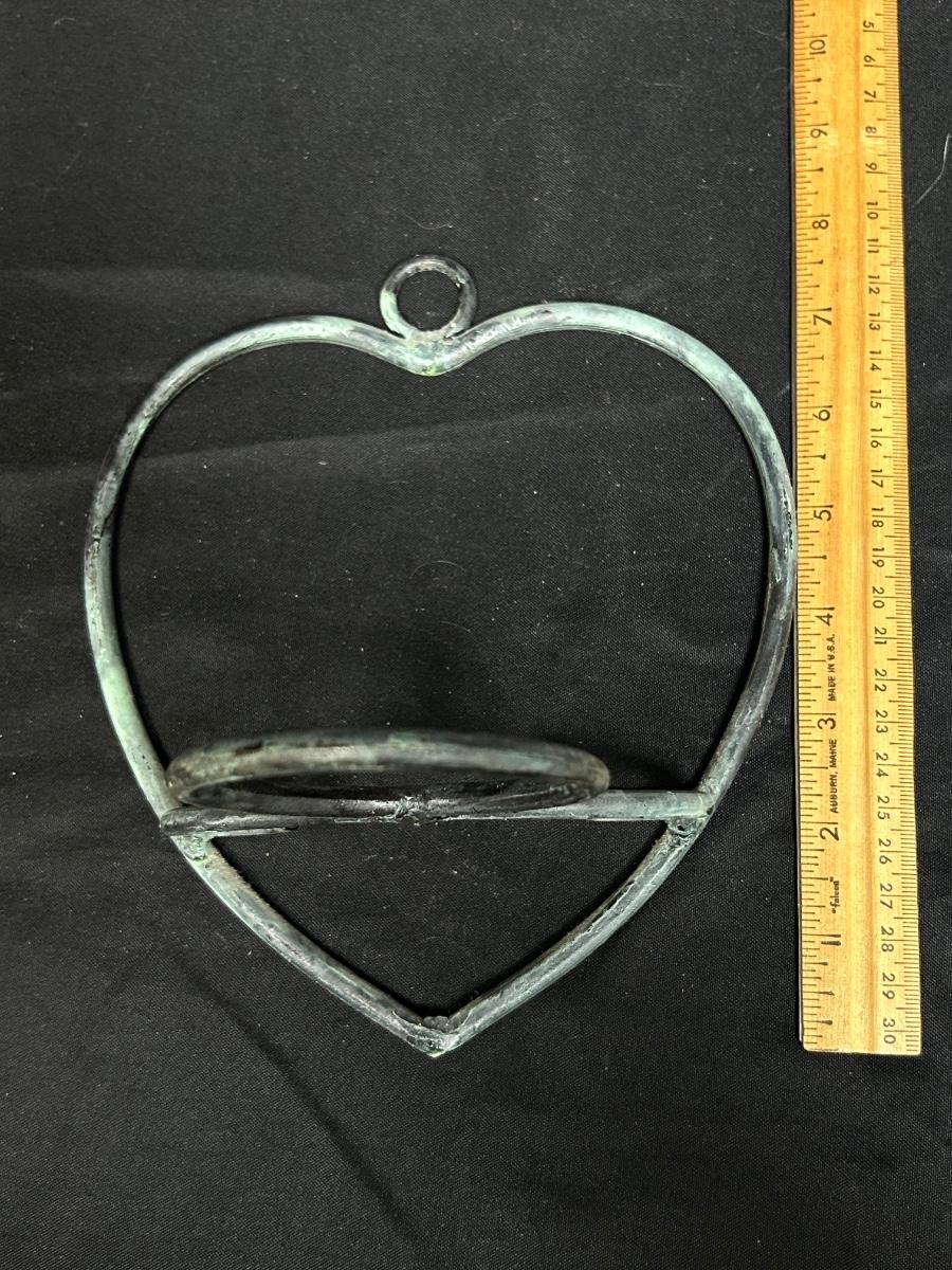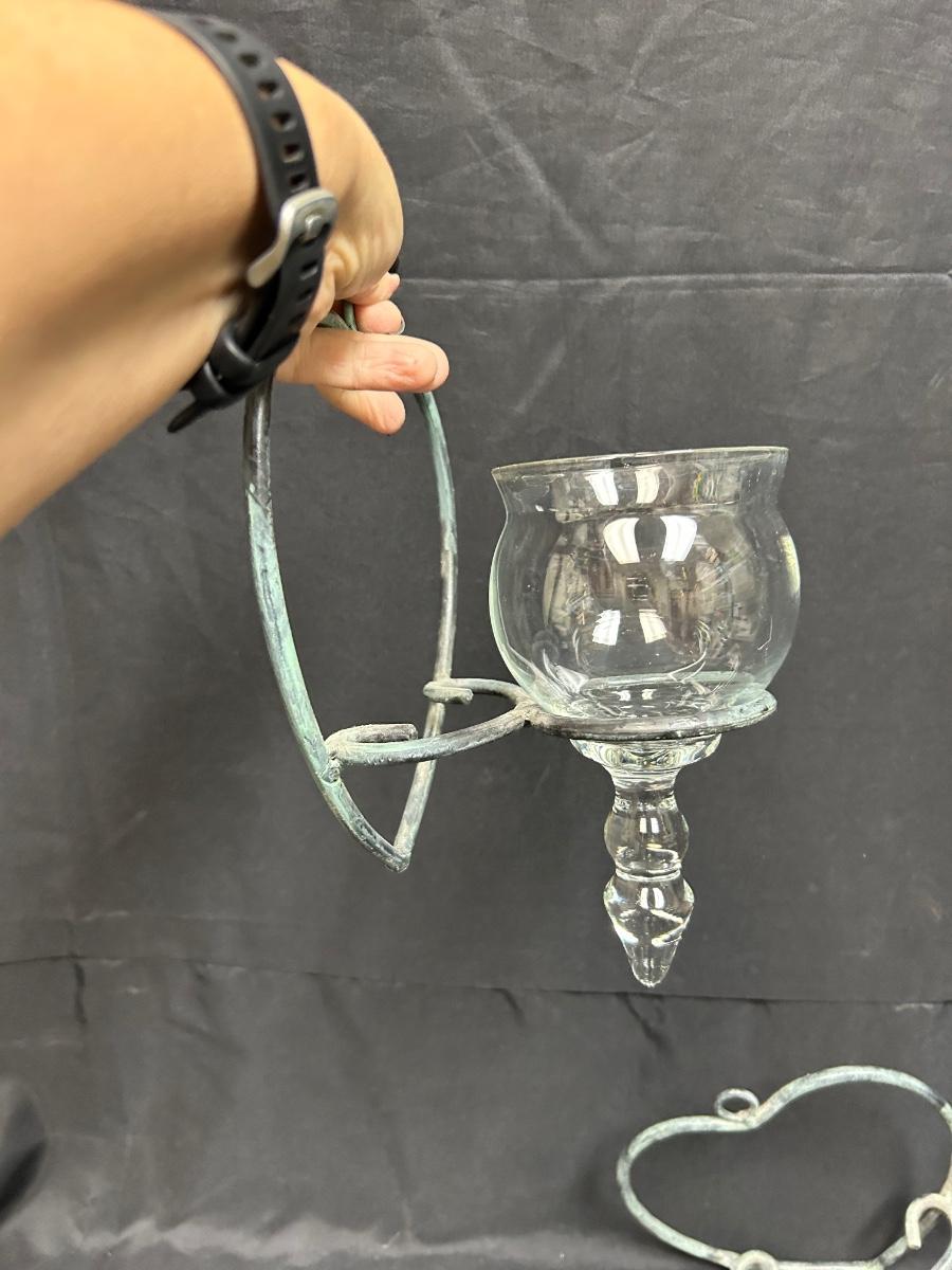Patinaed Heart Shaped Wall Hanging Candle Holders with Glass Holder Inserts. In good condition. Glass holders are about 7" size.