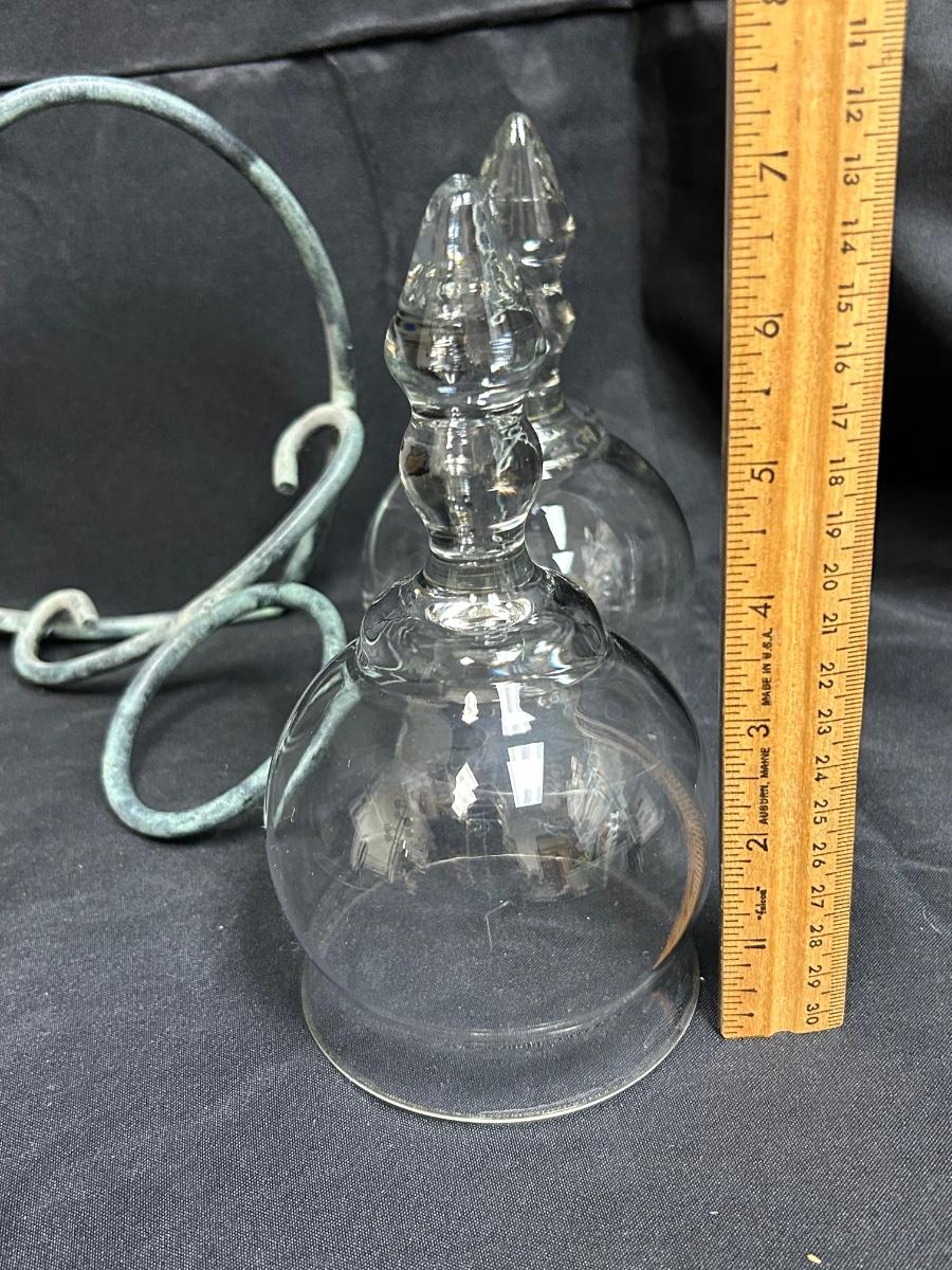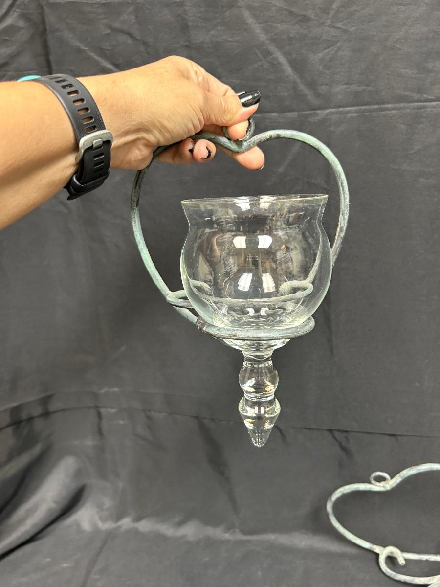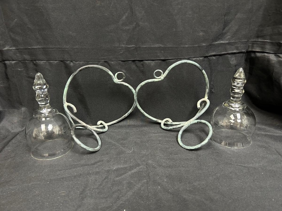 Patinaed Heart Shaped Wall Hanging Candle Holders with Glass Holder Inserts. In good condition. Glass holders are about 7" size.