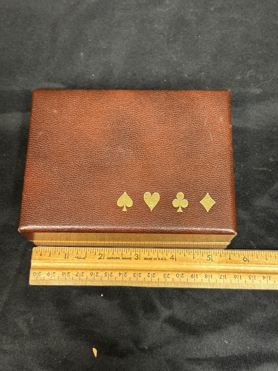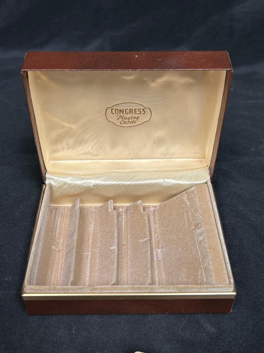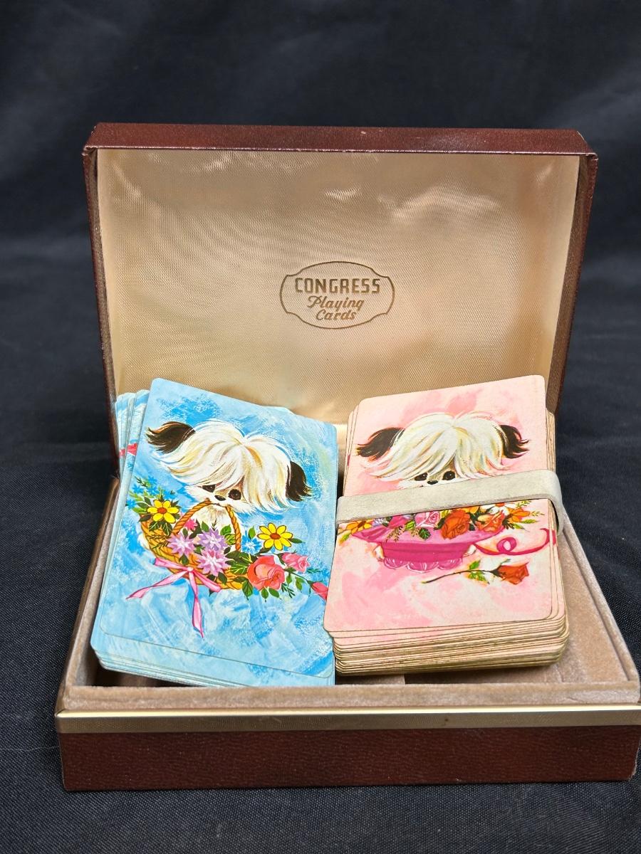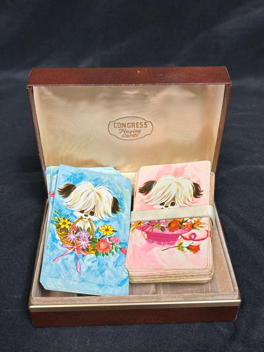 Vintage Pink and Blue Puppy with Flower Basket Playing Cards in Hinged Lid Storage Box. Cards have not been checked for completeness. In good condition.