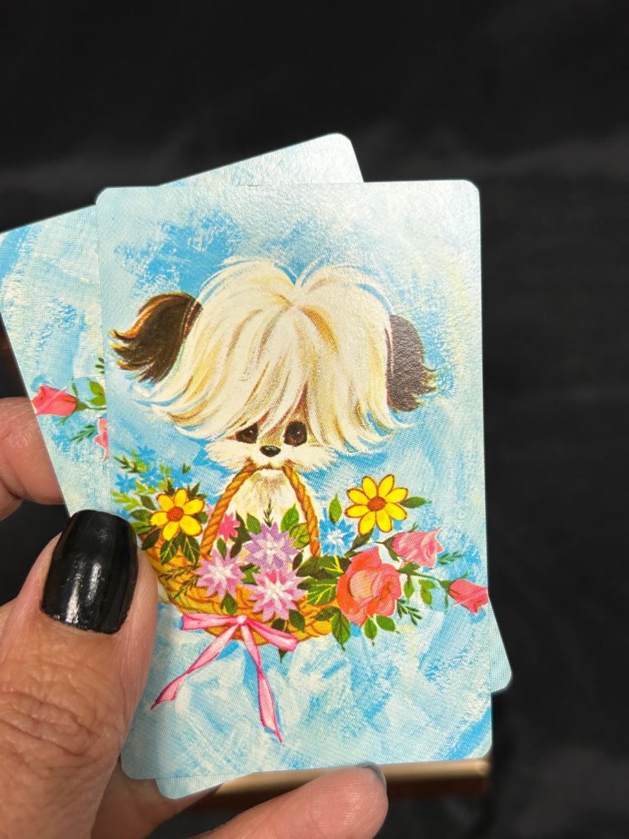 Vintage Pink and Blue Puppy with Flower Basket Playing Cards in Hinged Lid Storage Box