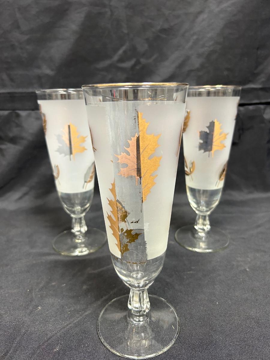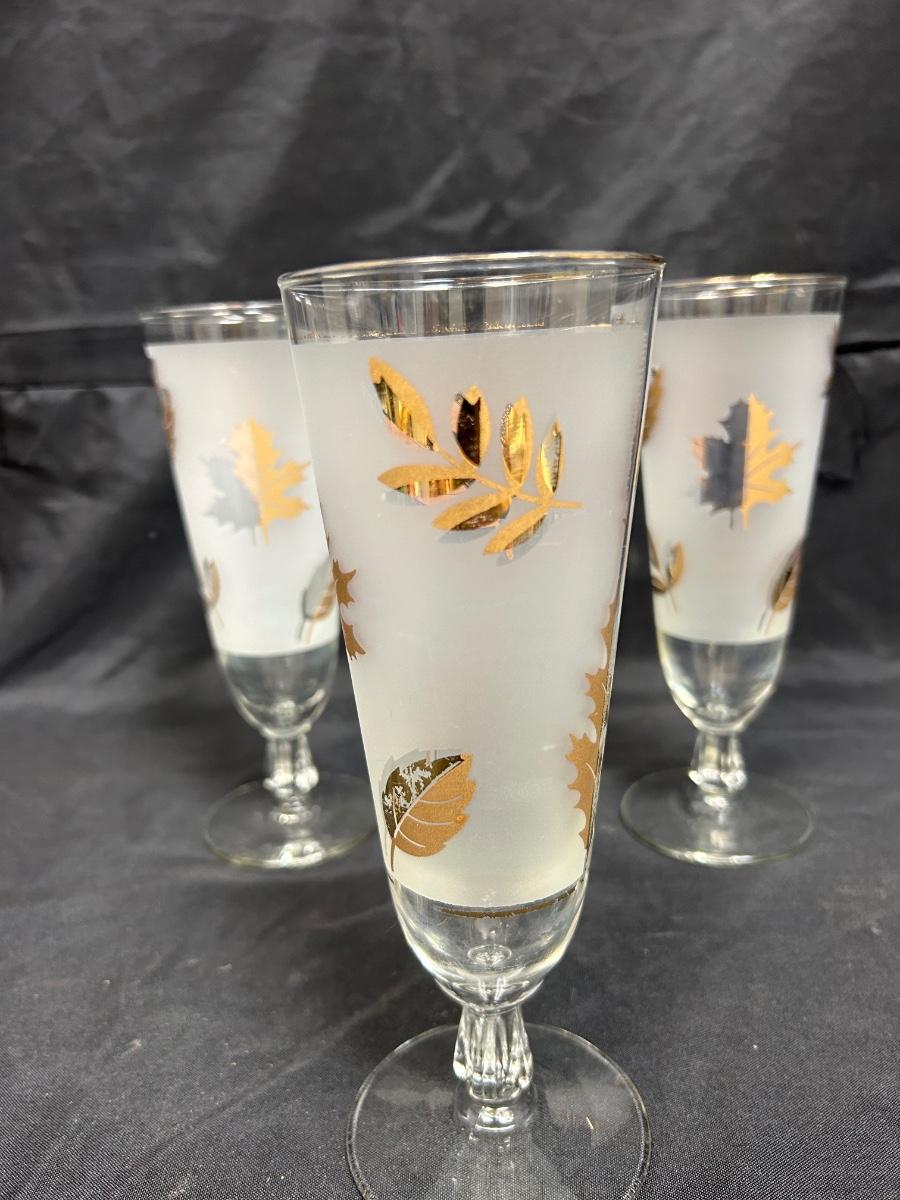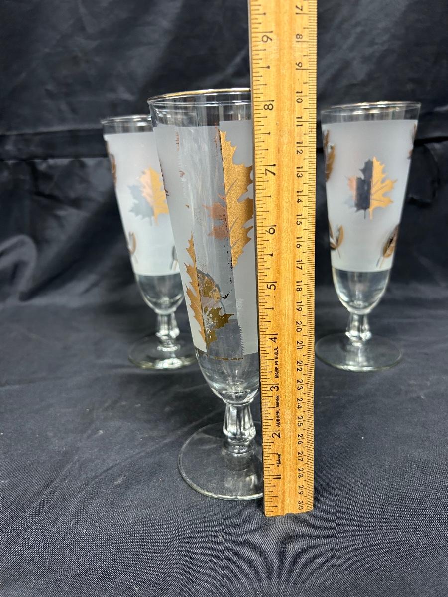 Set of Three Midcentury Vintage Golden Foilage Pilsner Footed Drink Glasses Libbey. Some light wear to the gold pattern but in overall good useable and displayable condition.
