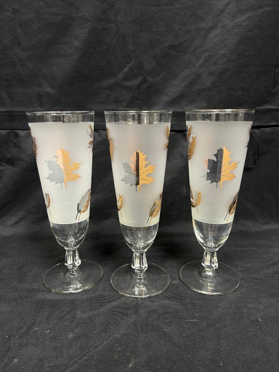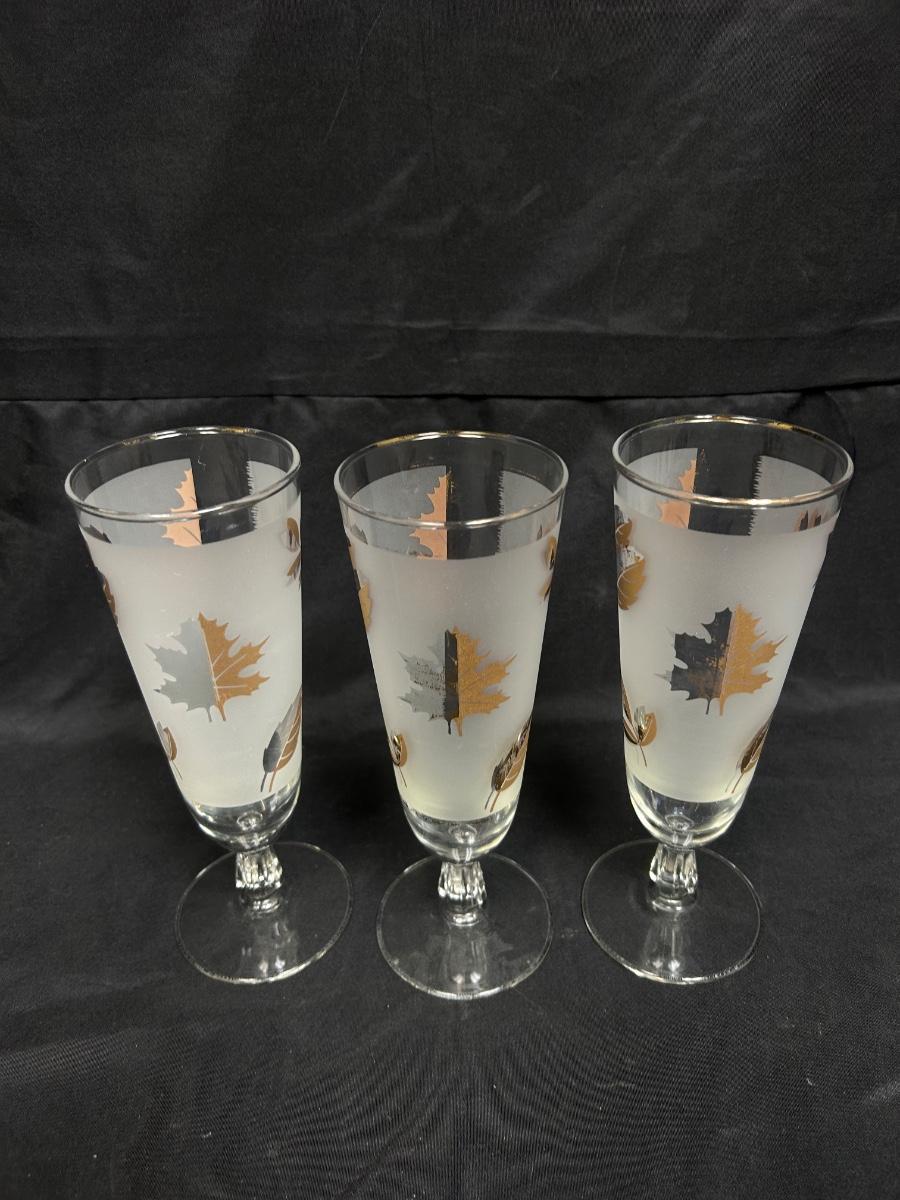 Set of Three Midcentury Vintage Golden Foilage Pilsner Footed Drink Glasses Libbey