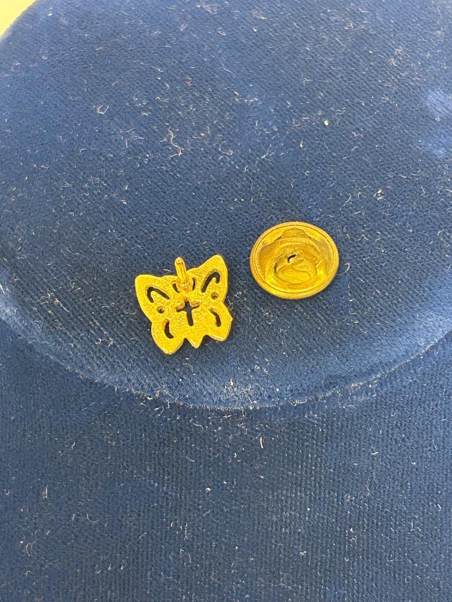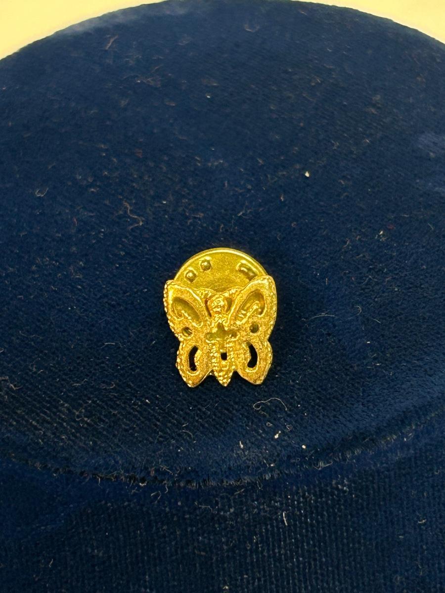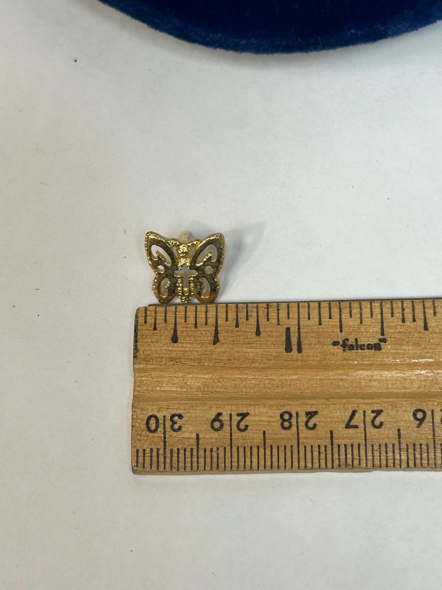 Small Gold Tone Butterfly Lapel Pin Button. In good condition. Cut out pattern has a tiny cross in the center. About 1/2" size.