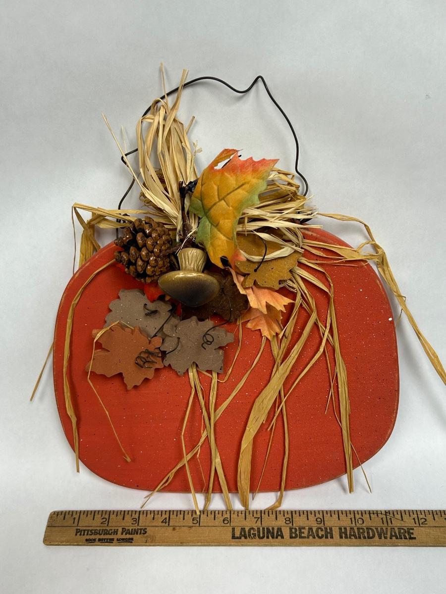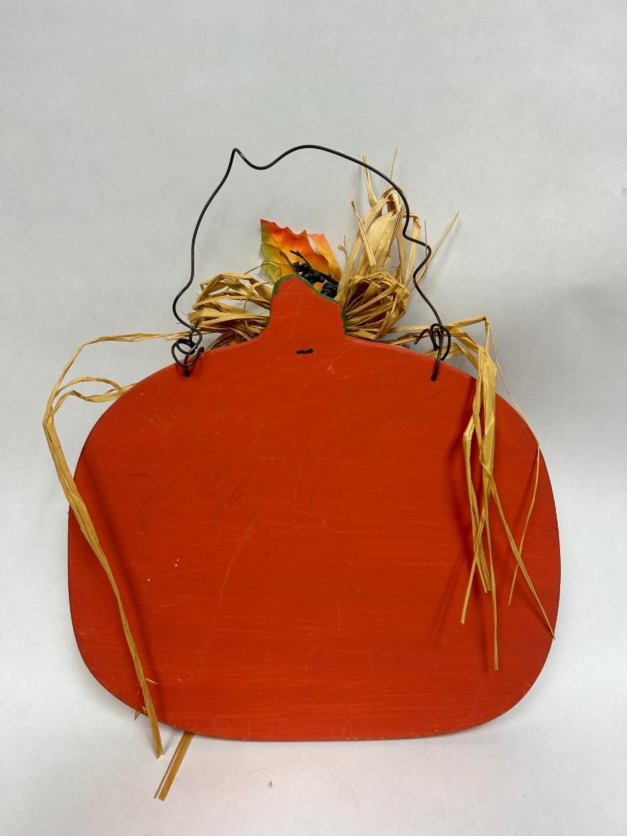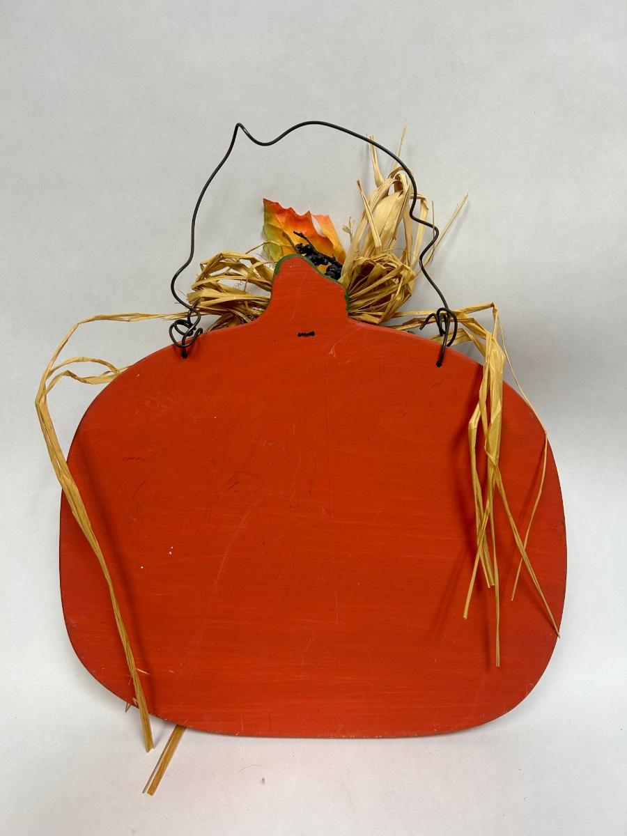 Folk Art Rustic Painted Wood Pumpkin Fall Thanksgiving Wall Decor. In good displayed condition.