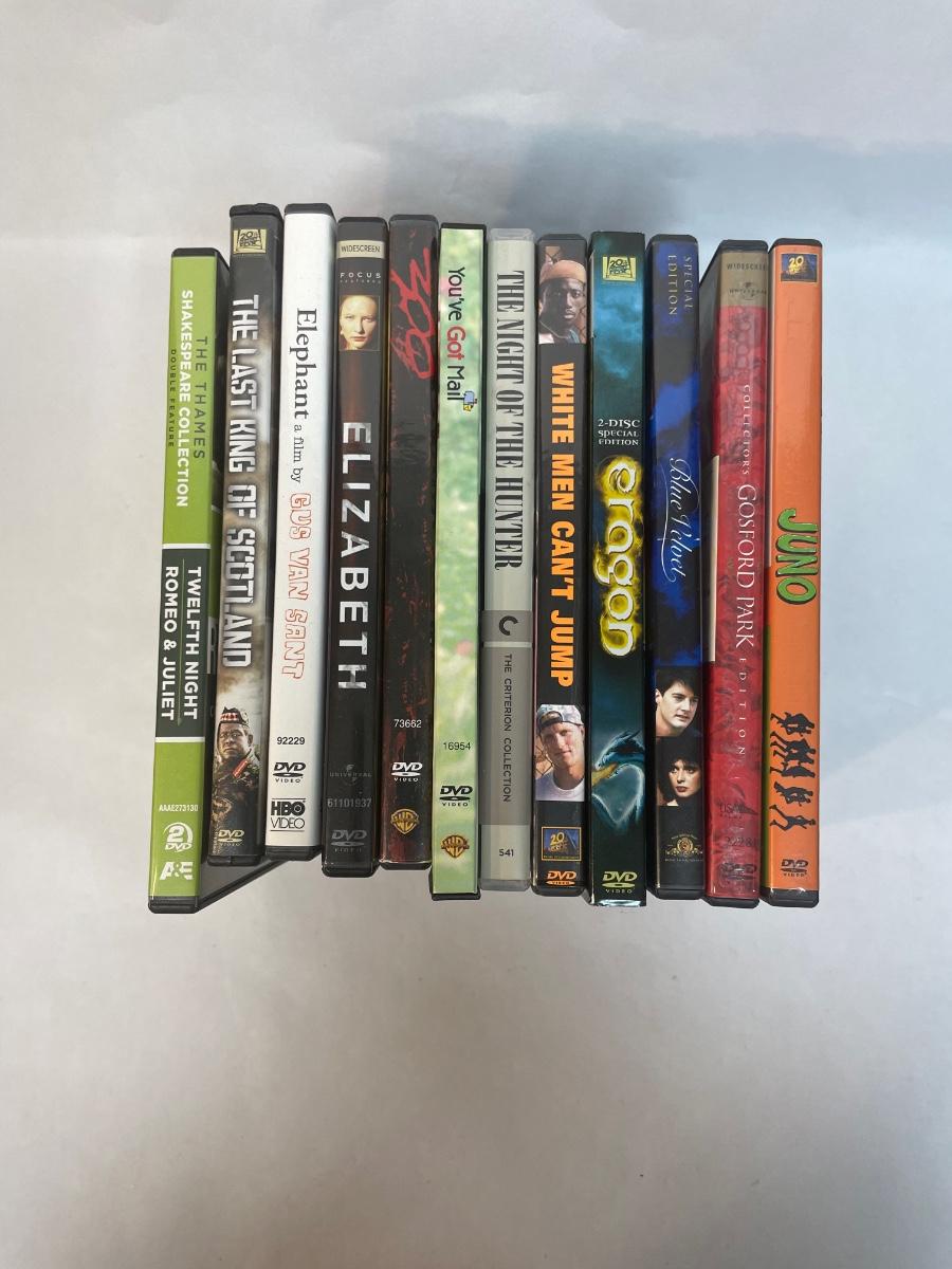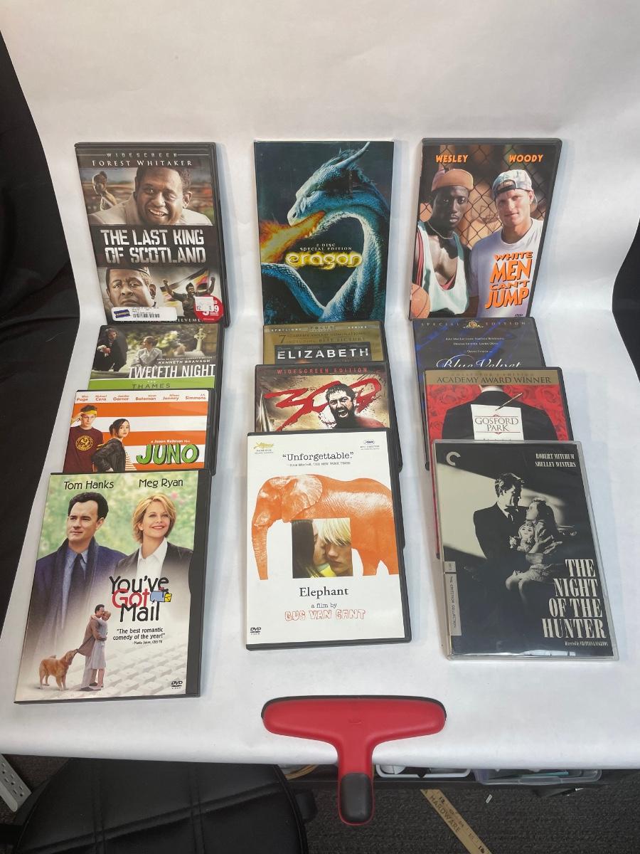 Includes 12 movies in original cases. Includes The Last King of Scotland, White Men Can't Jump, You've Got Mail, Juno, and others. See photos for other titles.