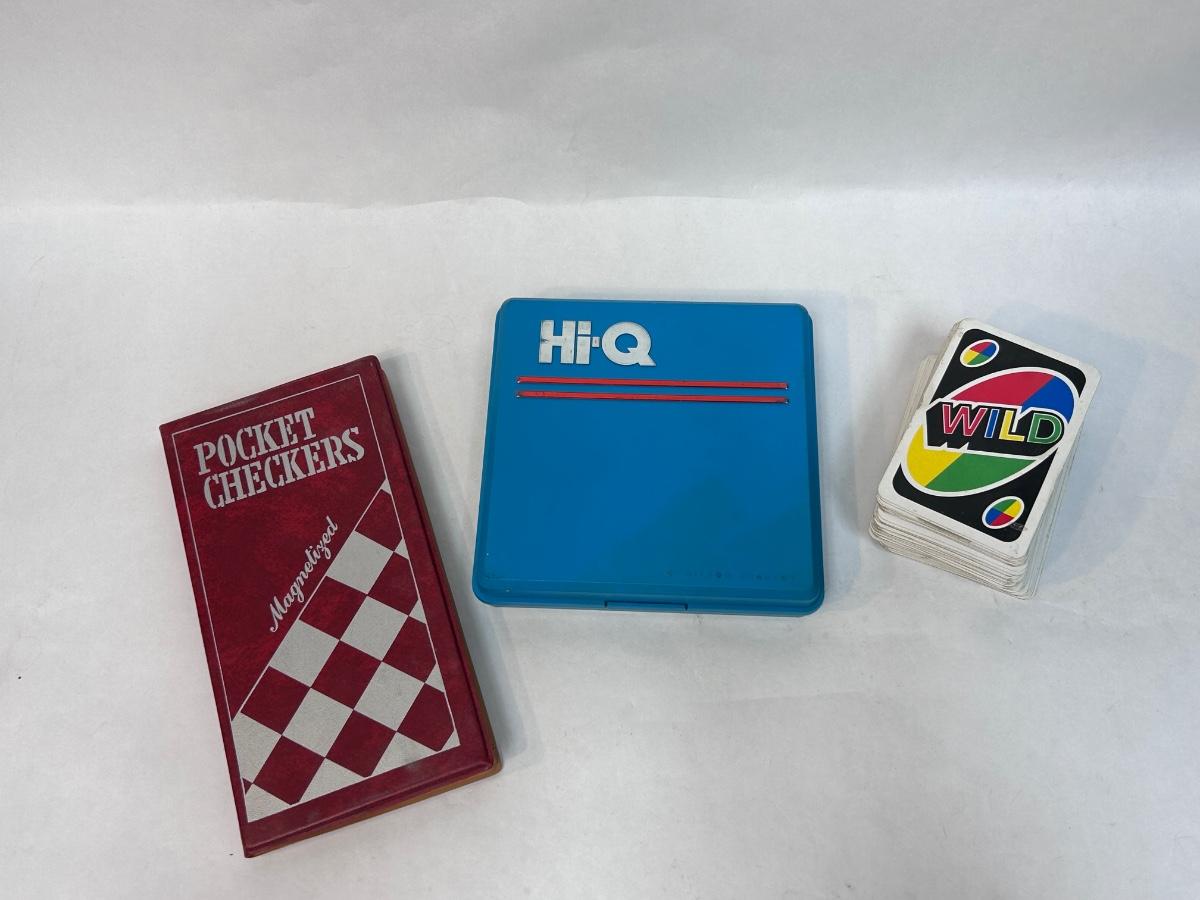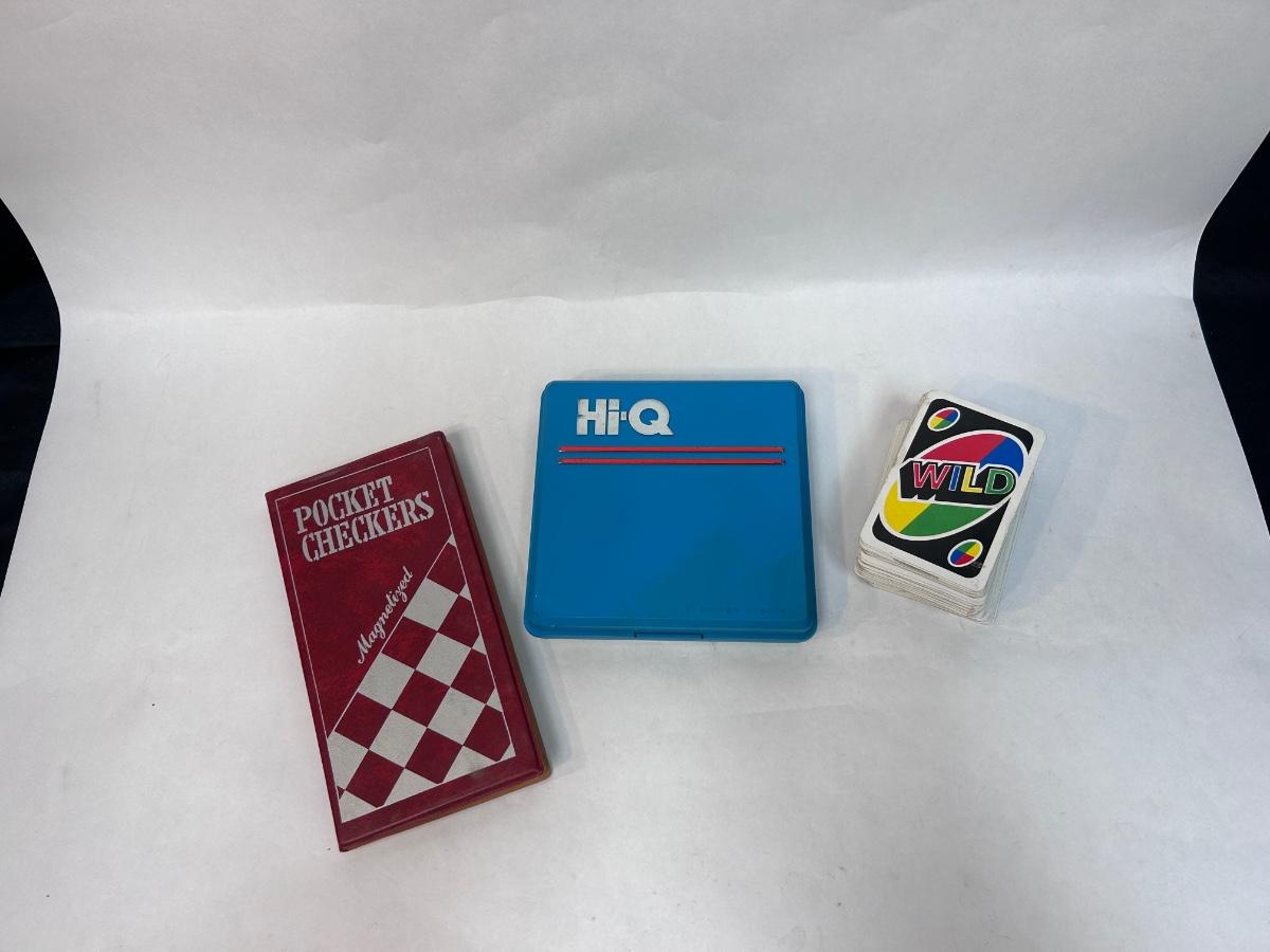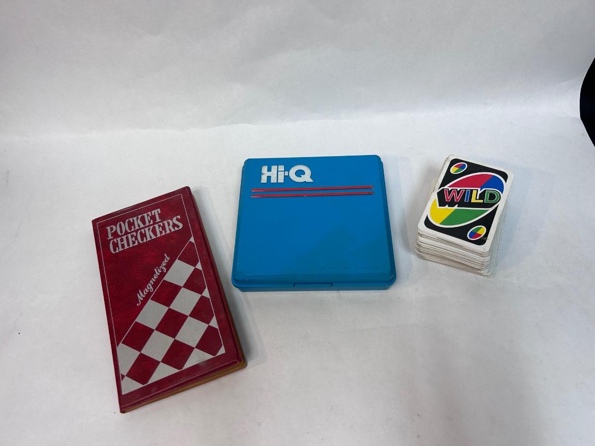 Vintage Retro Travel Pocket Checkers Hi-Q and UNO Card Game. In played with condition. Uno does not have a box, stack of cards is large, most likely complete enough for great game play. Pocket checkers is magnetic, not recommended for small children.