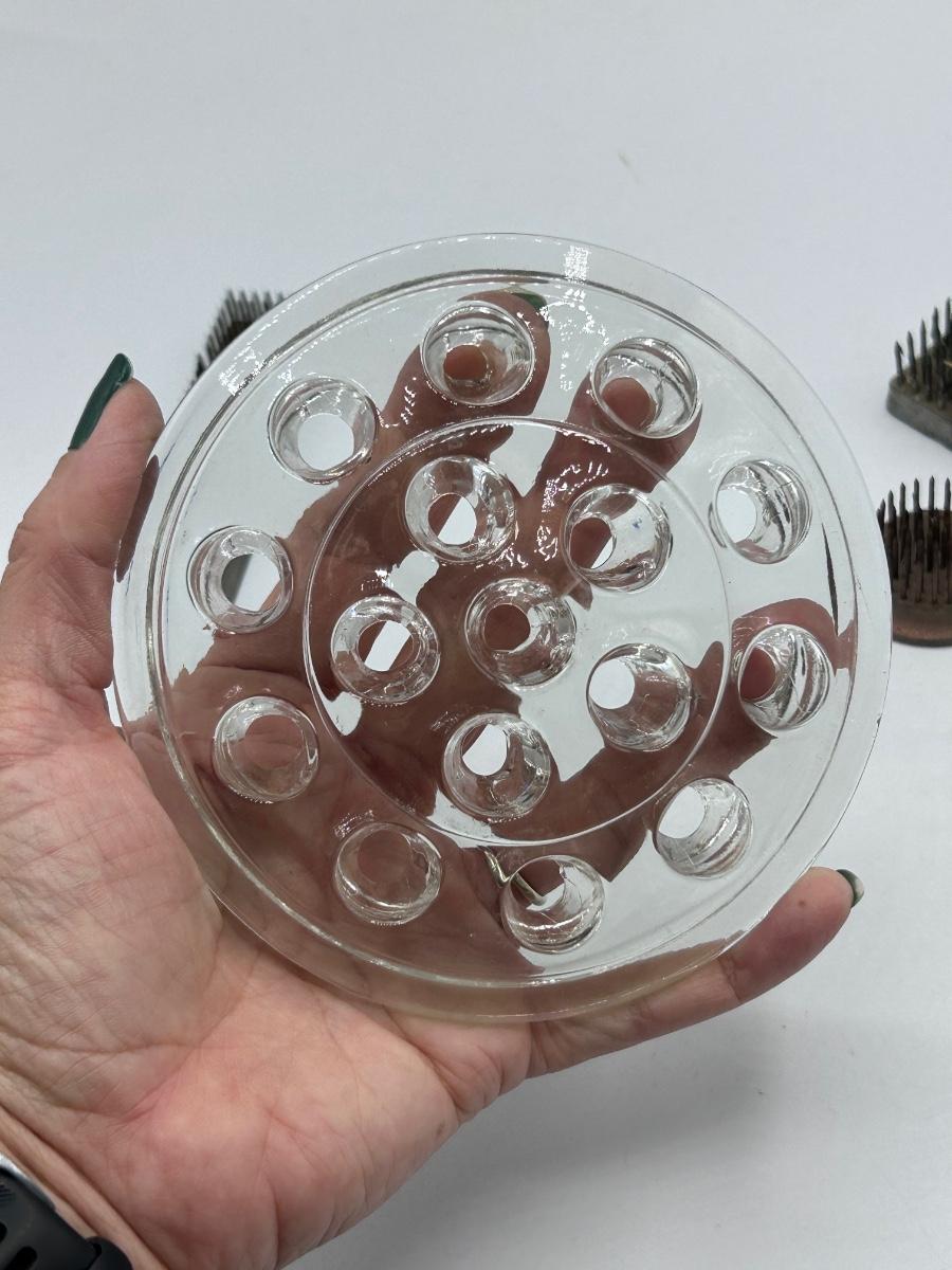 Set of Four Floral Flower Arrangement Frogs Glass & Metal. In good condition. No chips in the glass piece.