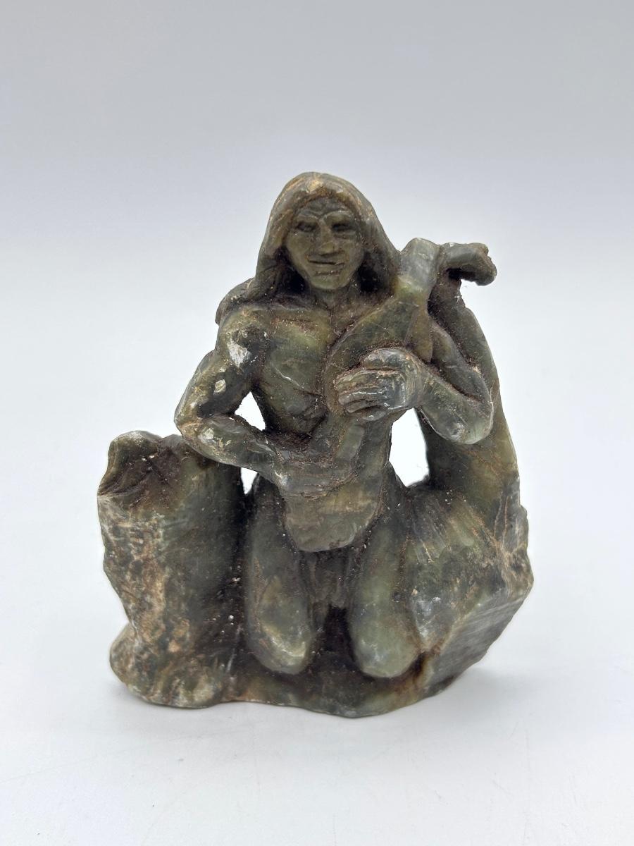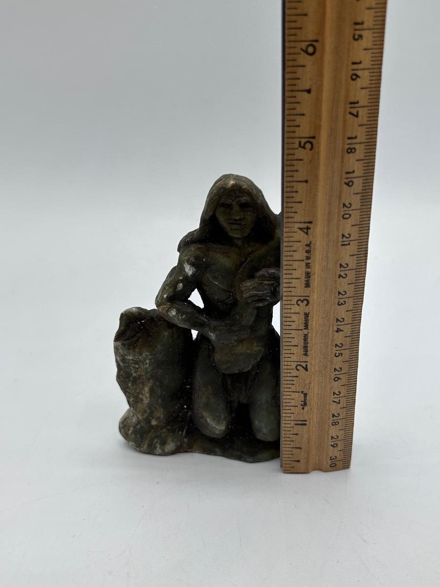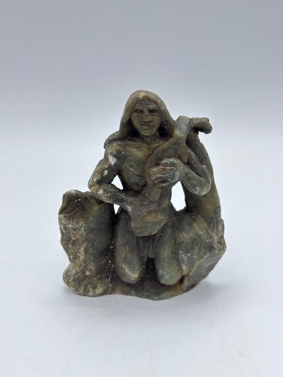 Vintage Hand Carved Stone Person Kneeling with Instrument. Image search comes back with a lot of Inuit stone sculptures and carving. In good condition. Under 5" size.