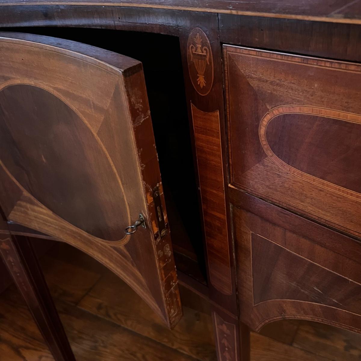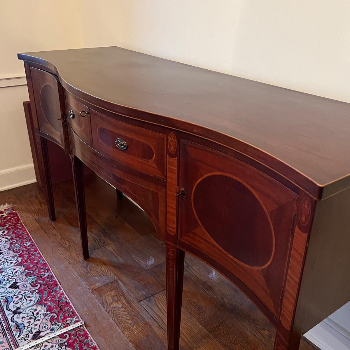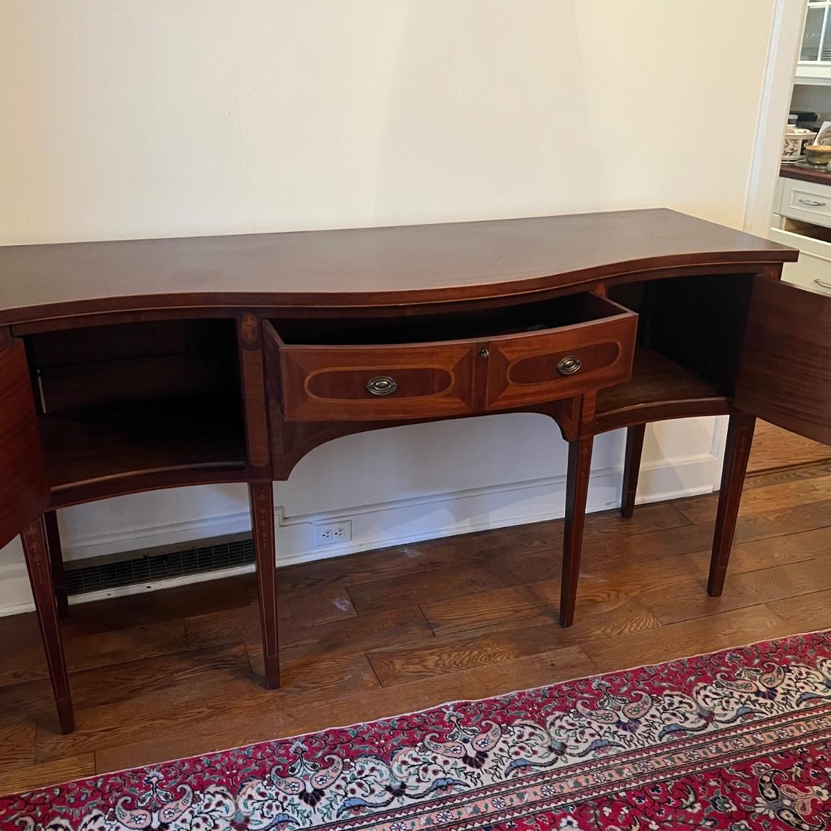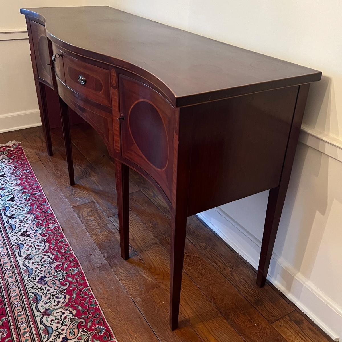 This elegant large solid wood sideboard has all of its three keys. It features inlaid wood with a bellflower chain design on its tapered legs. One large dovetailed drawer in the center is flanked by two cabinets; note the lock on the left side door is stuck shut so the door will not fully close, assume some oil might release it. One light ring mark on top surface is shown in an image.
