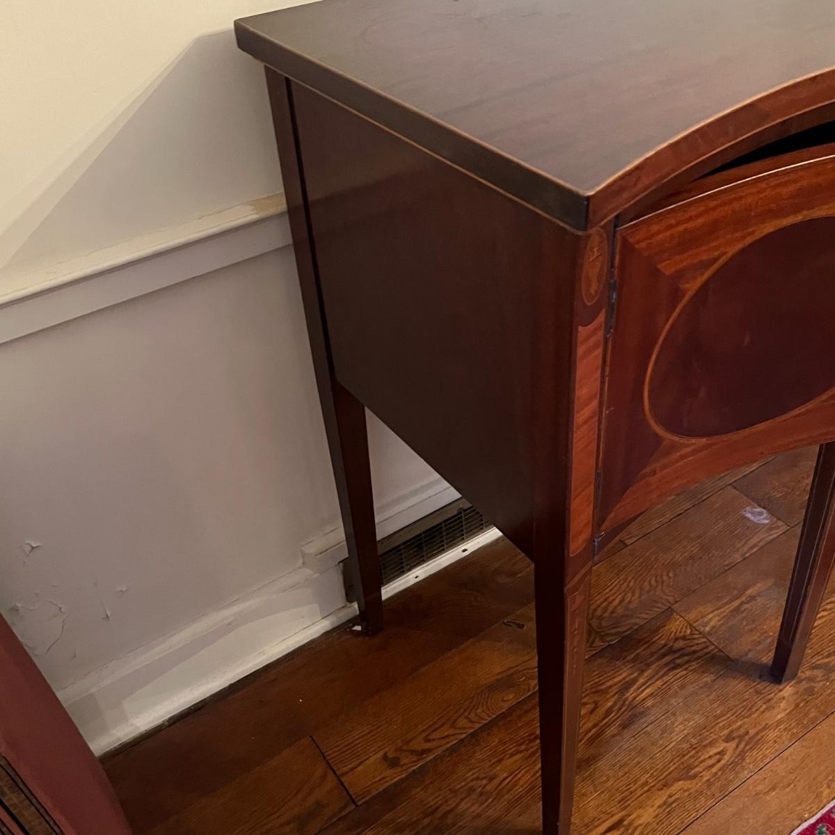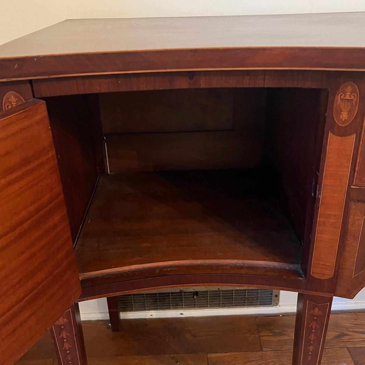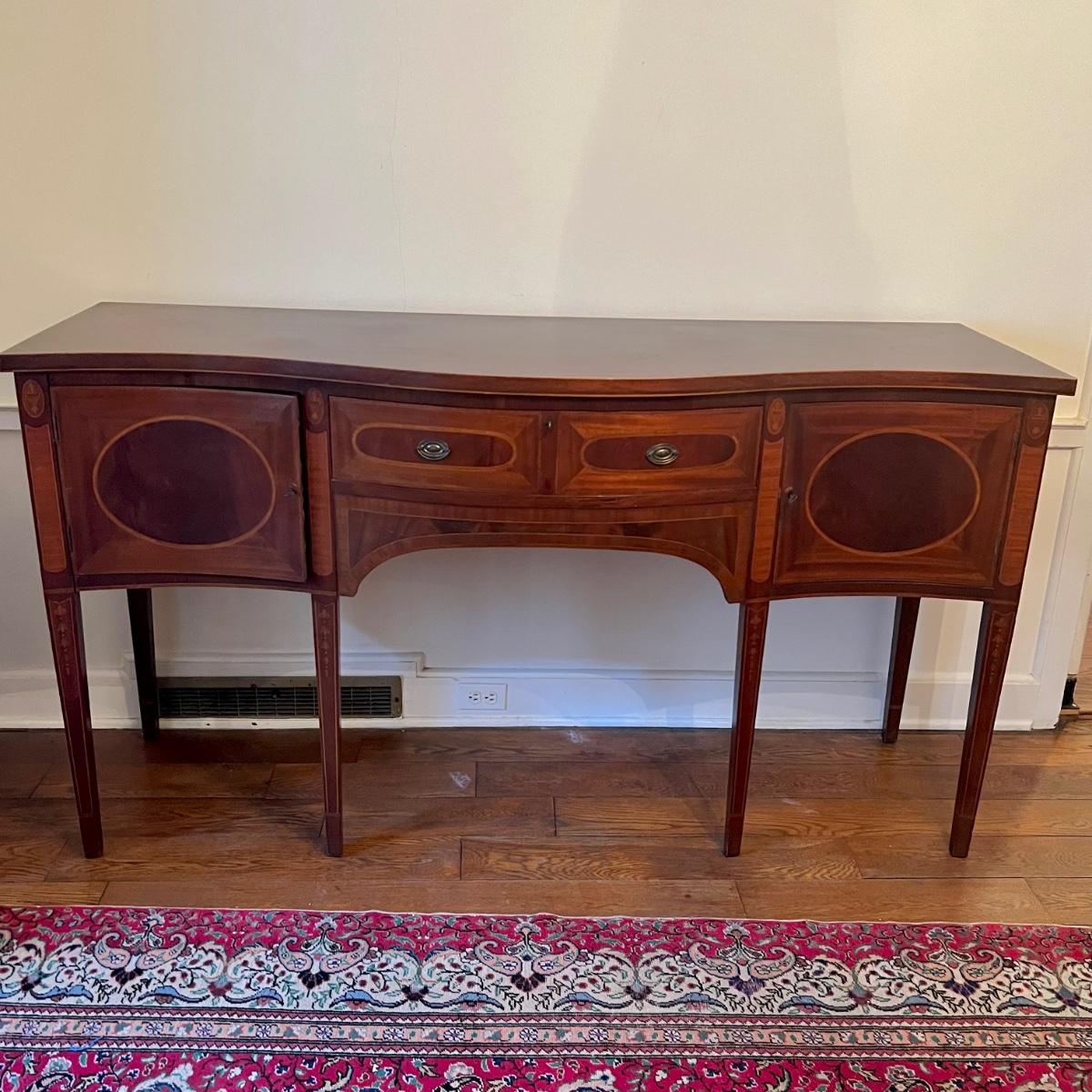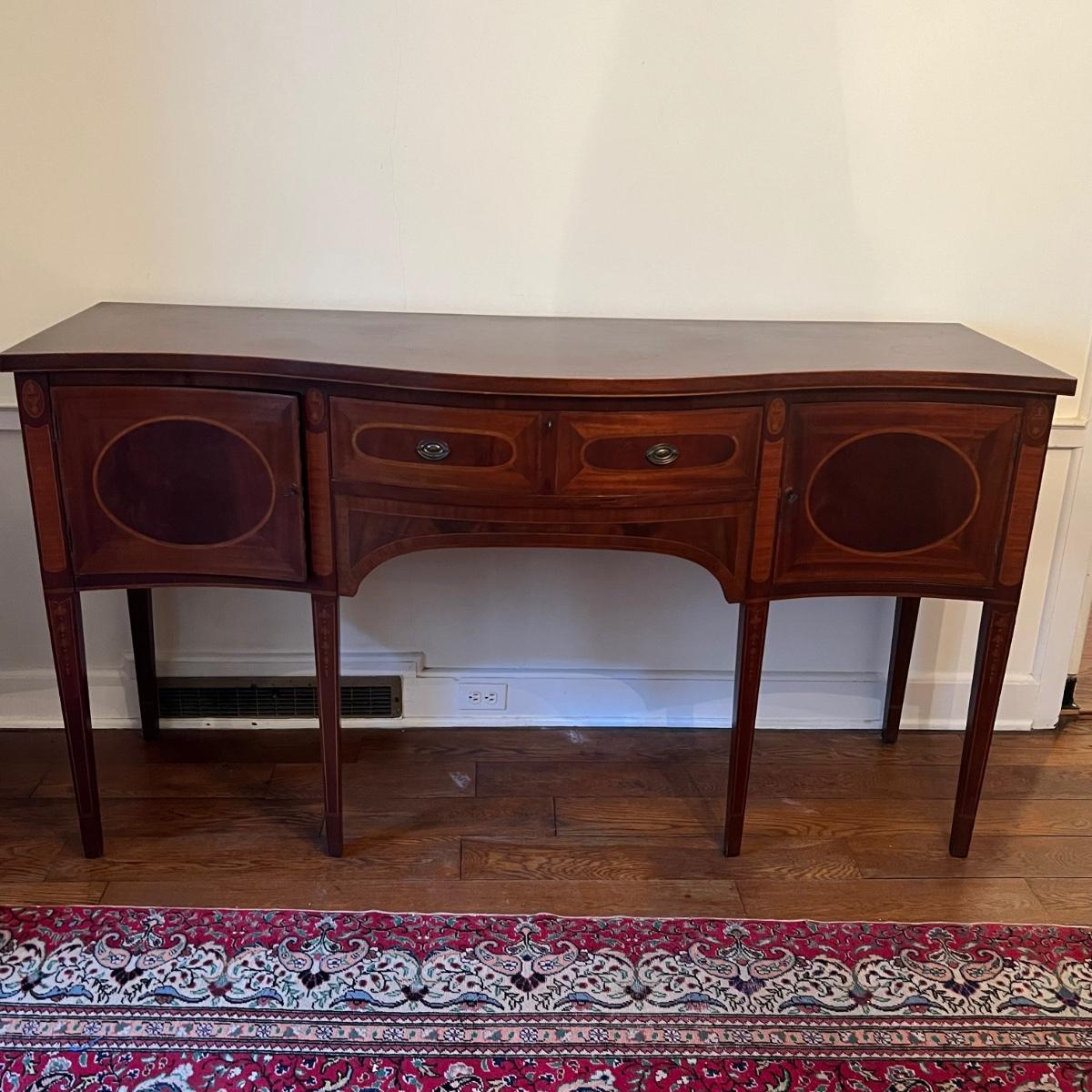 This elegant large solid wood sideboard has all of its three keys. It features inlaid wood with a bellflower chain design on its tapered legs. One large dovetailed drawer in the center is flanked by two cabinets; note the lock on the left side door is stuck shut so the door will not fully close, assume some oil might release it. One light ring mark on top surface is shown in an image.