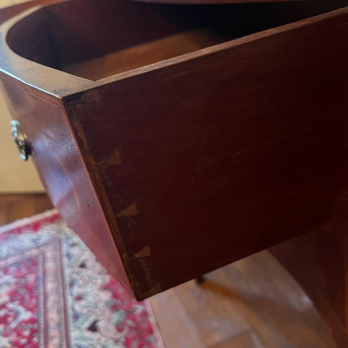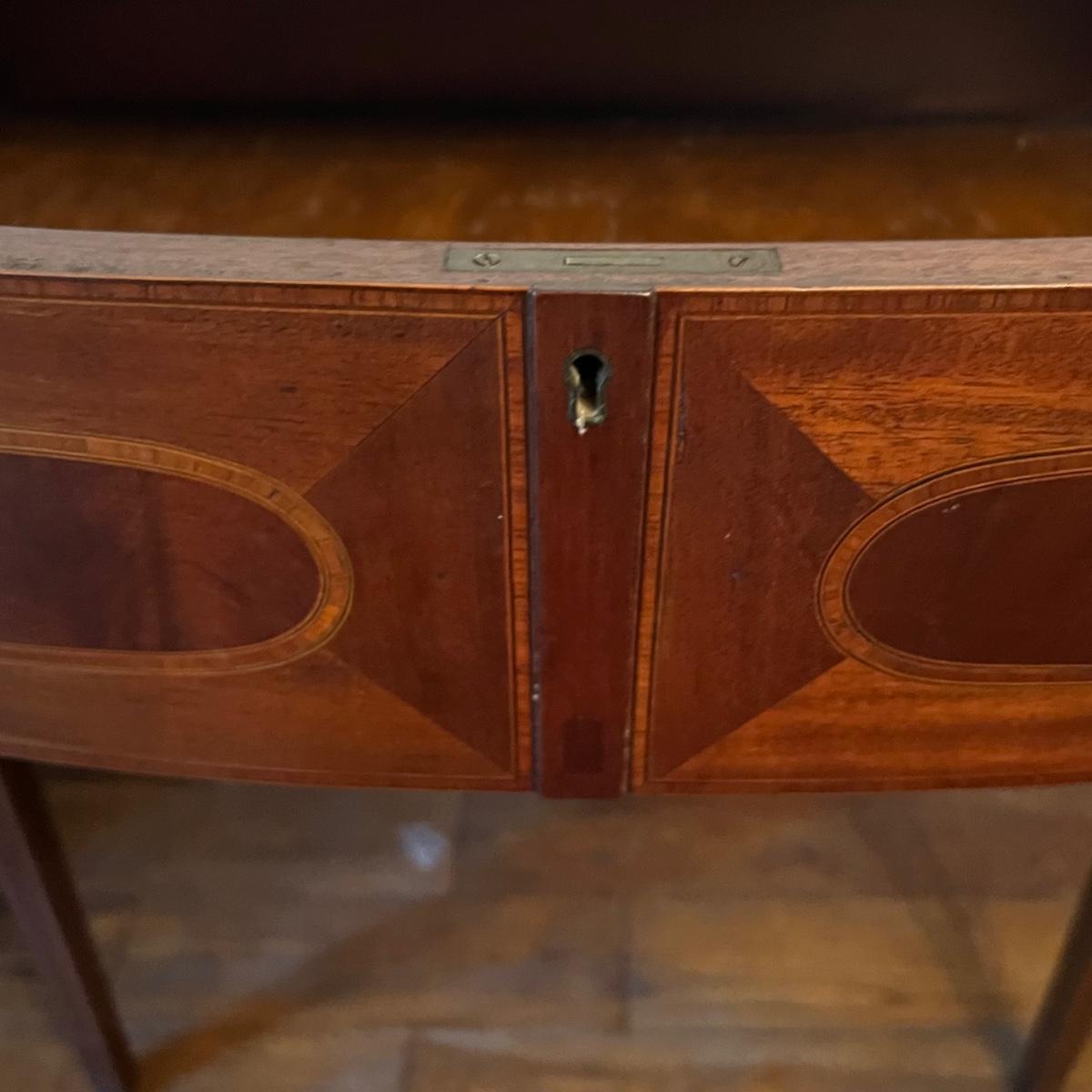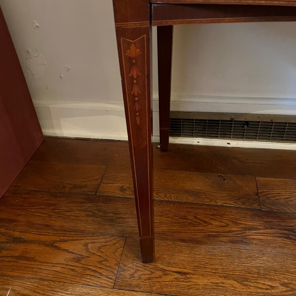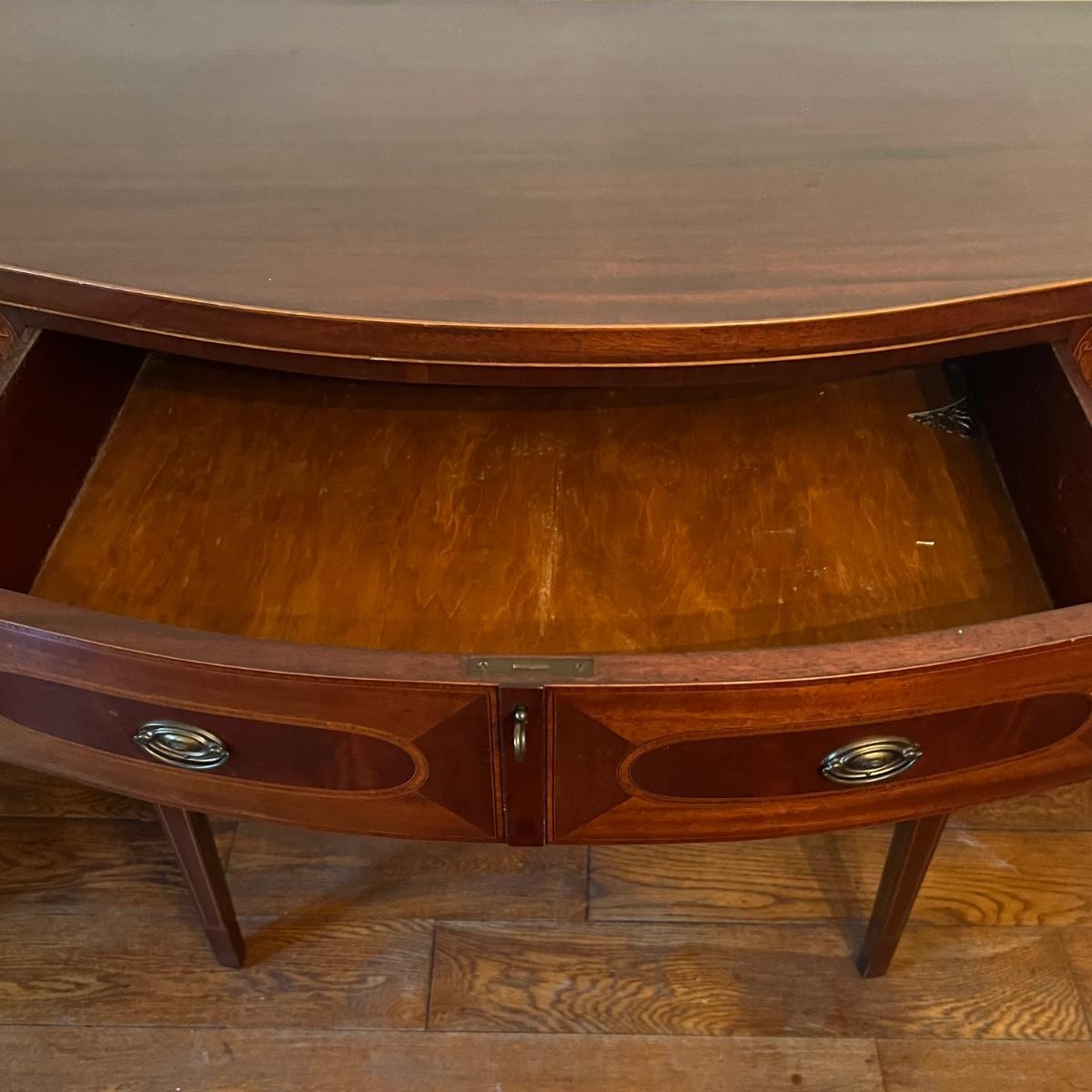 This elegant large solid wood sideboard has all of its three keys. It features inlaid wood with a bellflower chain design on its tapered legs. One large dovetailed drawer in the center is flanked by two cabinets; note the lock on the left side door is stuck shut so the door will not fully close, assume some oil might release it. One light ring mark on top surface is shown in an image.