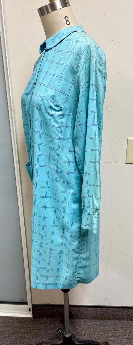 In good condition, but there is some discoloration on fold lines from storage. Measures: 21" across chest, 37" long, 22" sleeve. Our mannequin is a size 8 for reference.