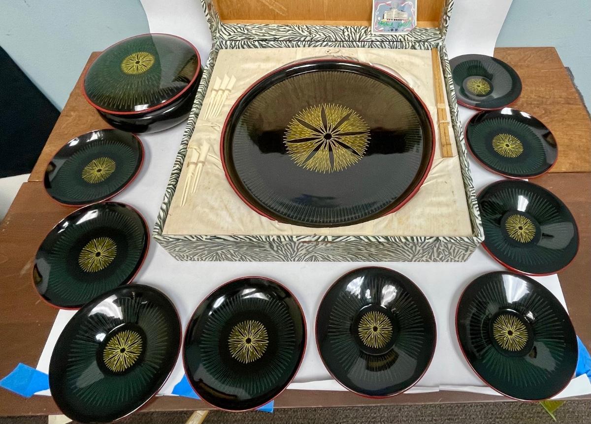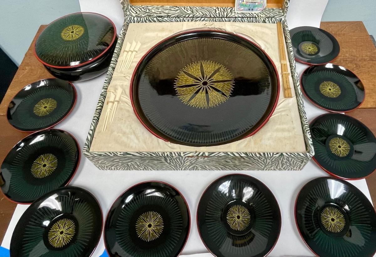 Black & gold Laquer Ware Set in wood storage box Japanese