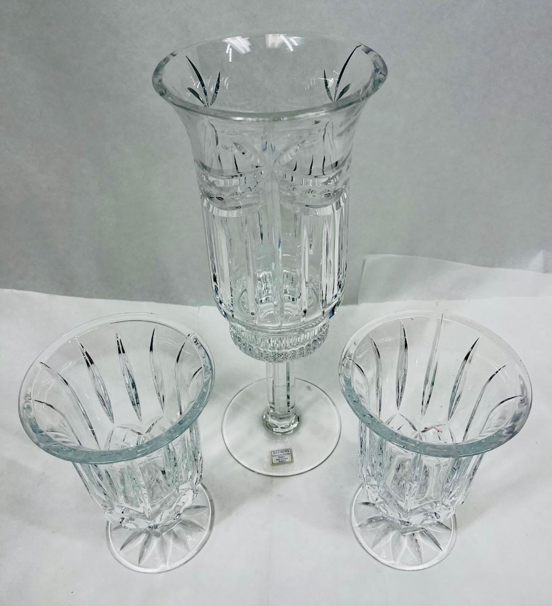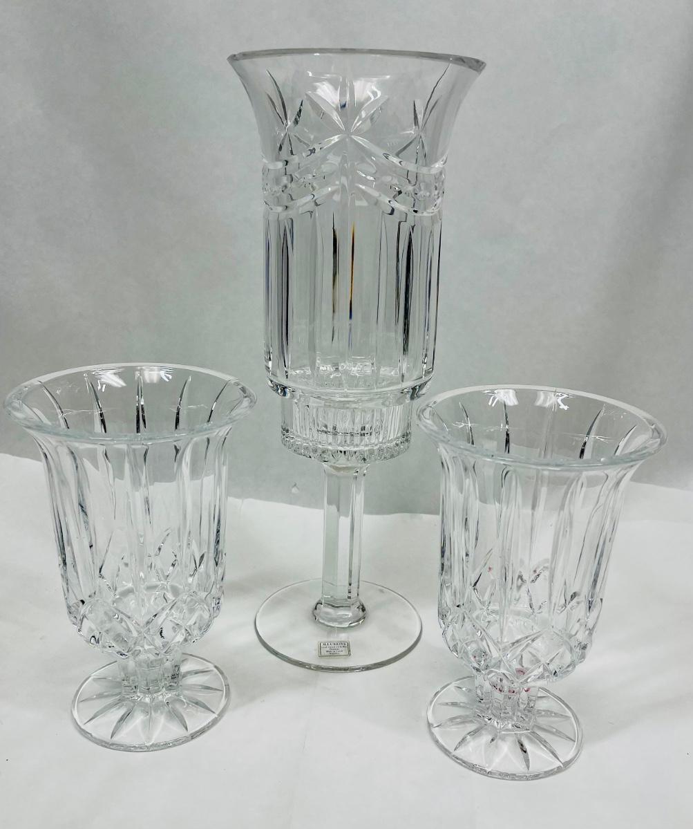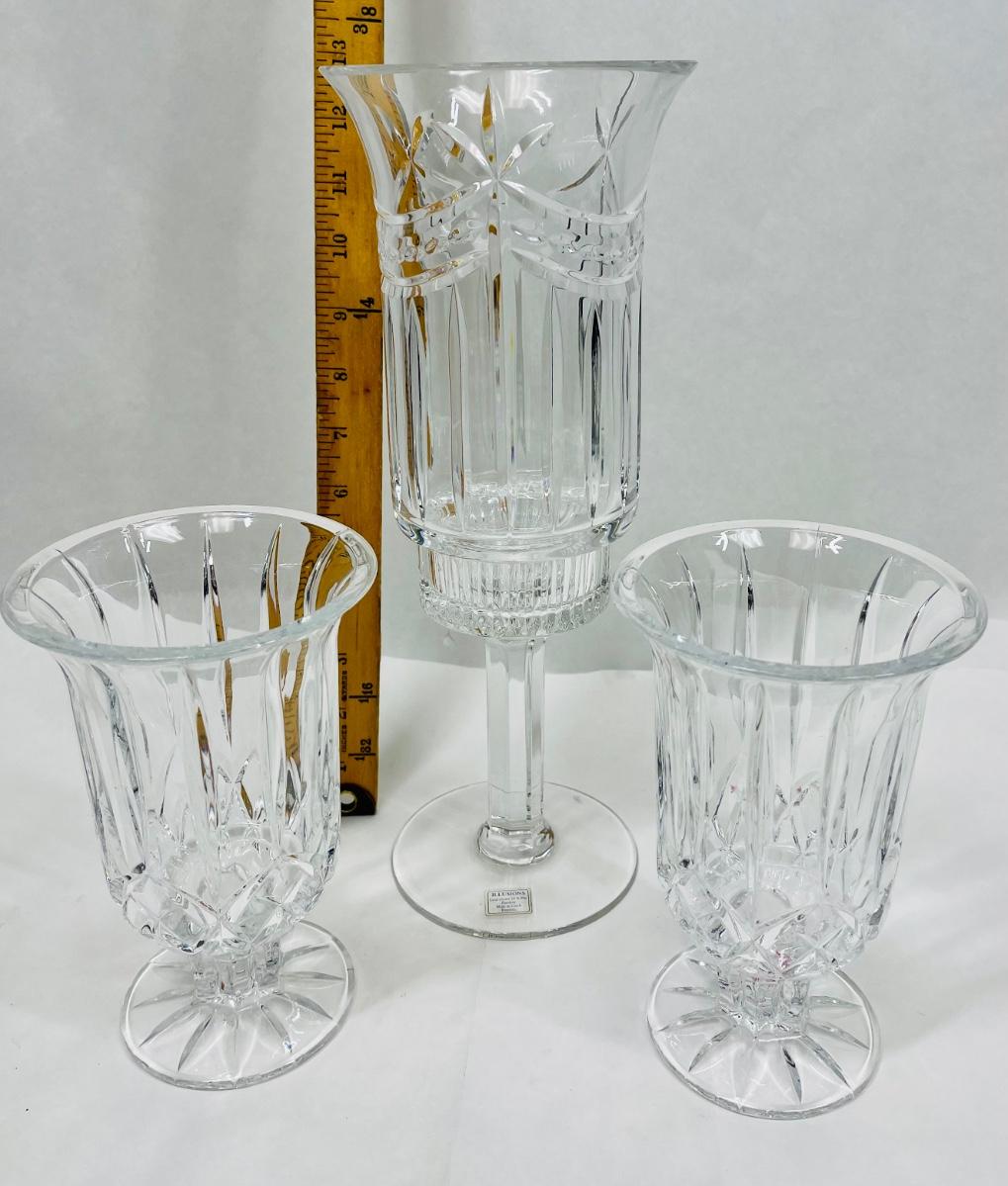 3 glass crystal candle holders. The tall one is made of 2 pieces and is 24% lead crystal, the other two do not have any stickers.