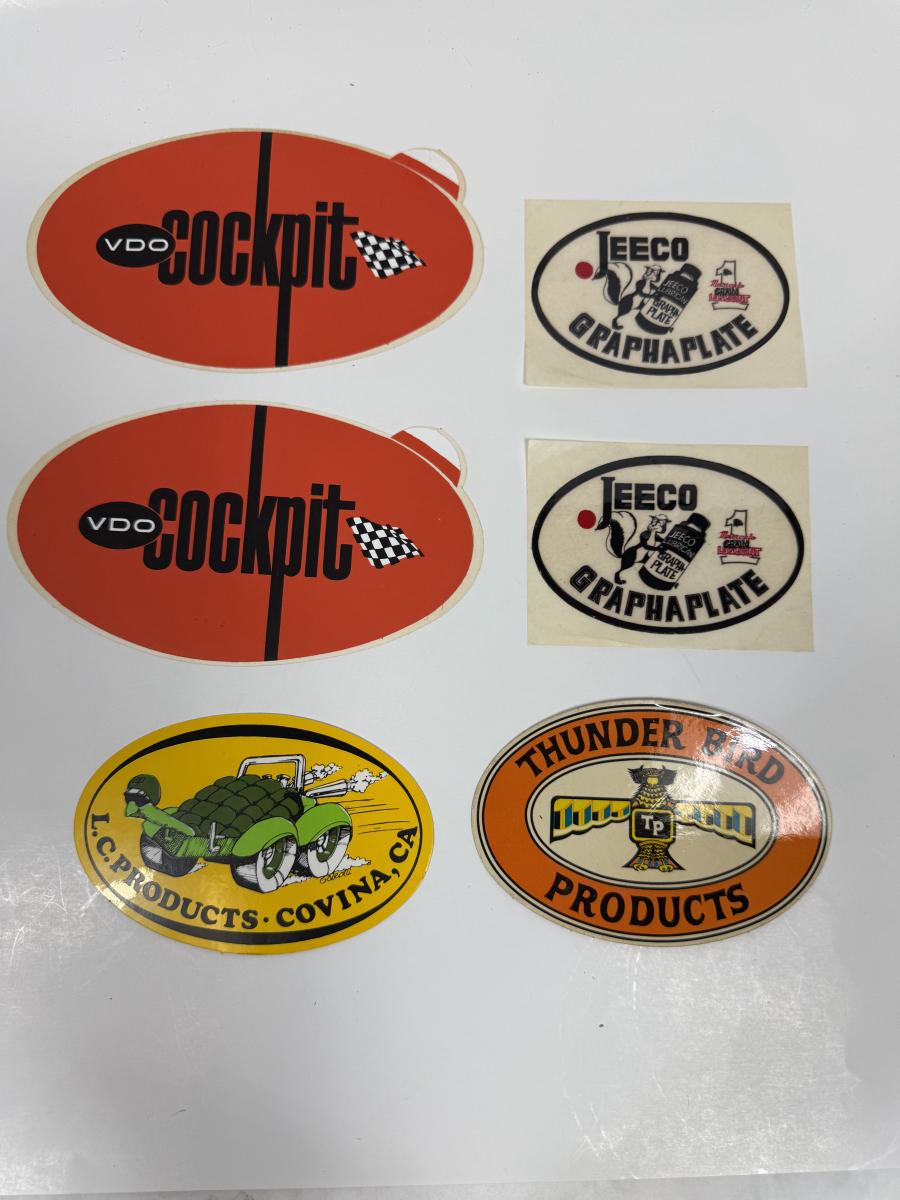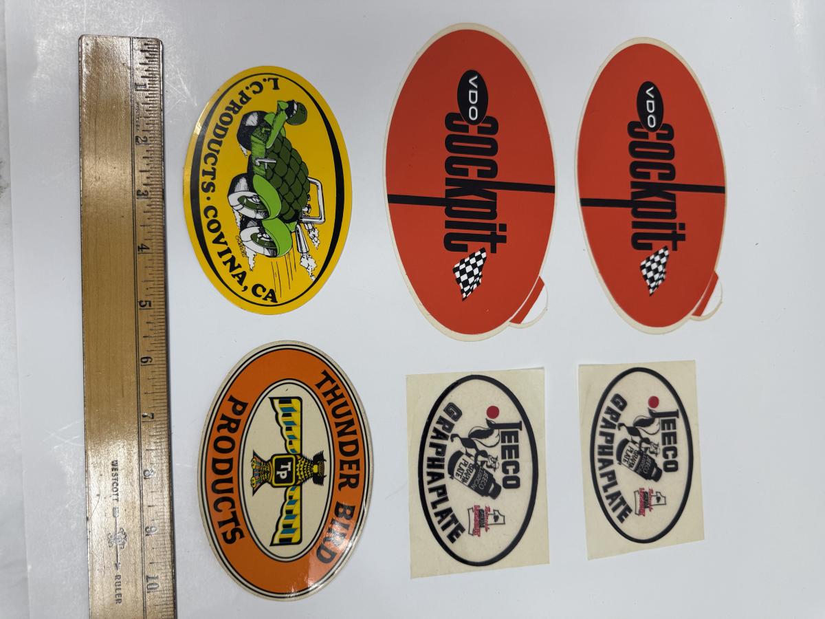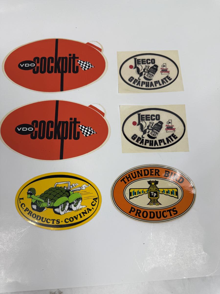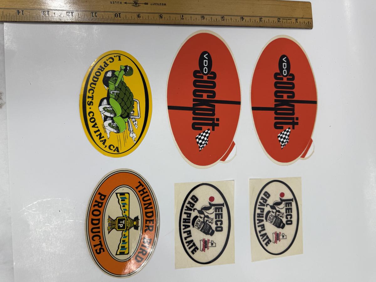 6-sticker lot includes: VDO Cockpit, Jeeco Graphaplate, L.C. Products and Thunderbird Products