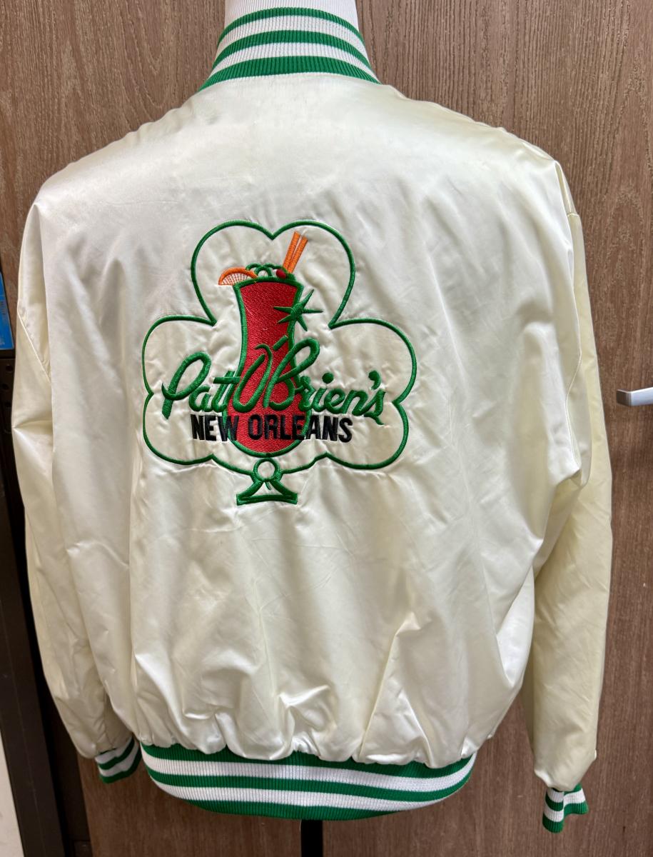 Vintage 80's Embroidered Satin Varsity Jacket size XL made in USA Pat O'Brien's New Orleans Louisiana cream with green trim