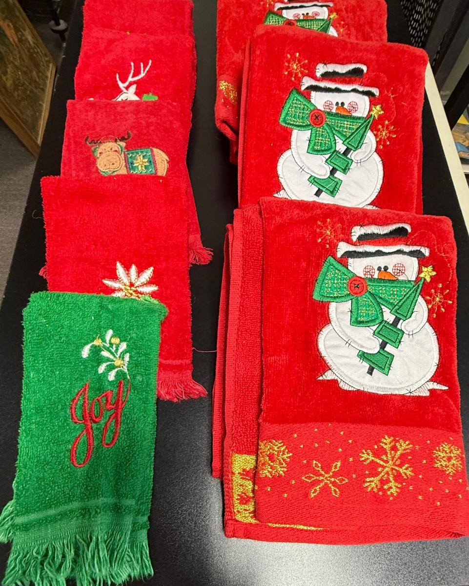 Red and green, with embroidery of snowmen, reindeer, snowflakes, and more. Great condition.