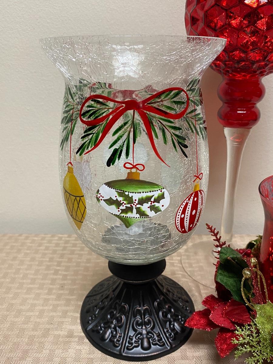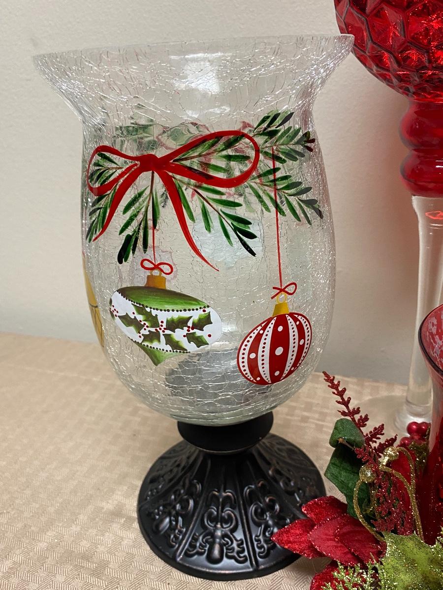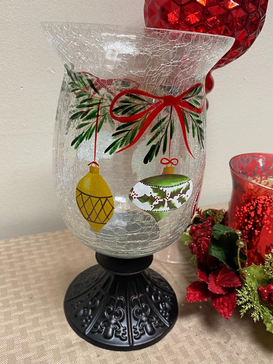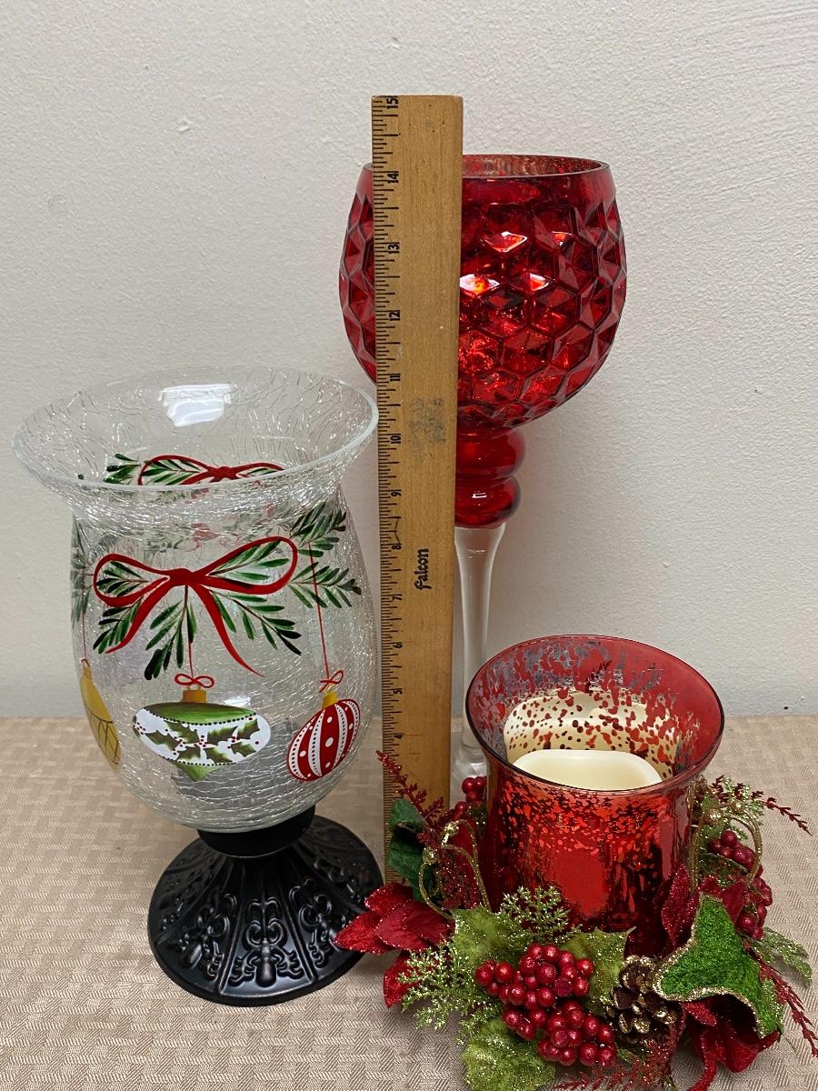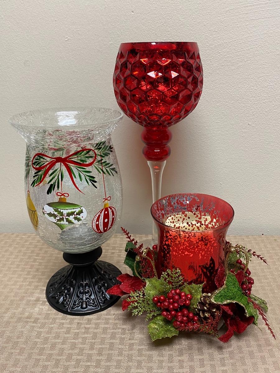 Miscellaneous Christmas Holiday Candle Holders Hurricane Lamp. Ornaments look hand painted on the one holder. All are in good condition, no chips.