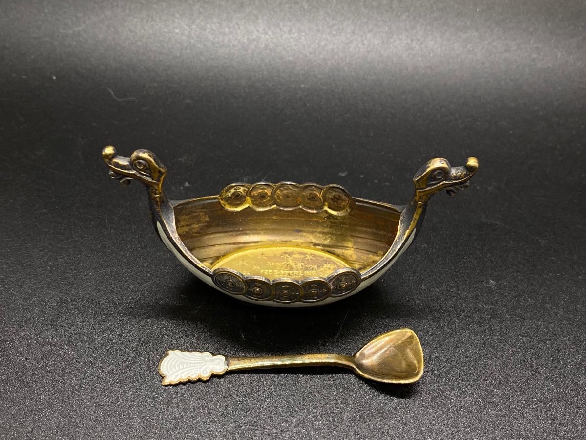 Vintage 925 Sterling Silver & Enamel Viking Dragon Boat Salt Cellar w/ Spoon. Made in Norway. In good condition, needs to be cleaned. Both pieces are marked. About 3" length.