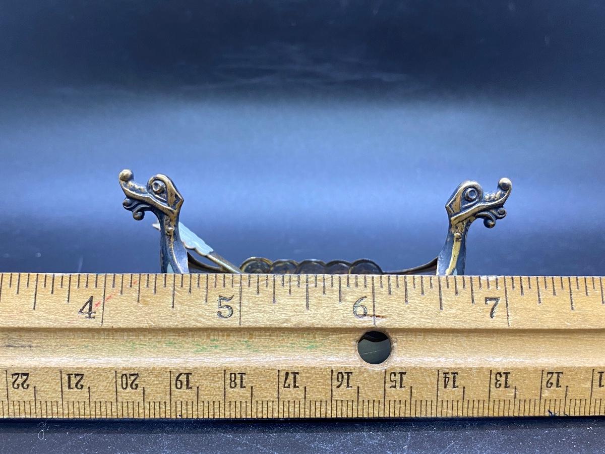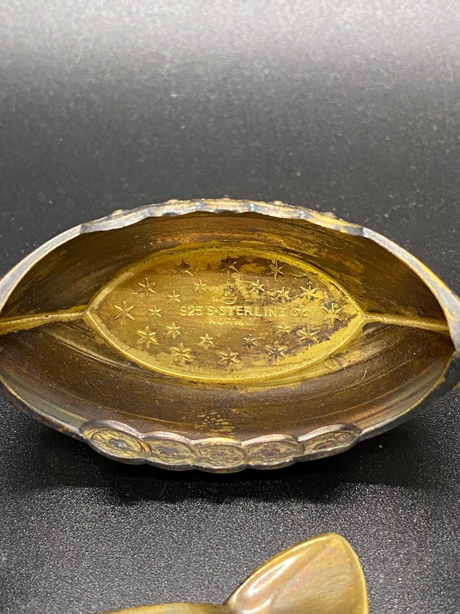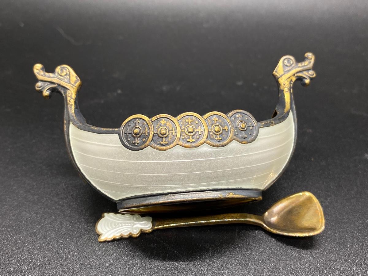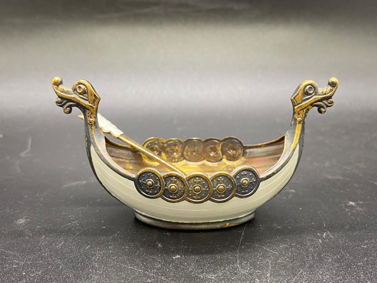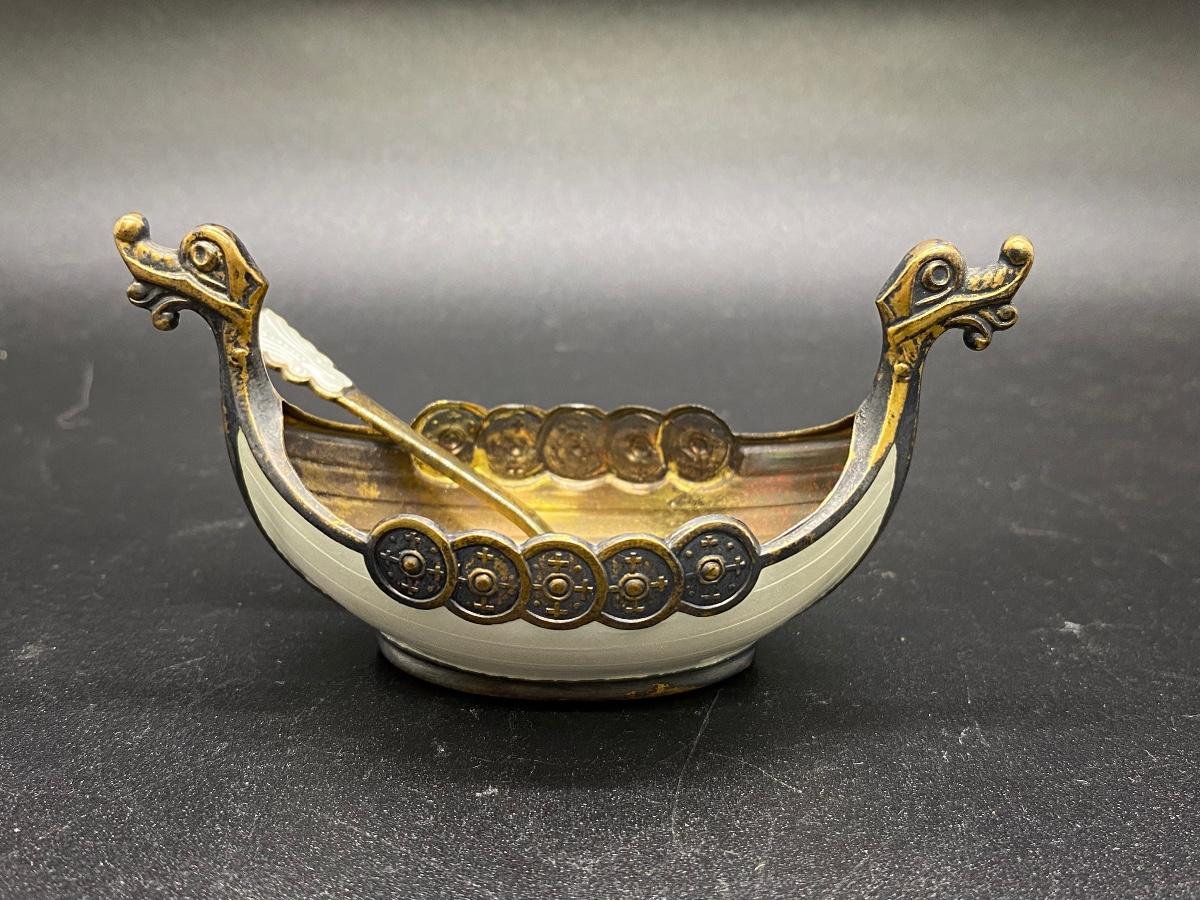 Vintage 925 Sterling Silver & Enamel Viking Dragon Boat Salt Cellar w Spoon Norway