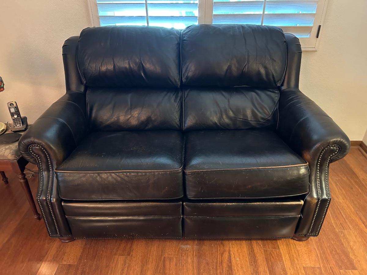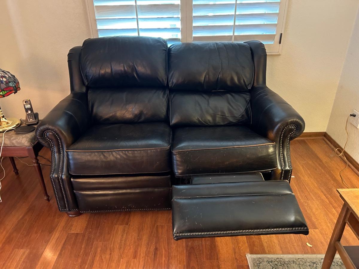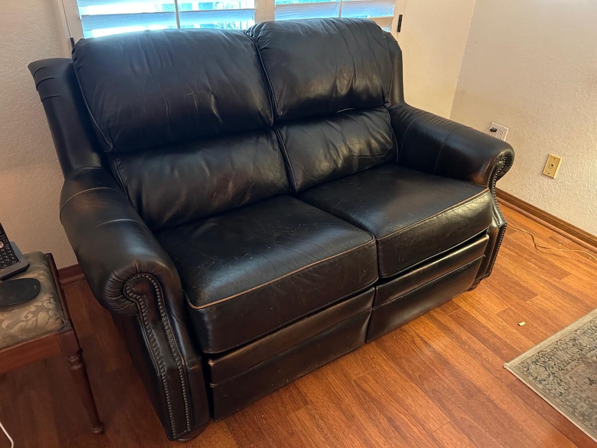 Black Two-Seater Recliner Couch Sofa Love Seat. In used condition. Only one side works.