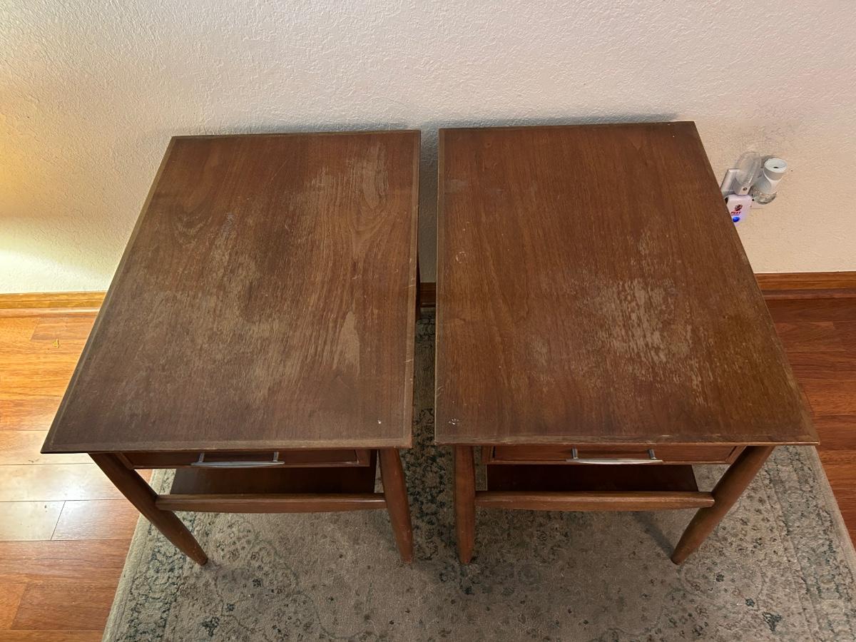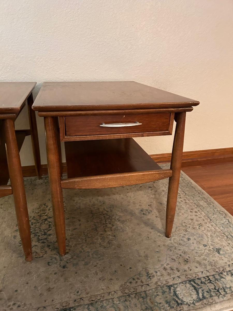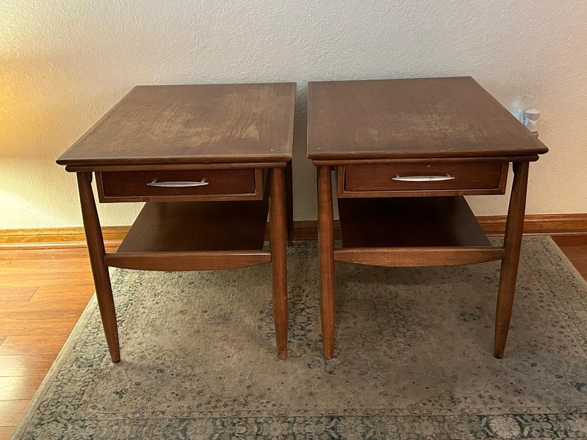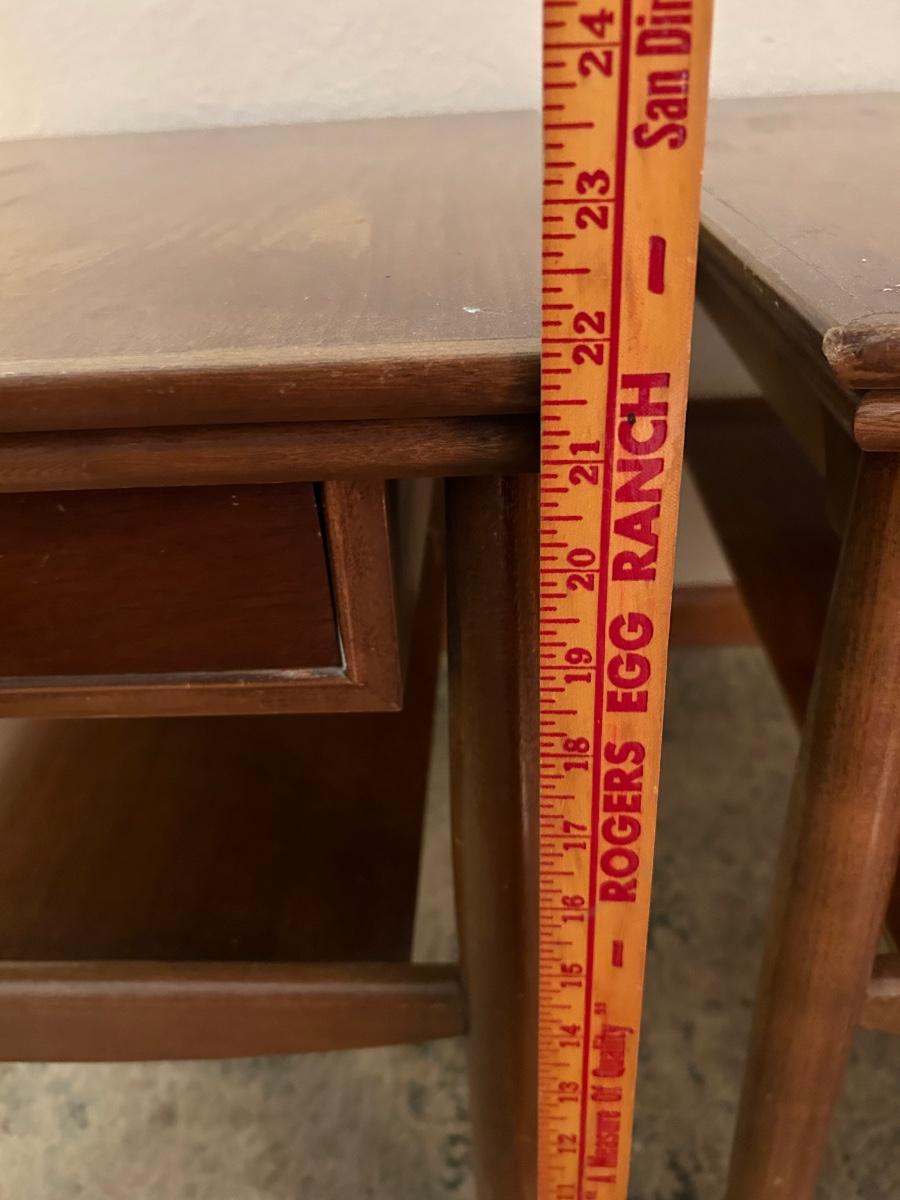 Pair of MCM Vintage Midcentury Modern Two-Tier Single Drawer Wood End Side Tables Unbranded. No maker name found. In used condition. Sturdy but have surface wear.