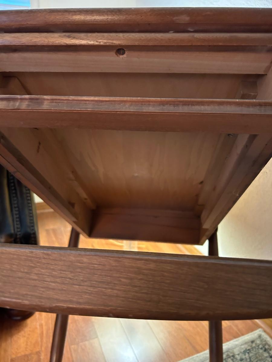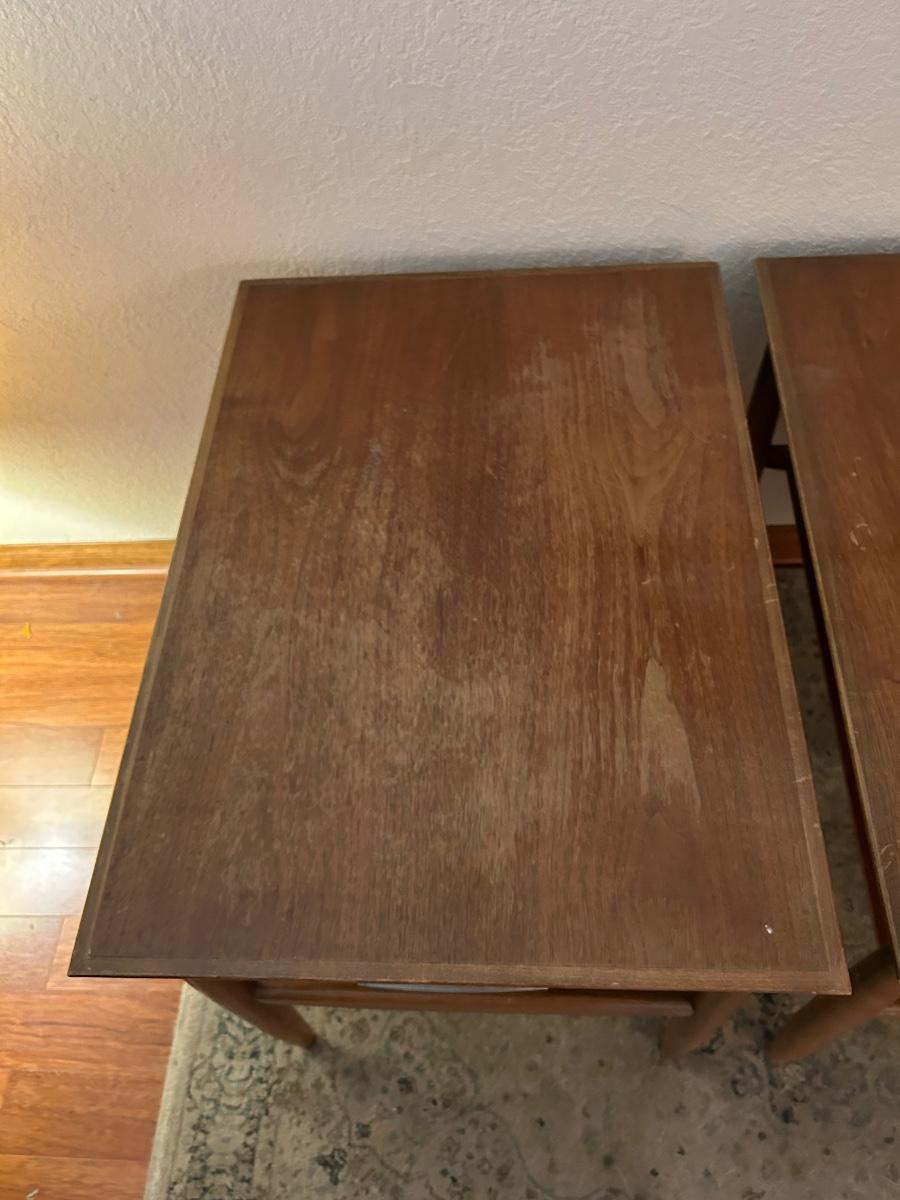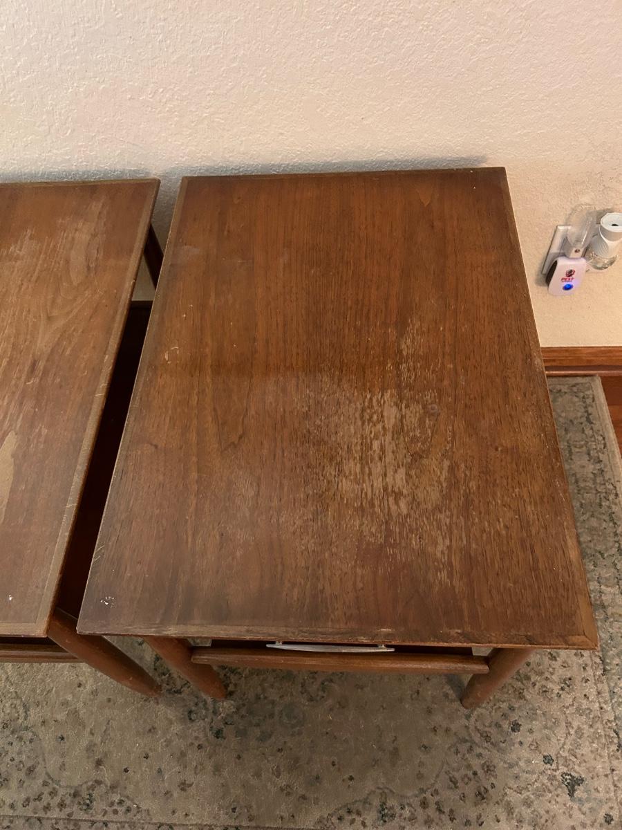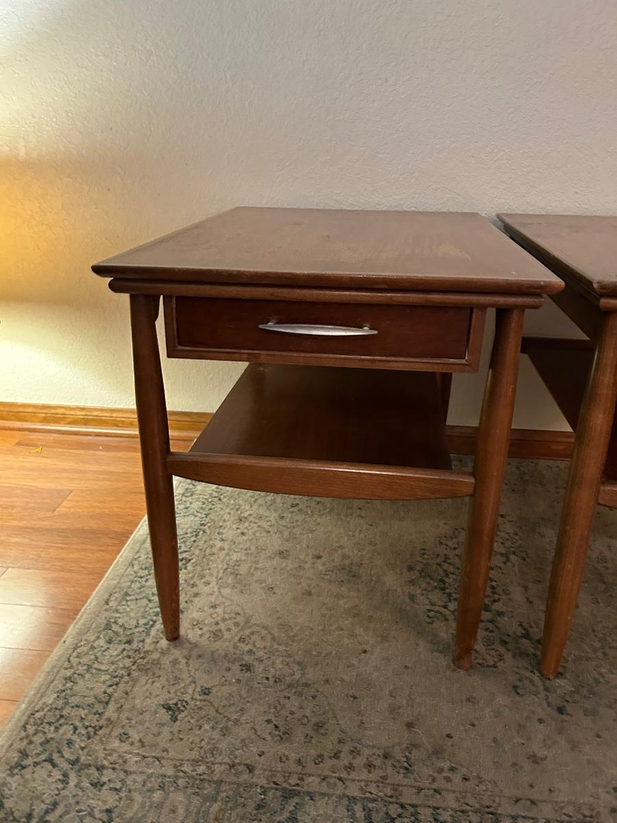 Pair of MCM Vintage Midcentury Modern Two-Tier Single Drawer Wood End Side Tables Unbranded. No maker name found. In used condition. Sturdy but have surface wear.