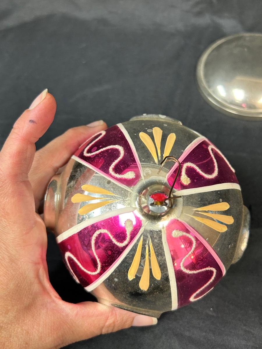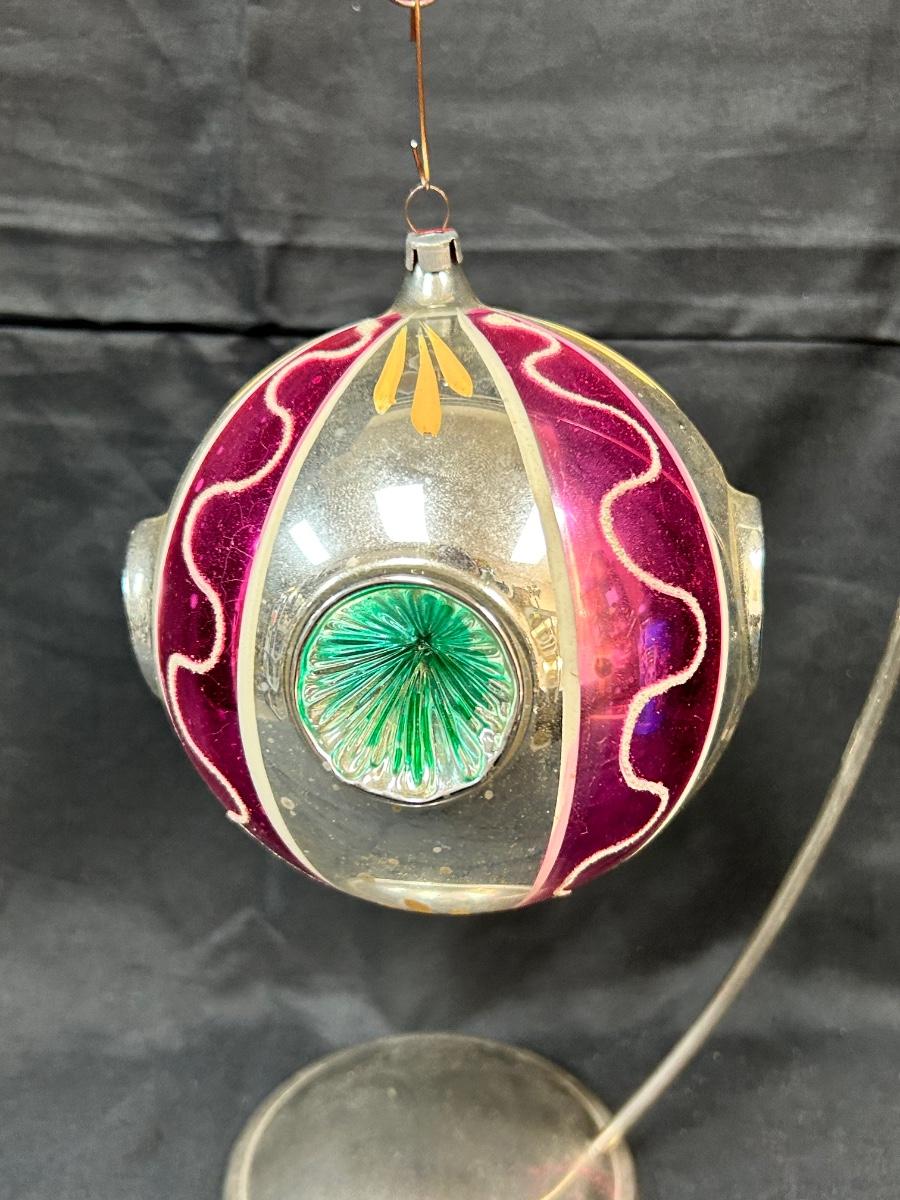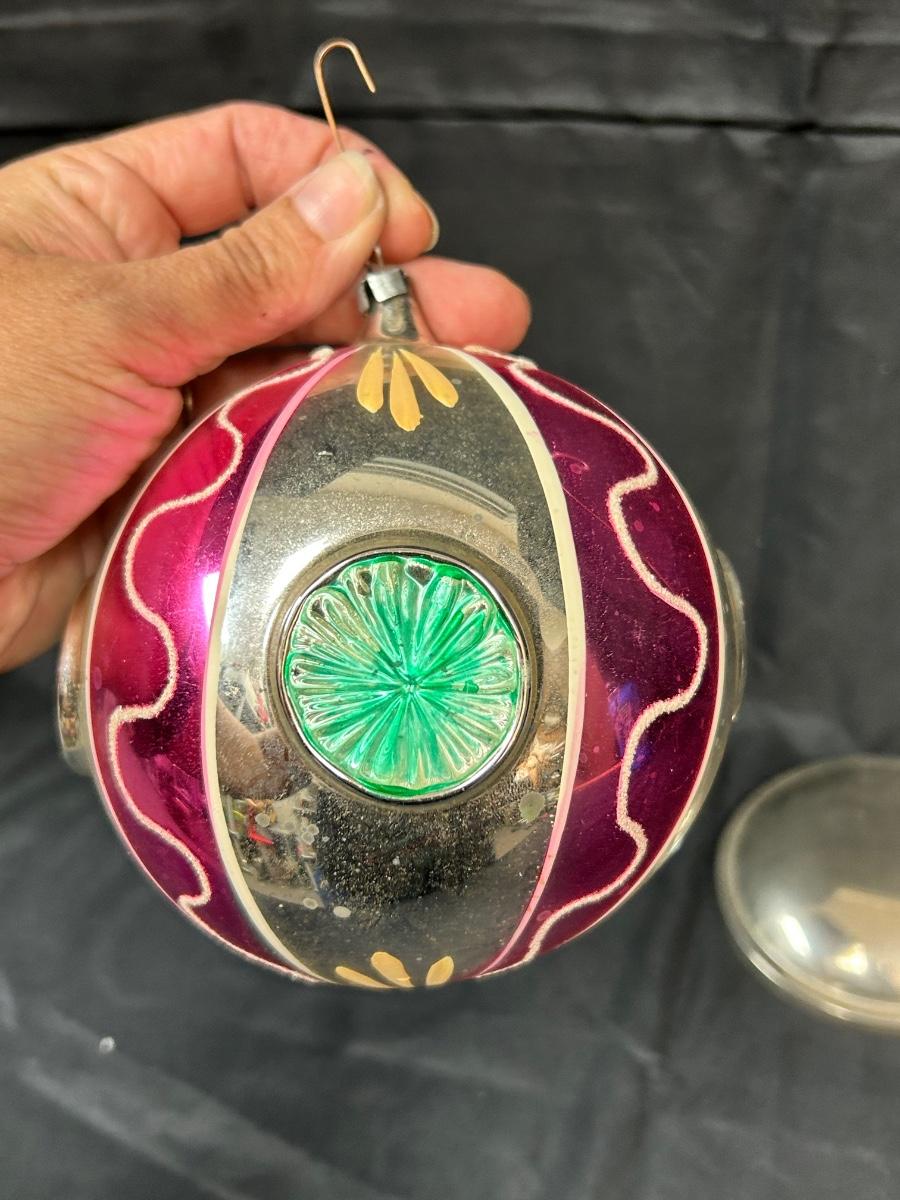 Large Vintage Blown Glass Christmas Holiday Tree Ornament Silver Pink Green. In good vintage condition. About 5" size.