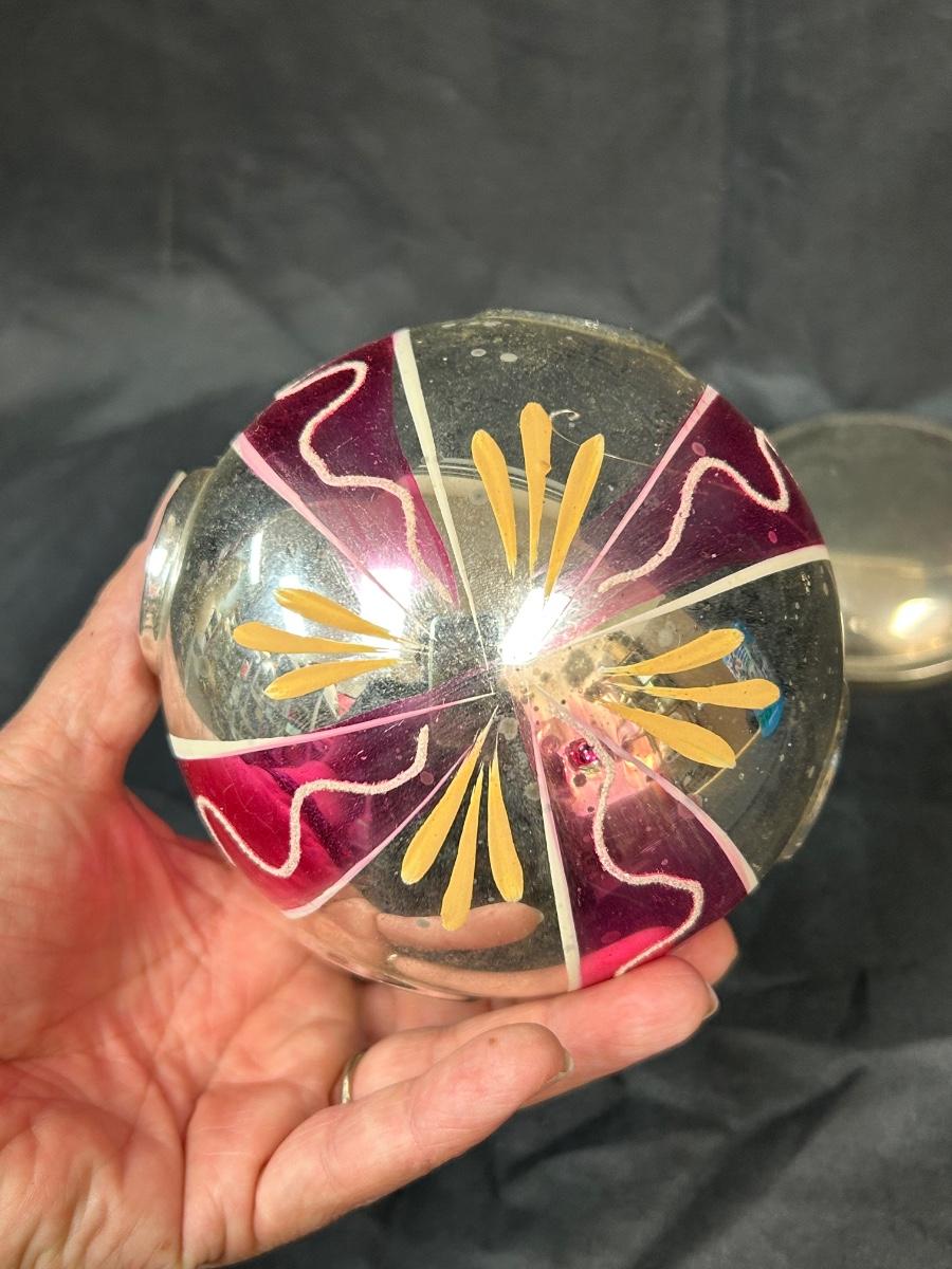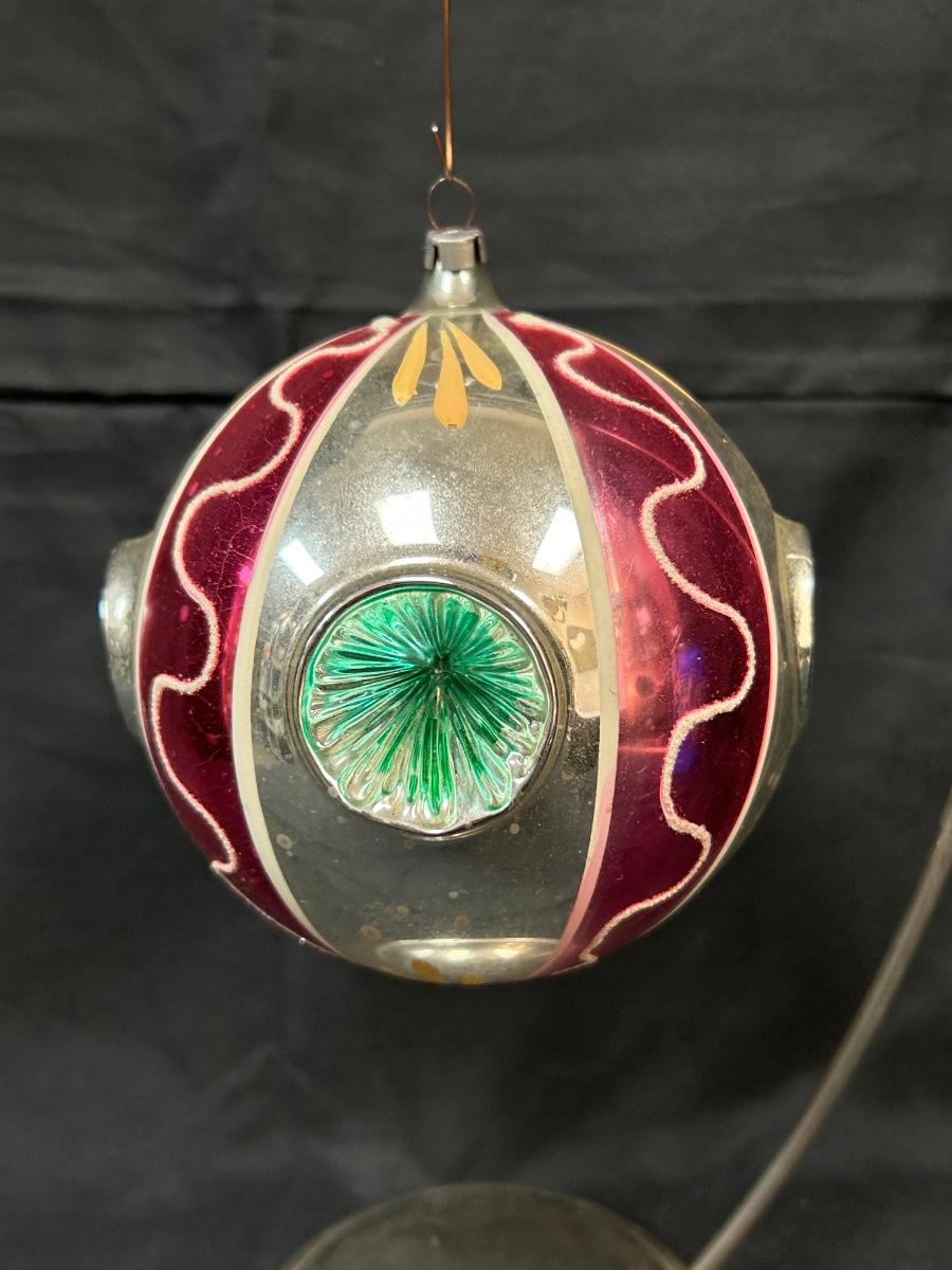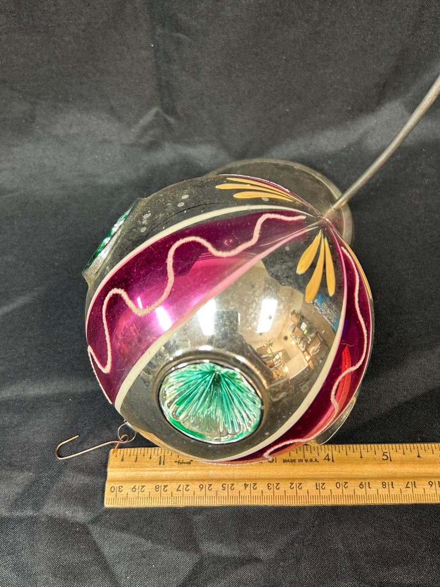 Large Vintage Blown Glass Christmas Holiday Tree Ornament Silver Pink Green. In good vintage condition. About 5" size.