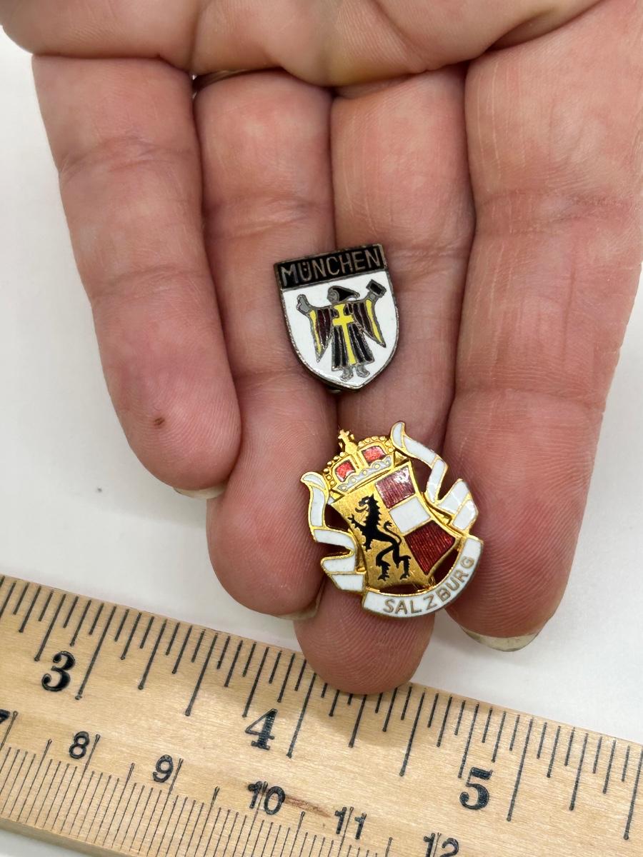 Vintage European Munchen Salzburg Valeur Inbenuite Enamel Lapel Pins. in good vintage condition. Probably bought on vacation as souvenirs.