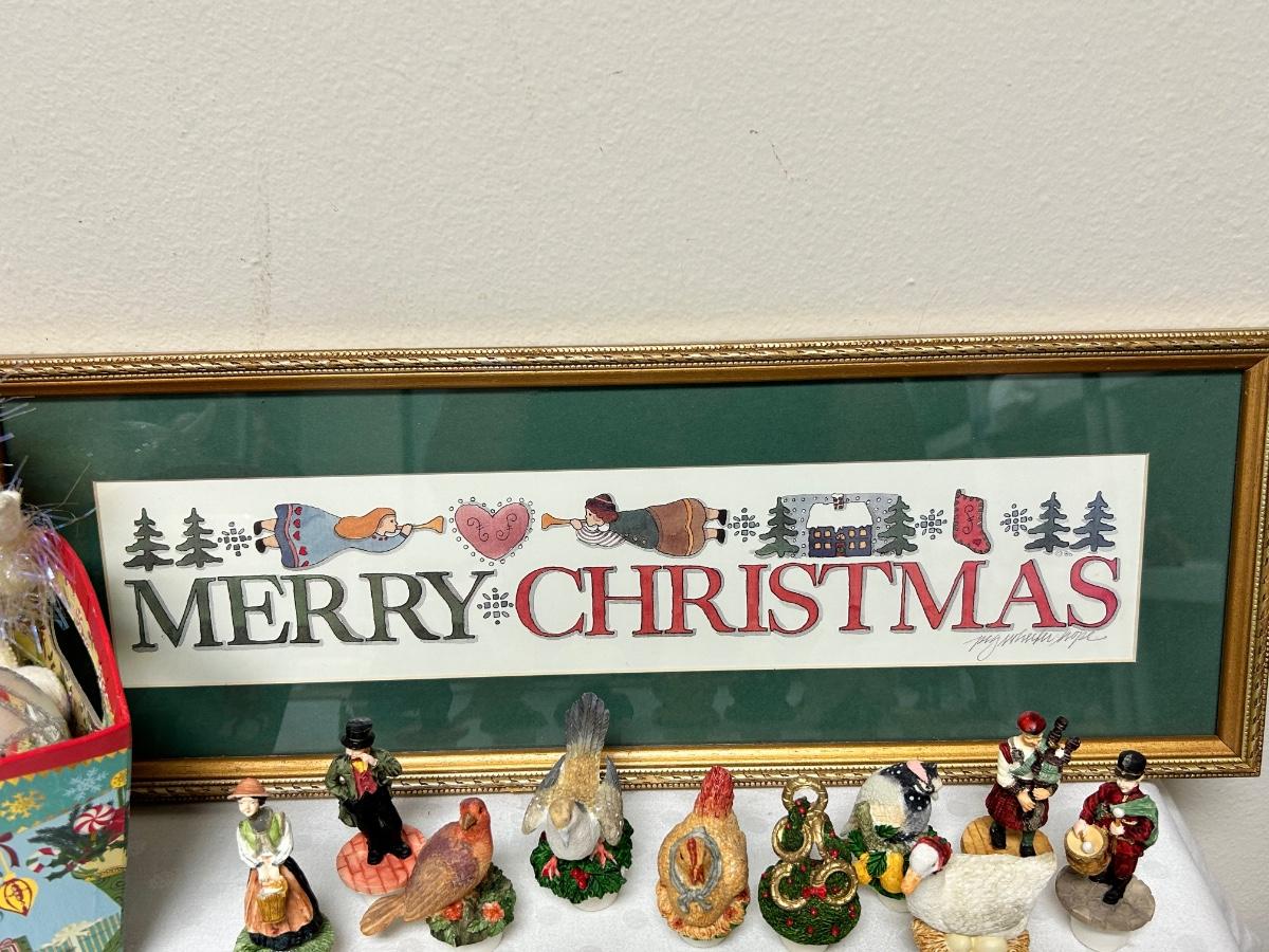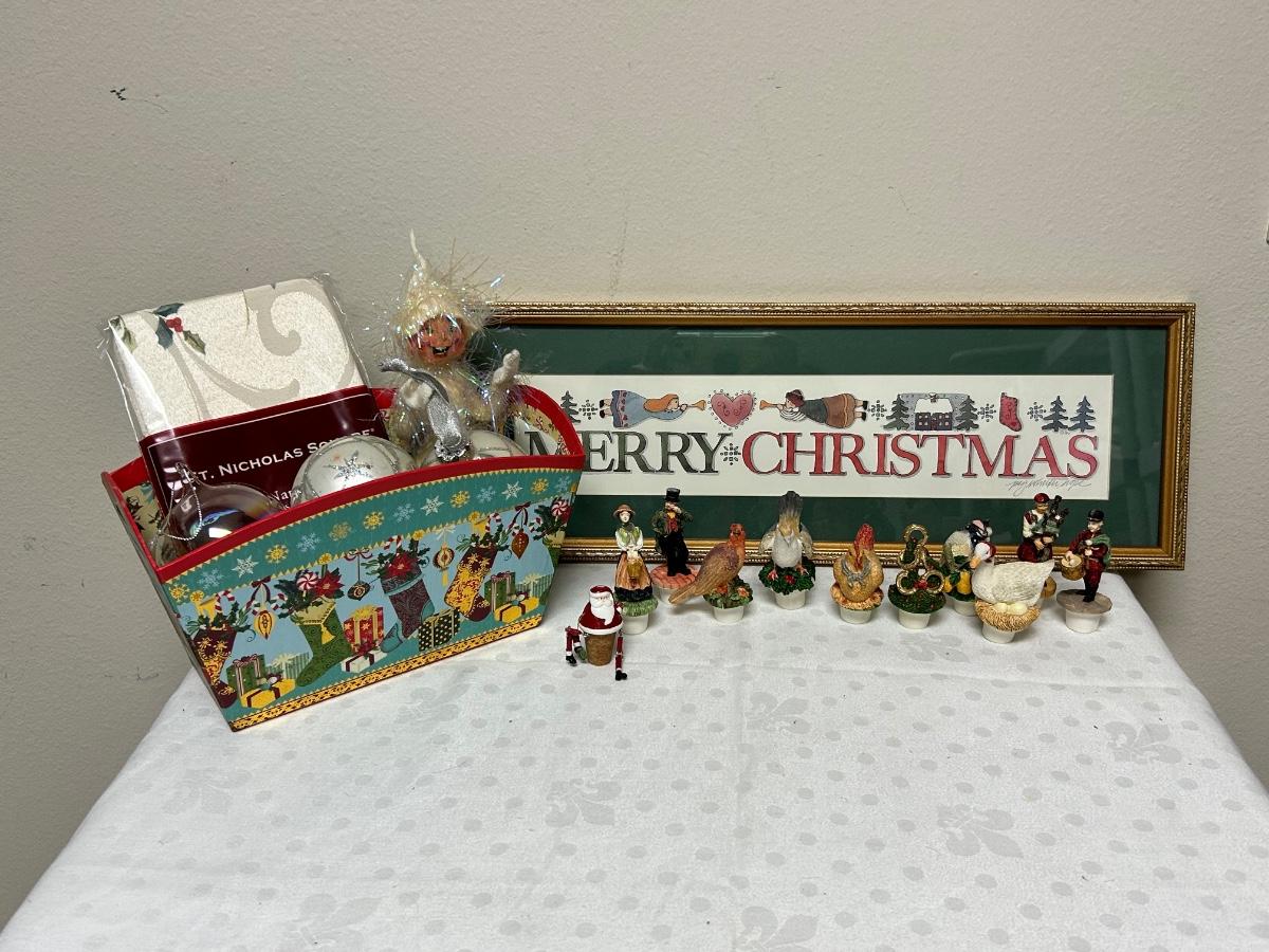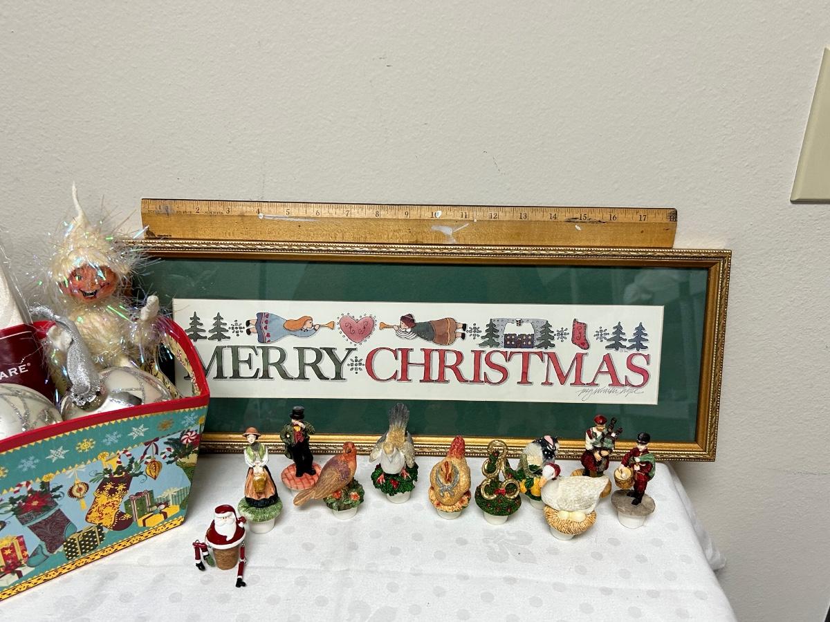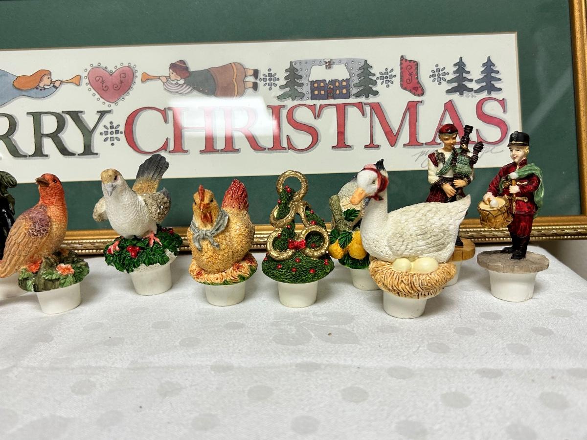 Mixed Christmas Holiday Decor Lot Wall Art Anna Lee Elf Wine Stoppers. In good condition. Various 12 Days of Christmas wine stoppers. Wall art is about 20" length.