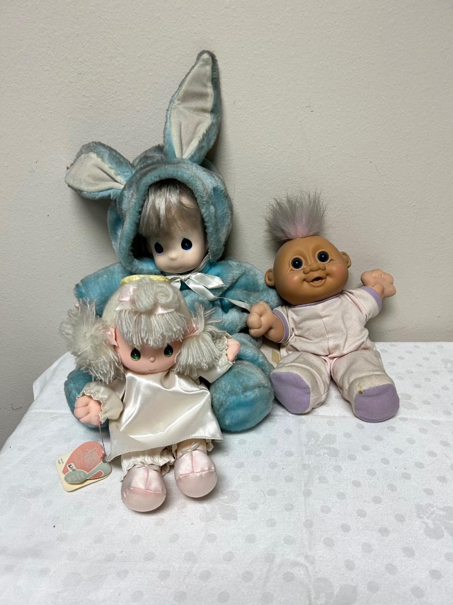 Lot of Three Vinyl Plush Baby Dolls Troll Precious Moments. In previously displayed condition. A bit discolored from dust, in need of TLC.