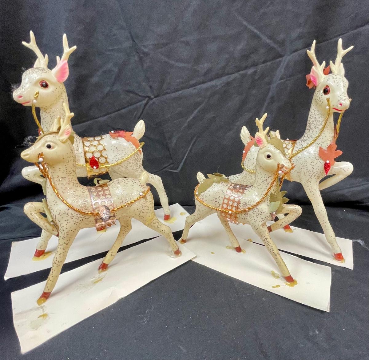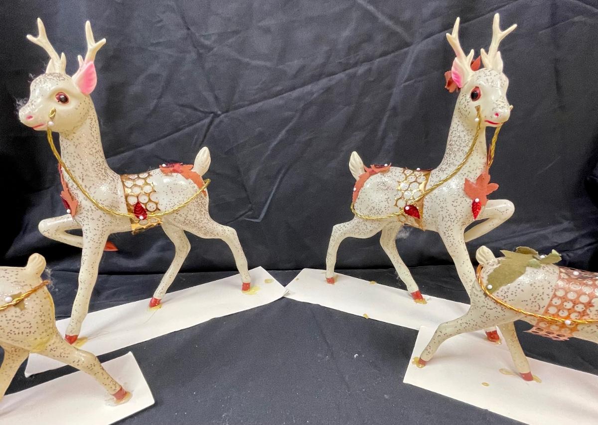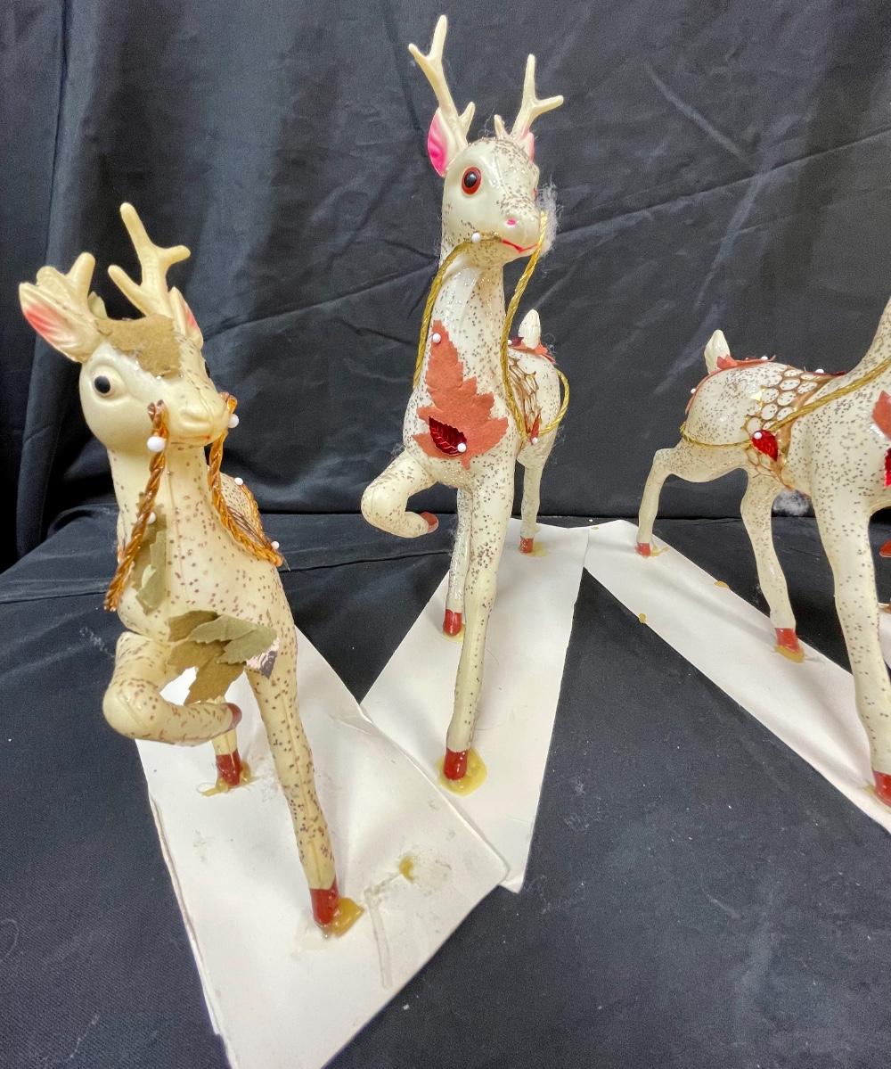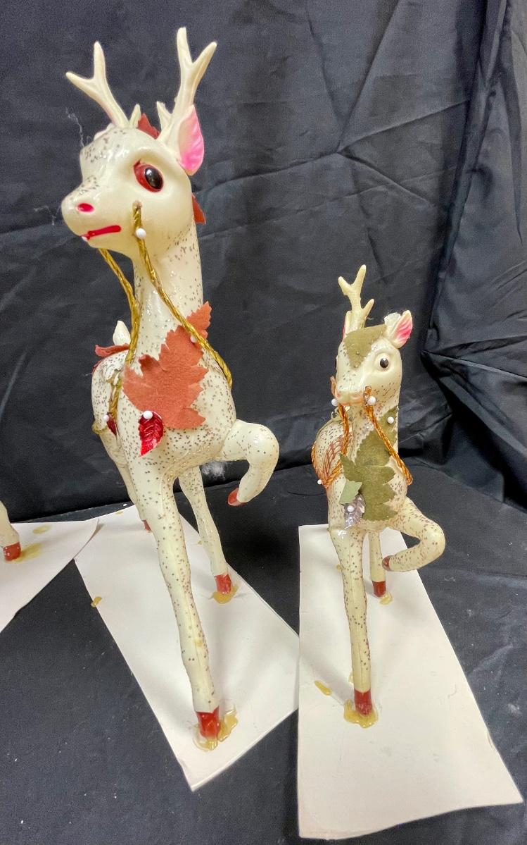 These appear to be a blow-mold type plastic that has been decorated with glitter and other adornments. They are glued to stiff paper. One of the smaller deer has an antler broken off.