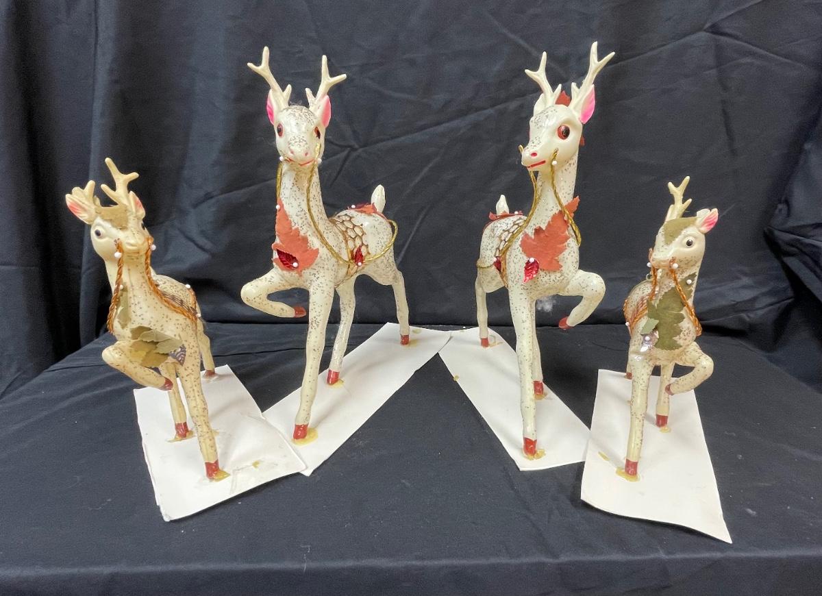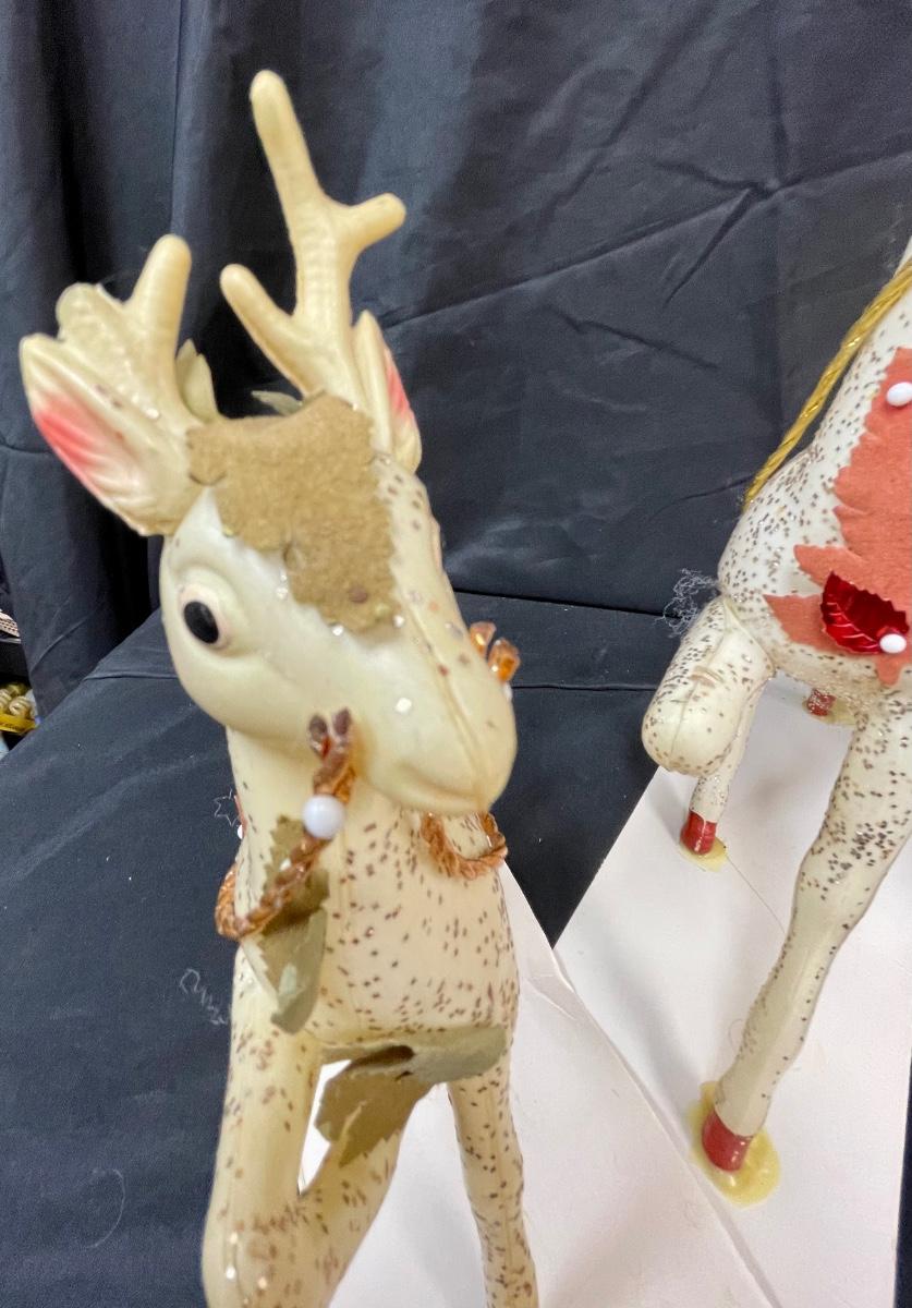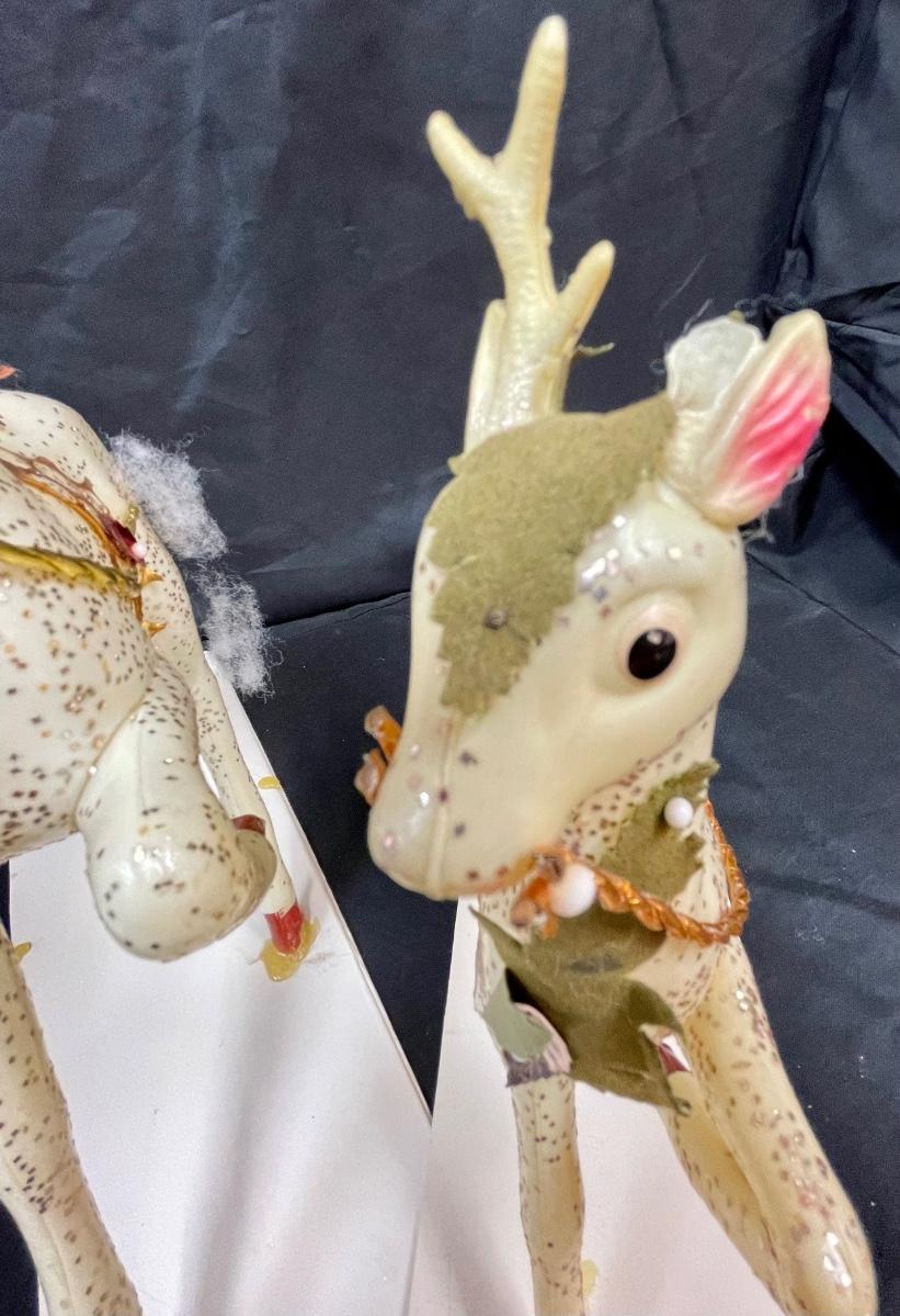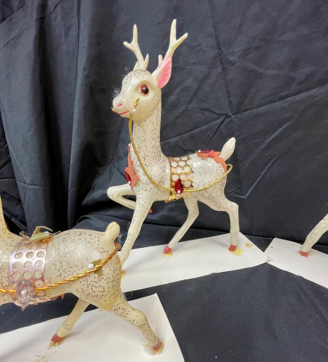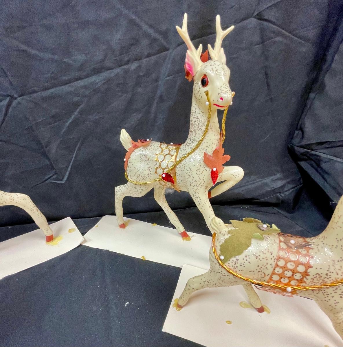 These appear to be a blow-mold type plastic that has been decorated with glitter and other adornments. They are glued to stiff paper. One of the smaller deer has an antler broken off.