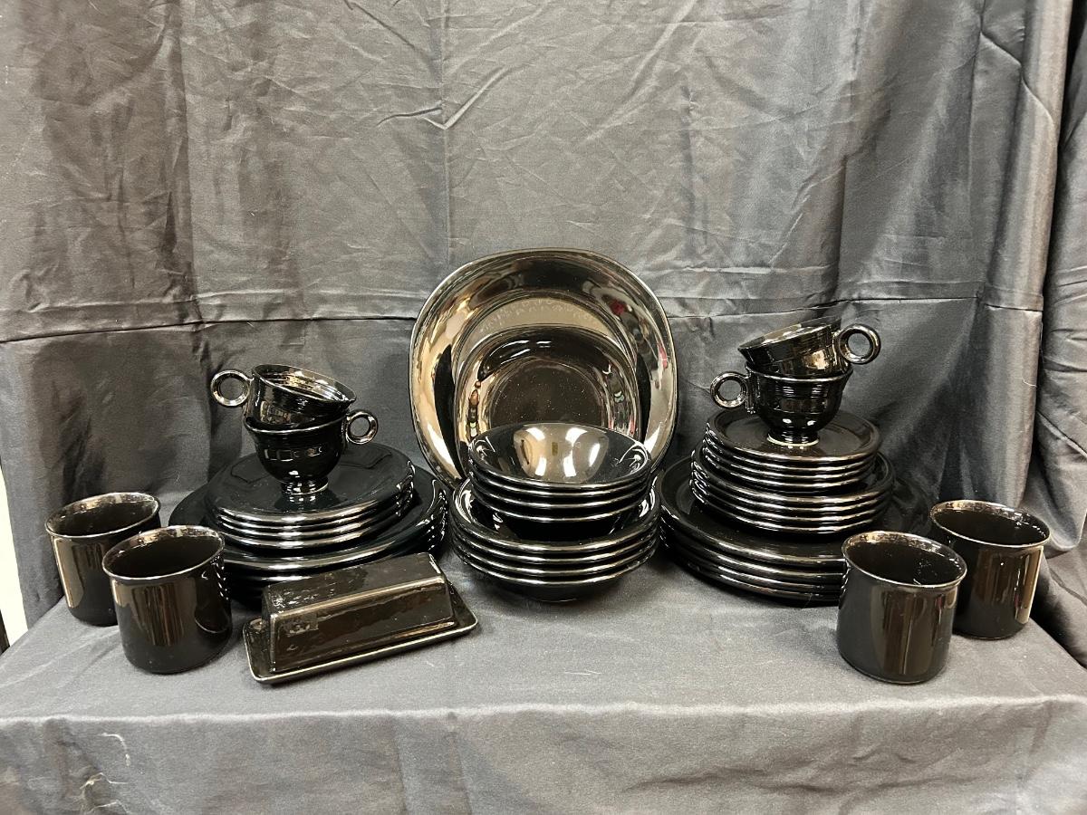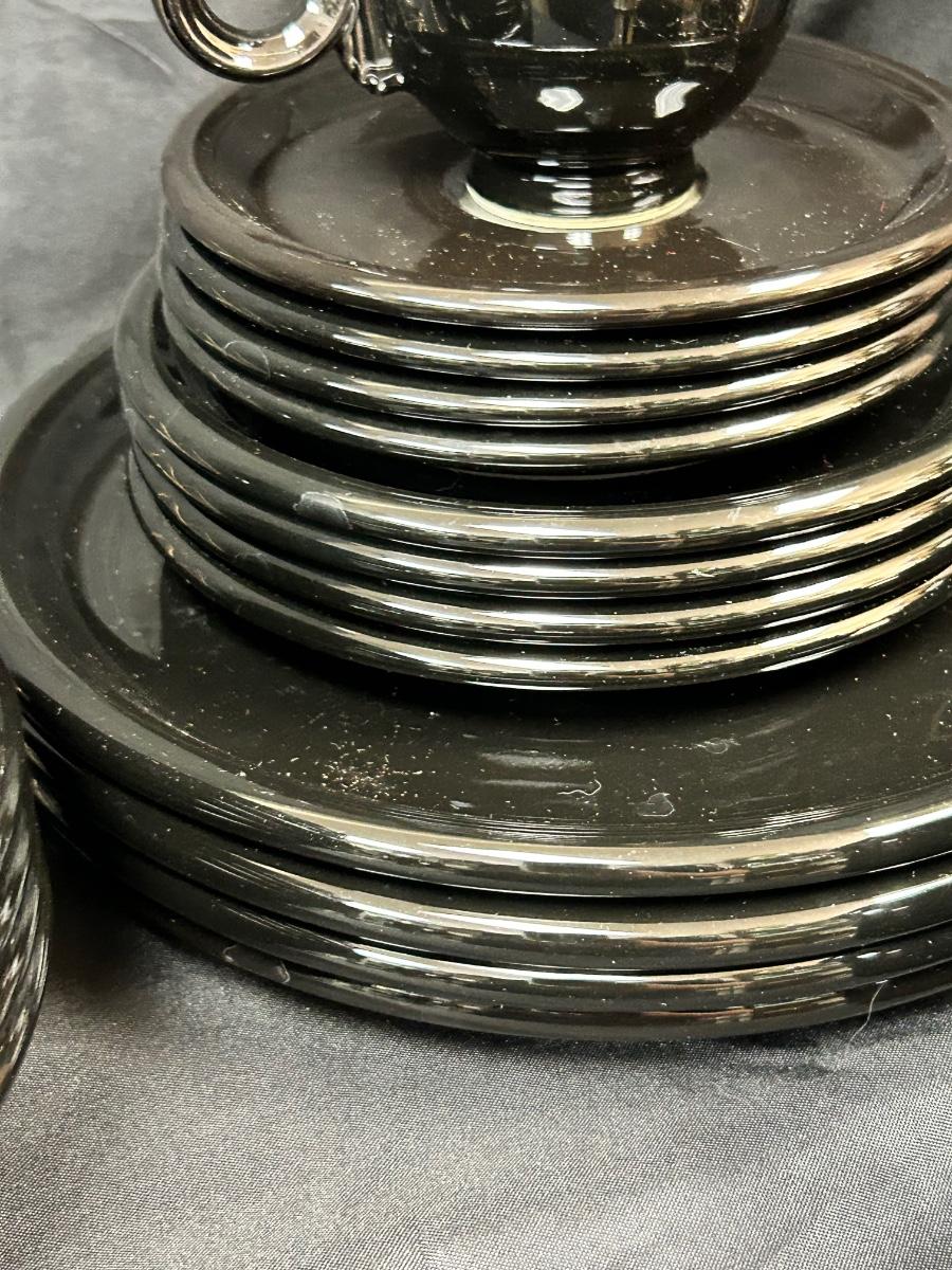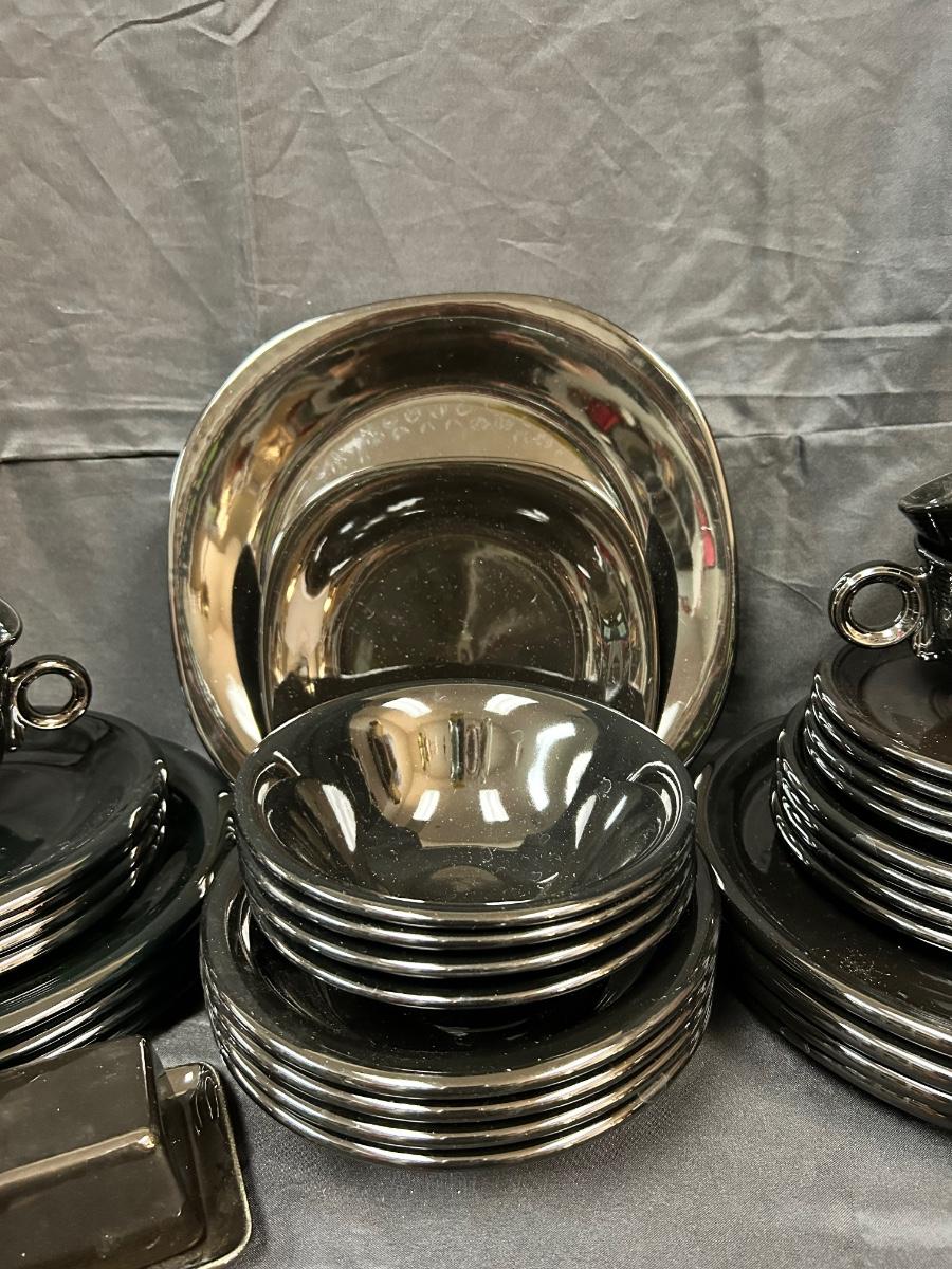 Large Black Dishware Dish Set Plates Bowls Cups Mikasa Moderna Jet Unbranded. This is two different dish sets combined. One set id Mikasa Moderna in Jet and the other is unbranded. In good condition. No chips noticed. Includes dinner plates, salad/dessert plates, chop plate, lidded butter dish, two cup sizes, and two bowl sizes.