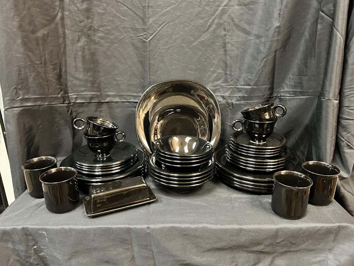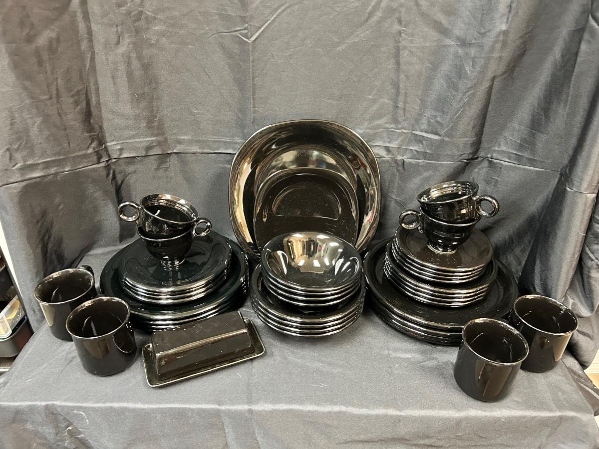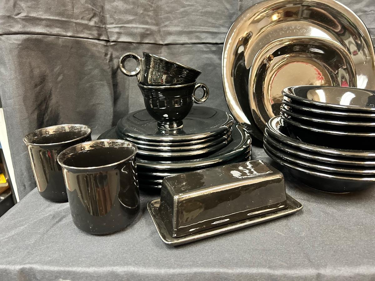 Large Black Dishware Dish Set Plates Bowls Cups Mikasa Moderna Jet Unbranded. This is two different dish sets combined. One set id Mikasa Moderna in Jet and the other is unbranded. In good condition. No chips noticed. Includes dinner plates, salad/dessert plates, chop plate, lidded butter dish, two cup sizes, and two bowl sizes.