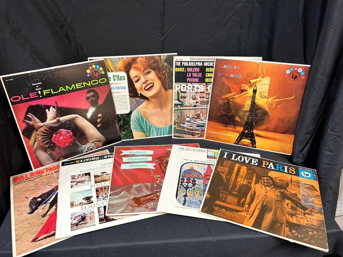 Mixed Lot of Vintage Midcentury Record Albums Foreign Travel Vacation Destinations Paris Spain Ports of Call. Various albums with music from different countries including Spain, France, Russia, and more. Not checked or played.