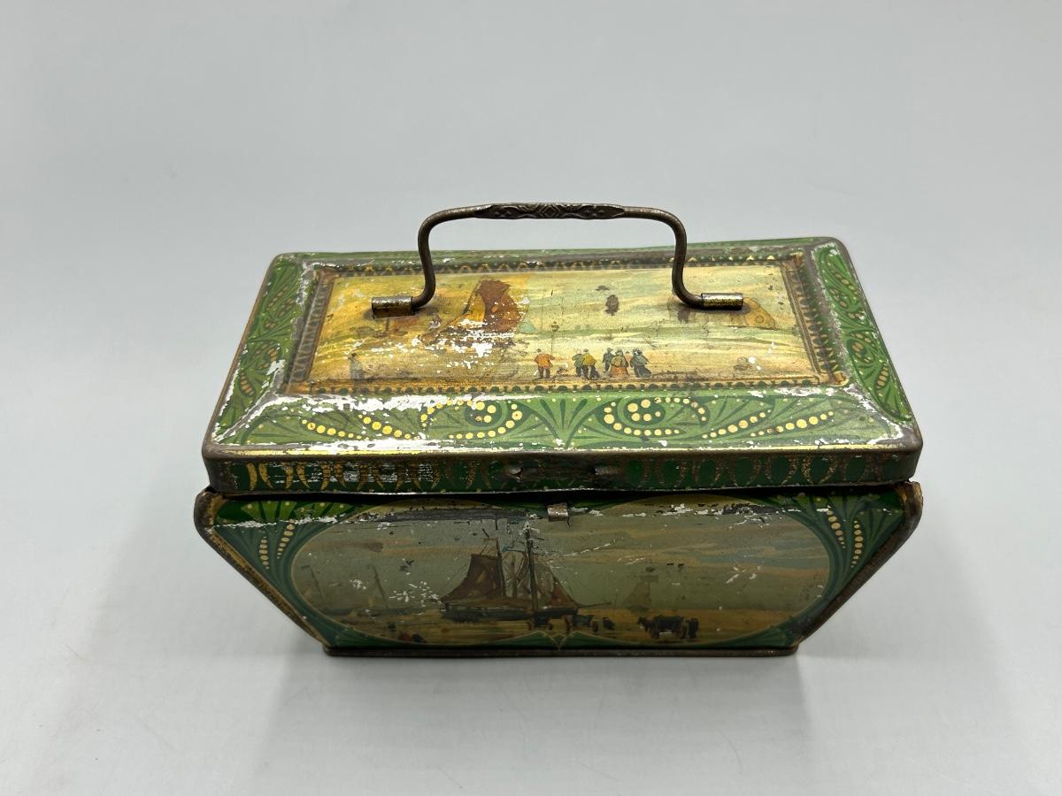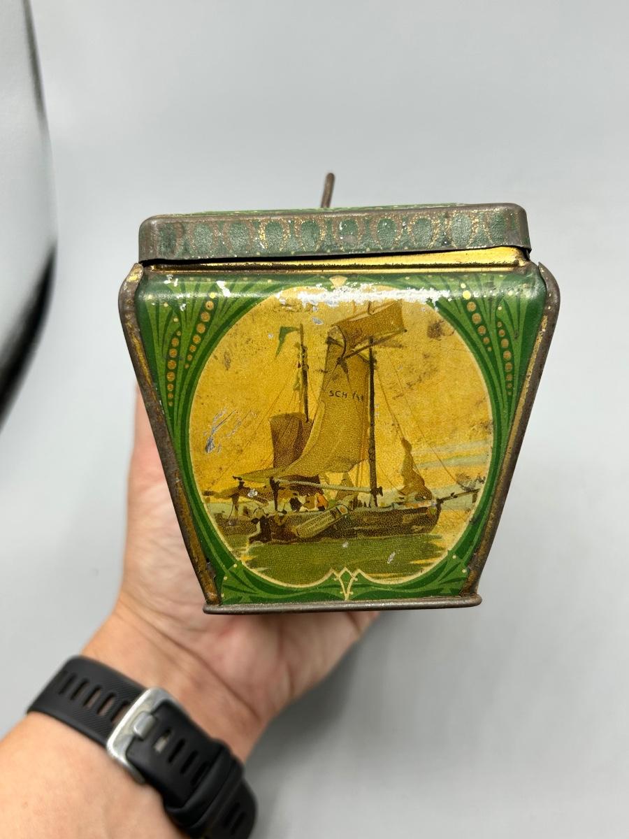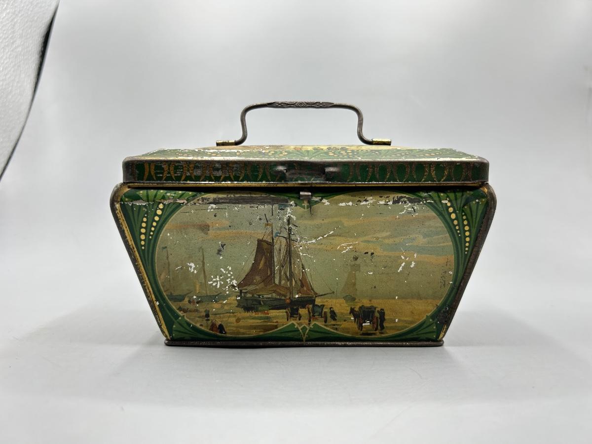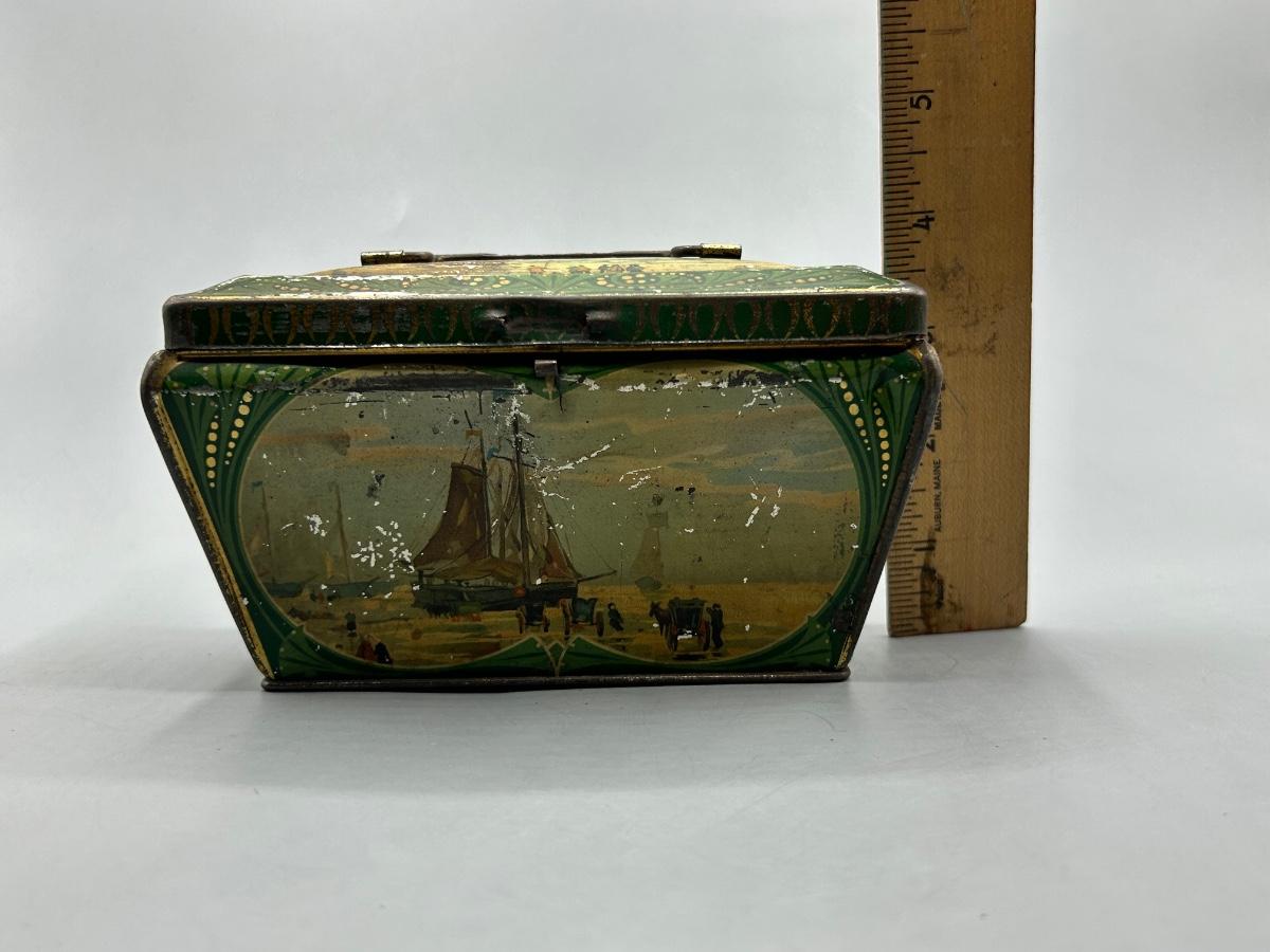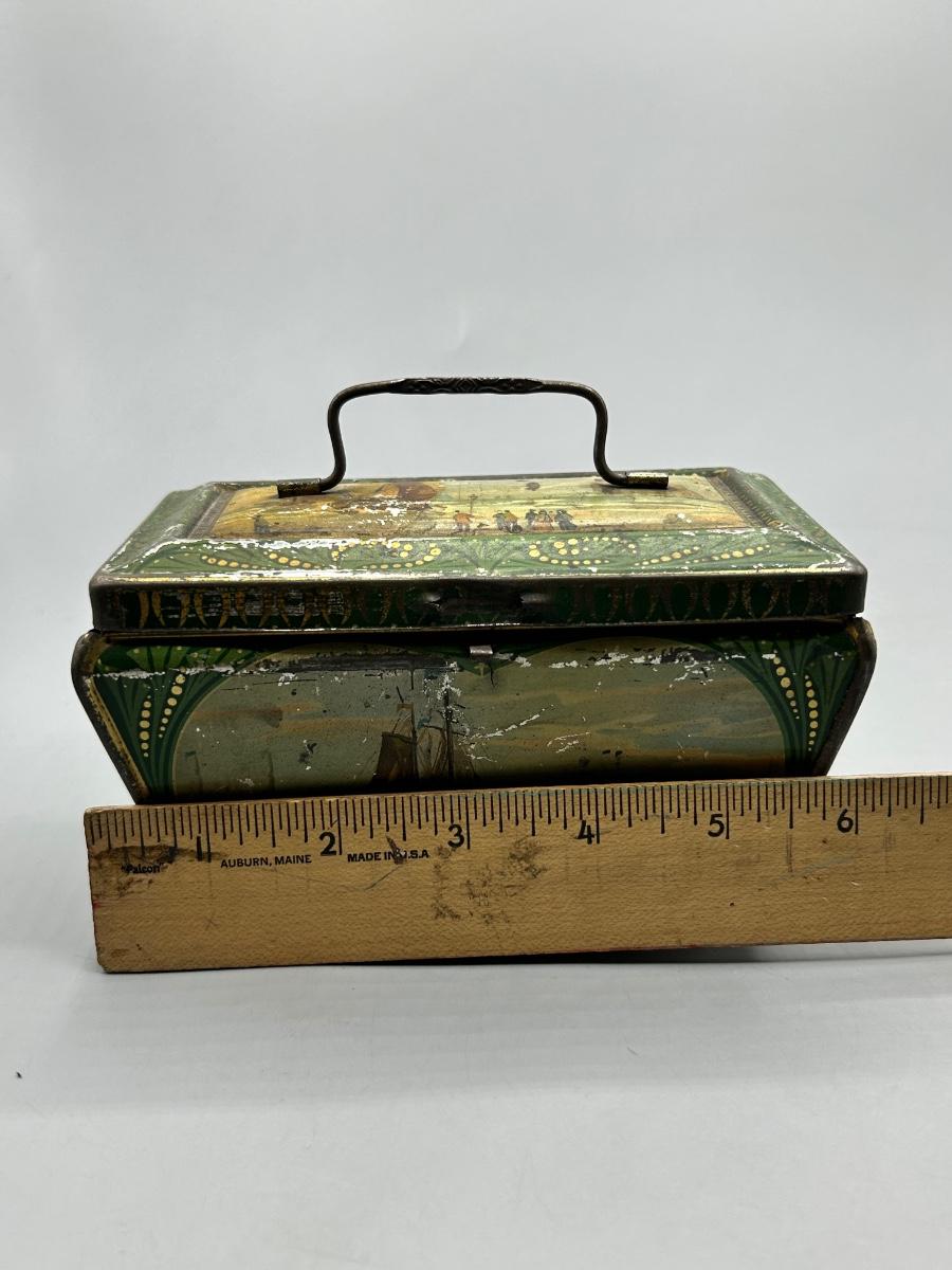 Vintage Coastal Sailing Ship Scene Handled Tea Tin Metal Box. In collectible vintage condition. Signs of age and wear but would display nice. About 6" size.
