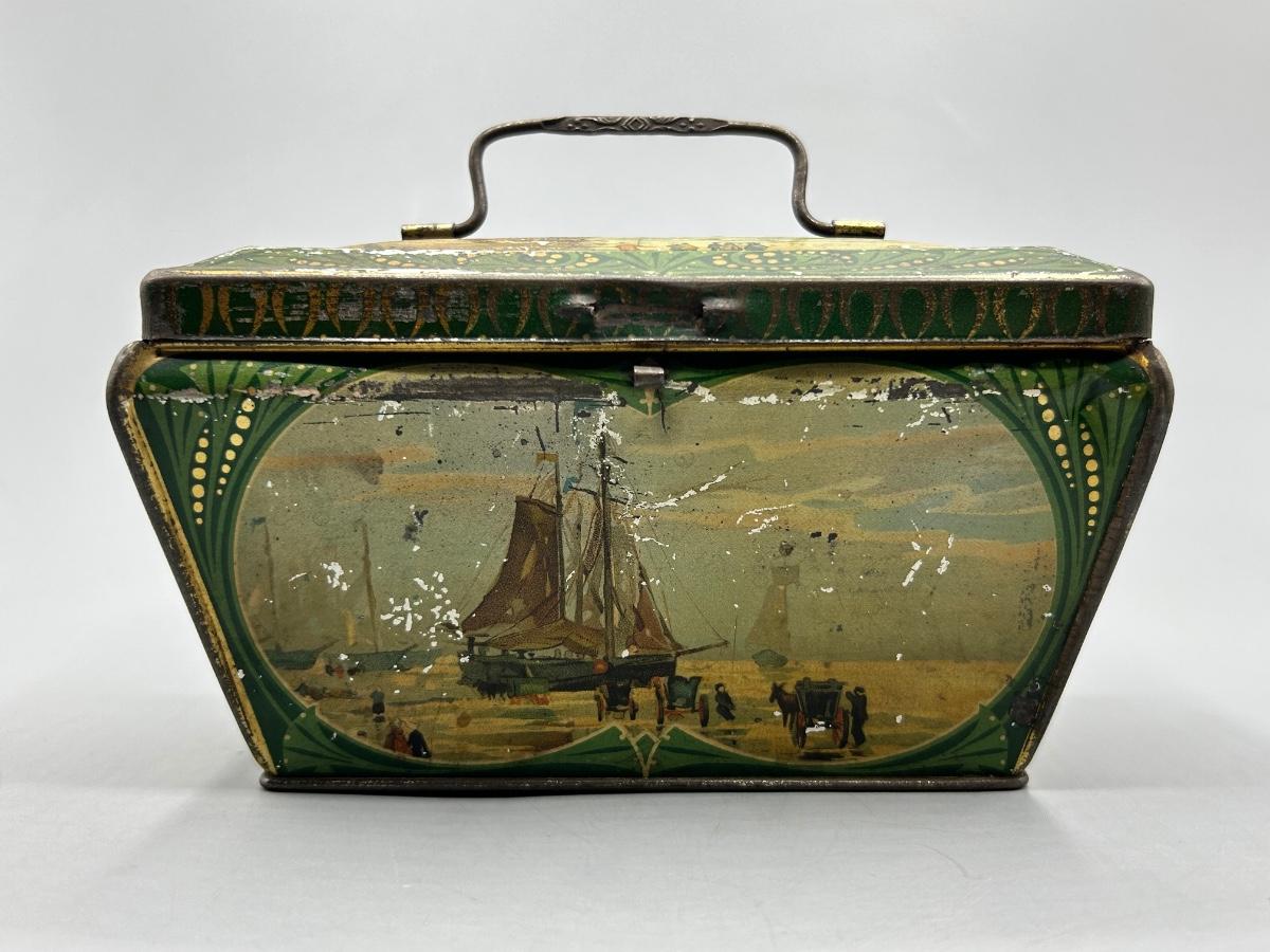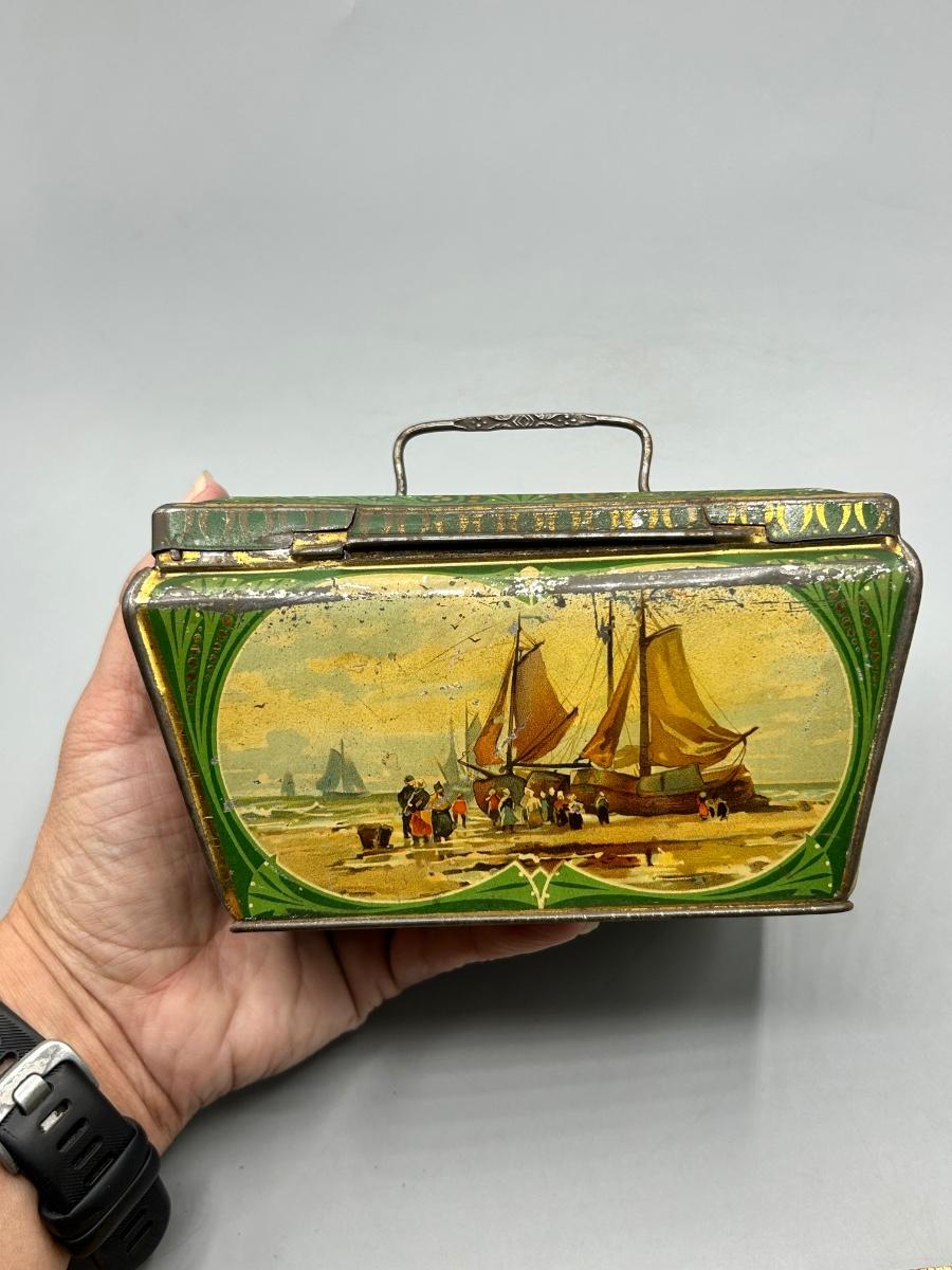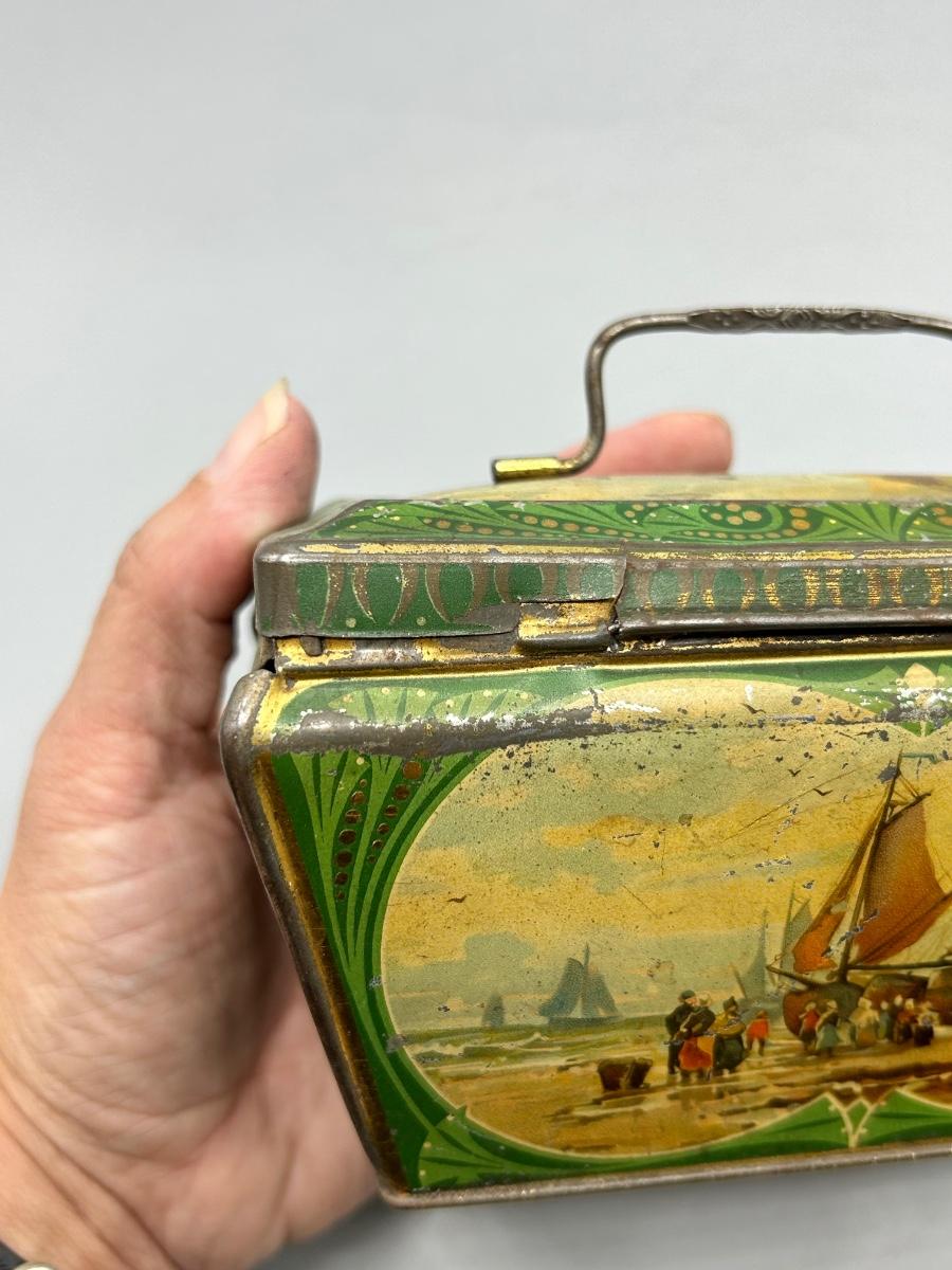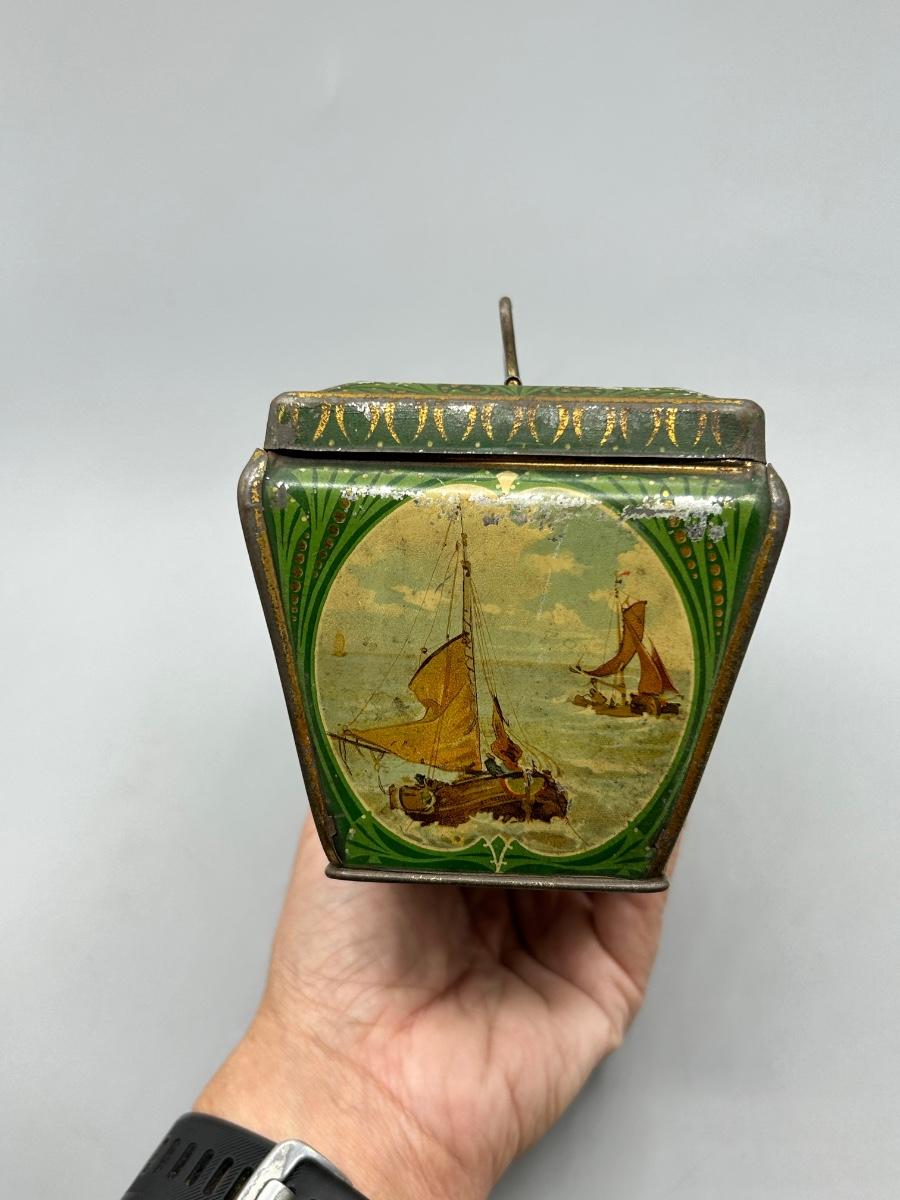 Vintage Coastal Sailing Ship Scene Handled Tea Tin Metal Box. In collectible vintage condition. Signs of age and wear but would display nice. About 6" size.