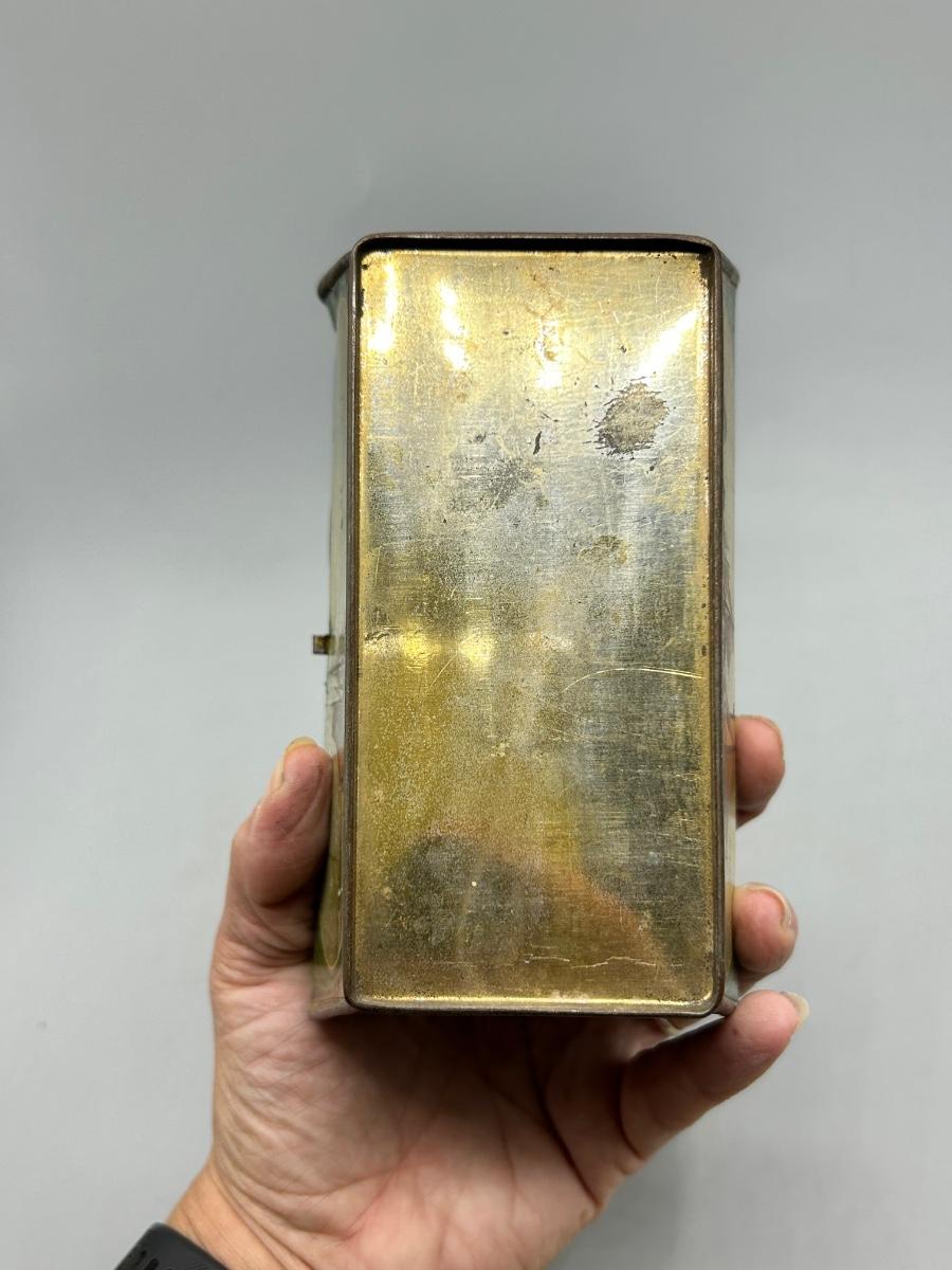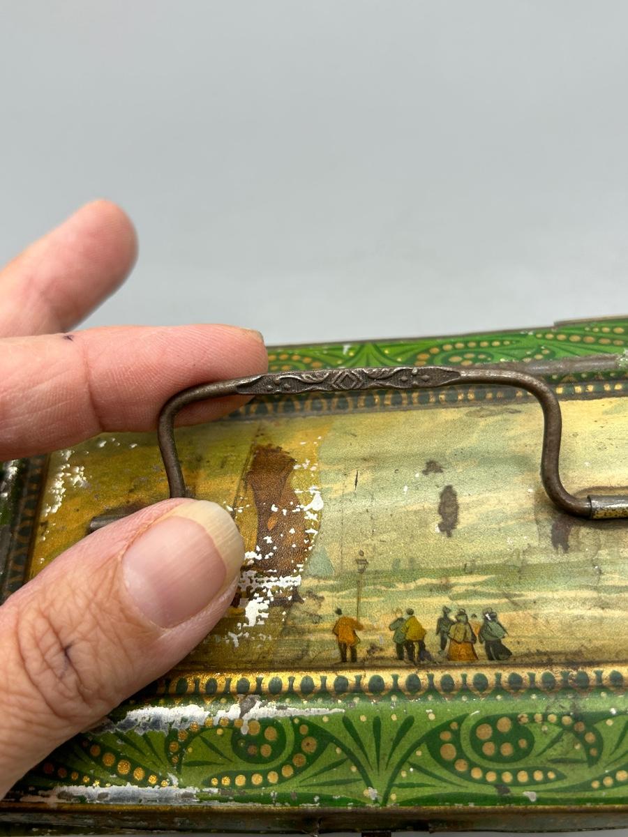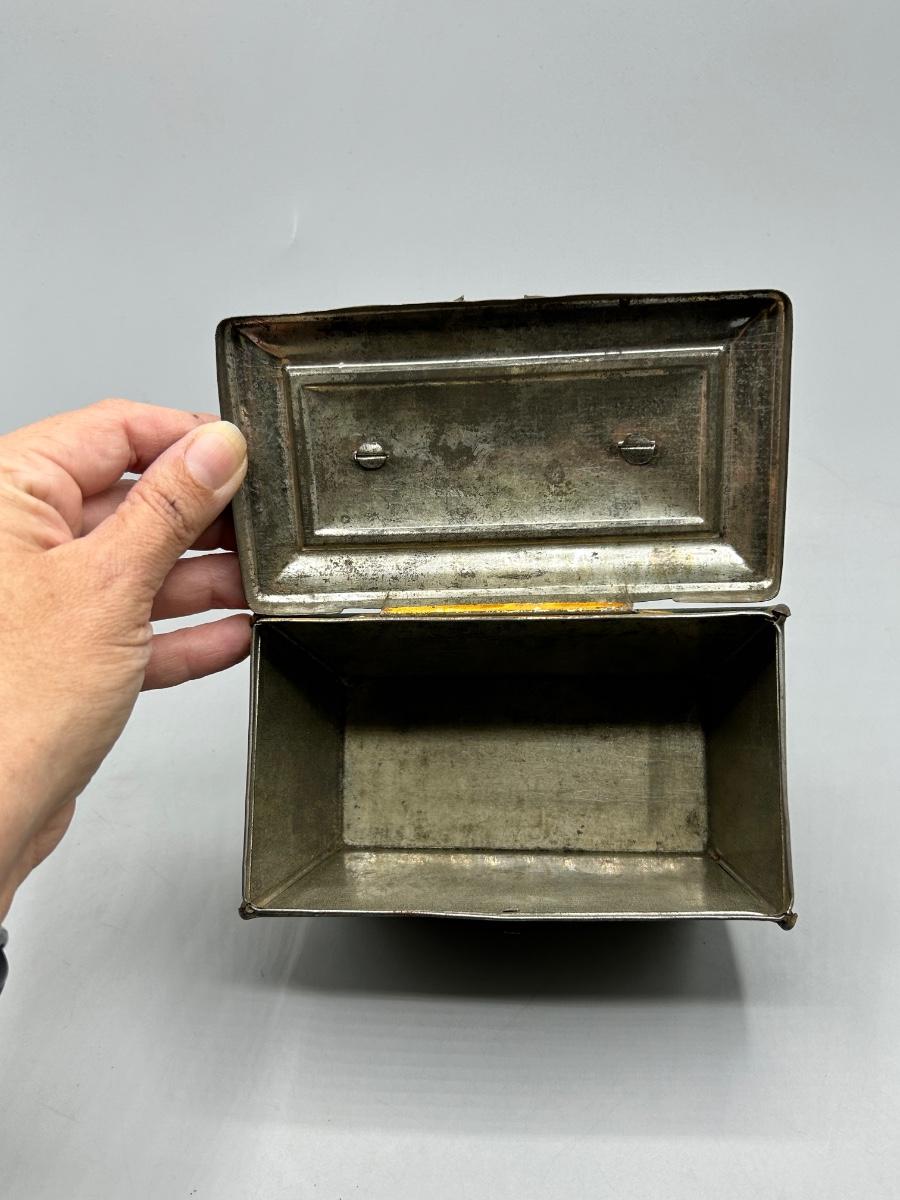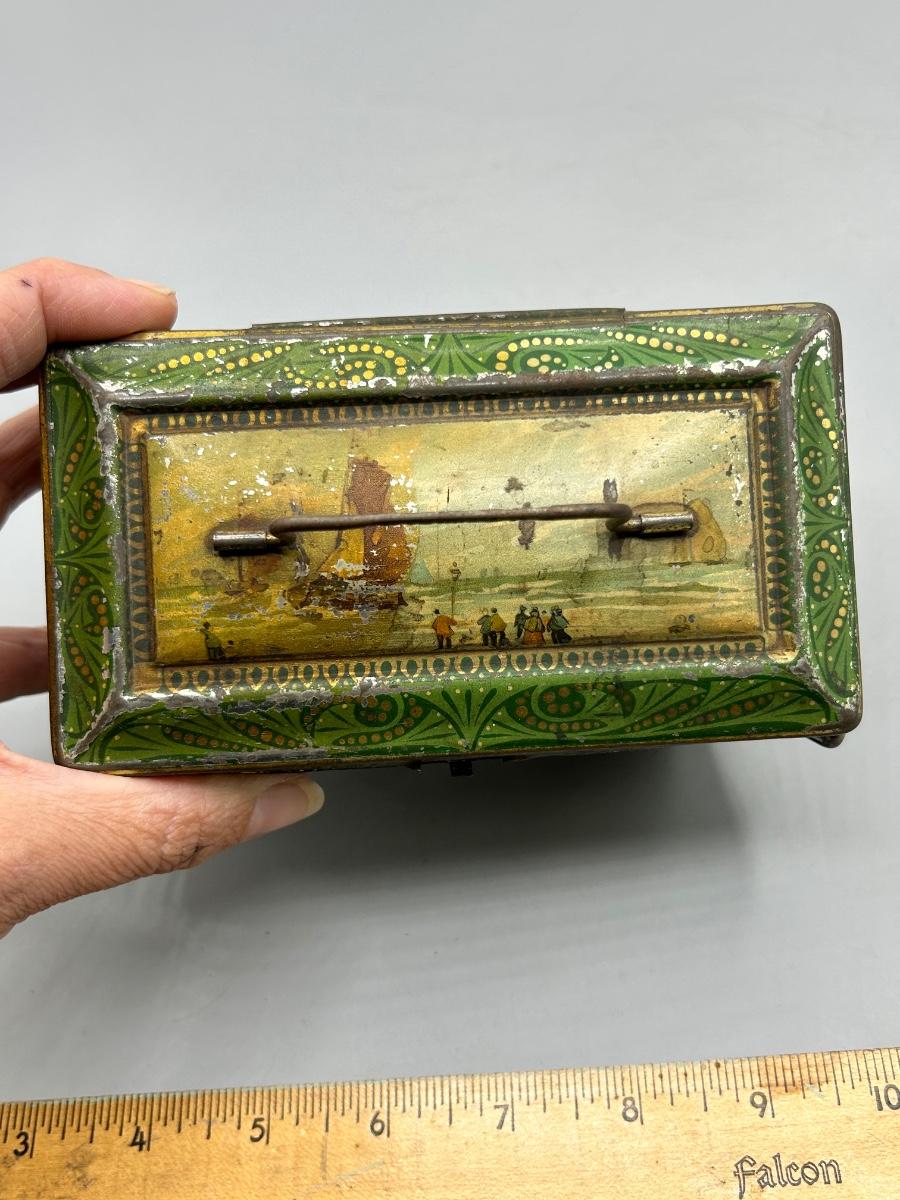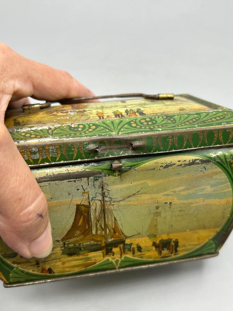 Vintage Coastal Sailing Ship Scene Handled Tea Tin Metal Box. In collectible vintage condition. Signs of age and wear but would display nice. About 6" size.