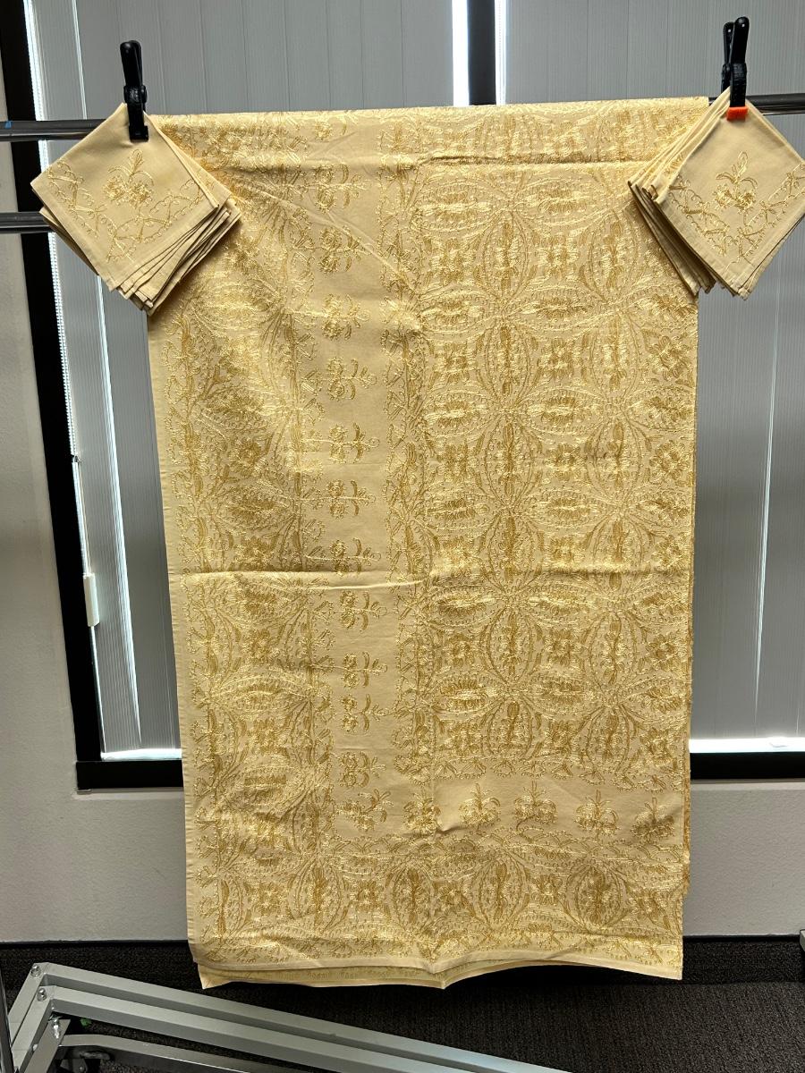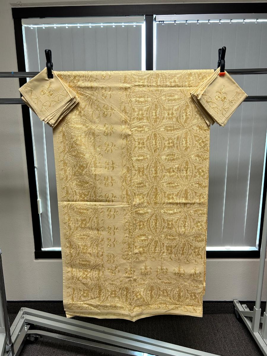 Large Gold on Gold Heavy Embroidery Stitched Pattern Tablecloth and Dinner Napkins. In good previously used condition, some light spots of discoloration. About 8' length.