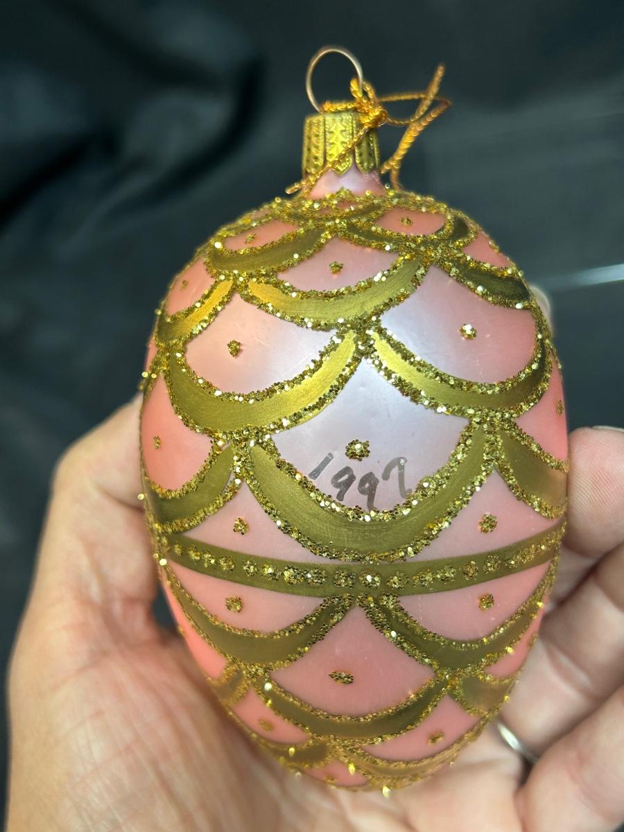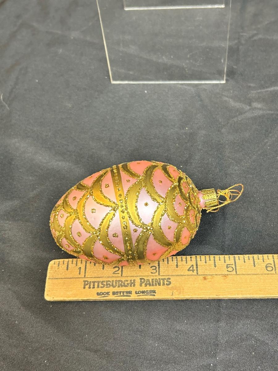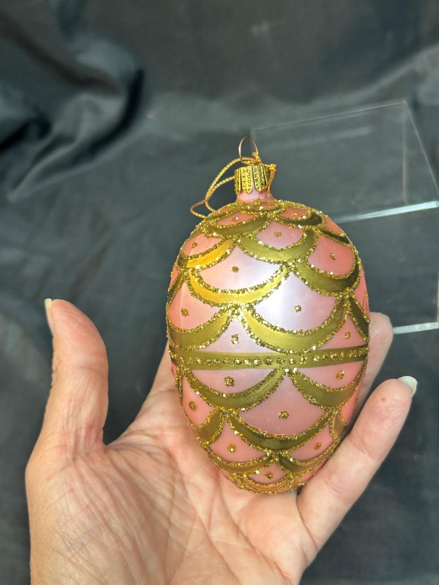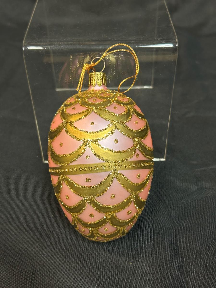 Peachy Pink and Gold Blown Glass Egg Shaped Christmas Holiday Tree Ornament. Gold glitter accent. In good condition. About 5" length. Previous owner wrote the date of 1997 in a small spot on side.