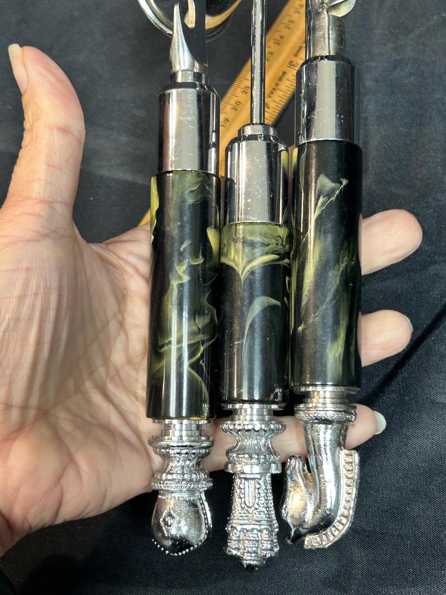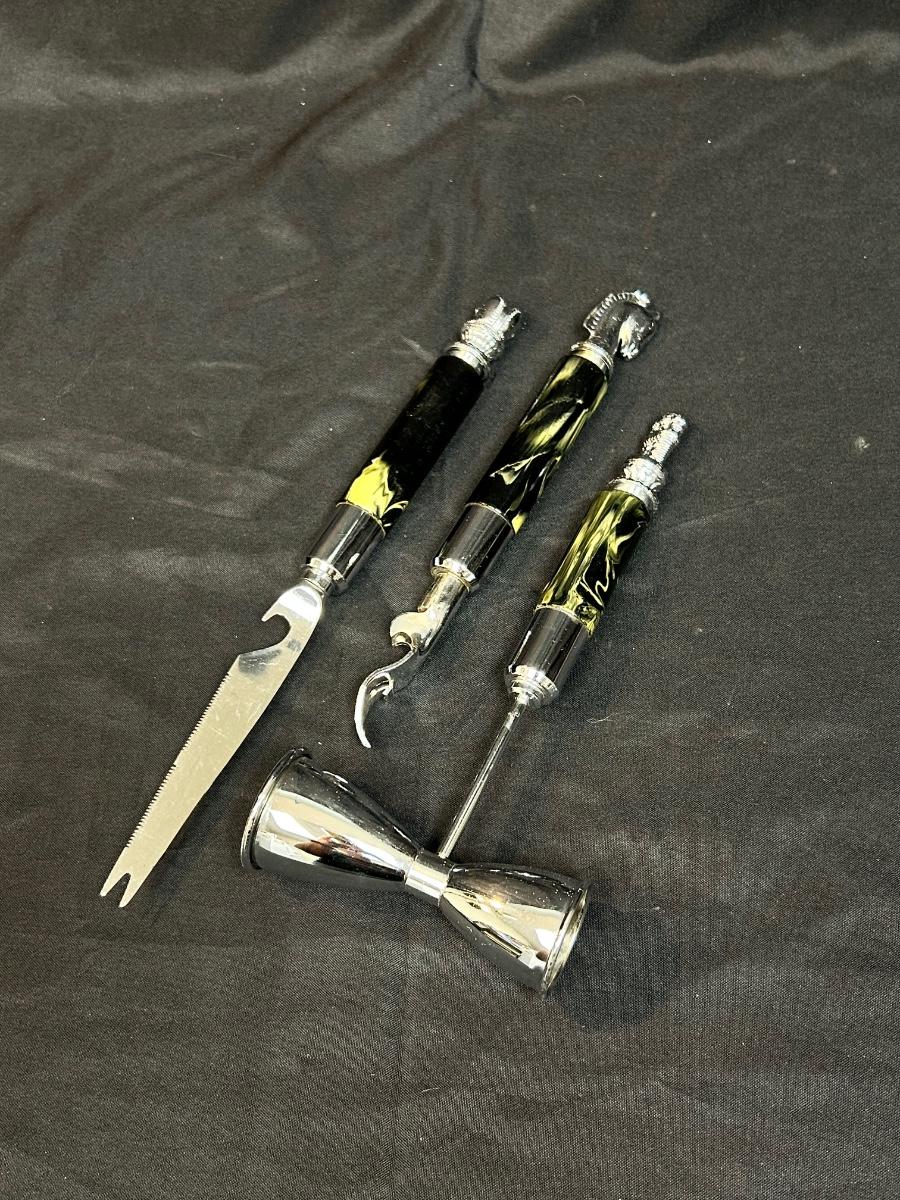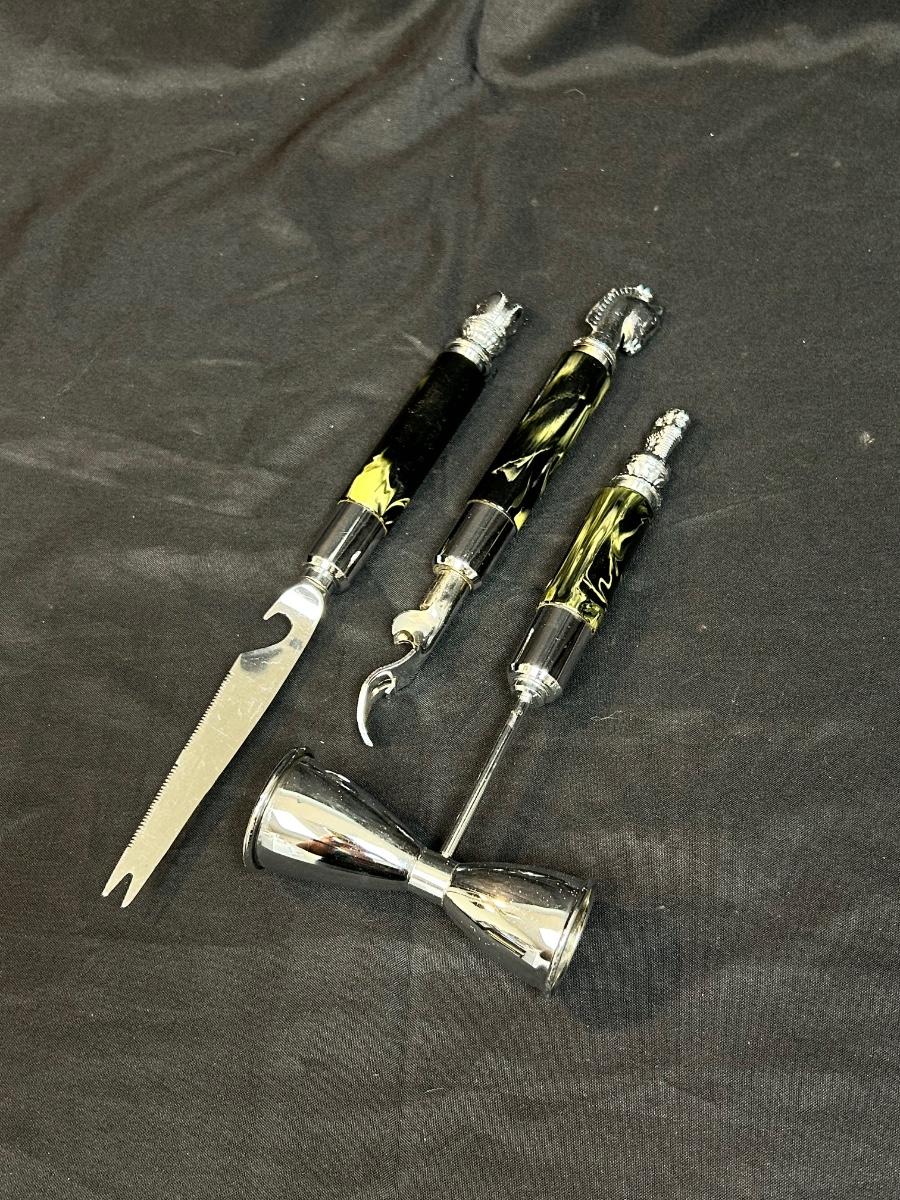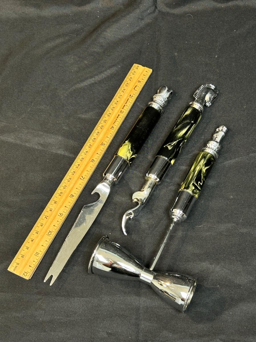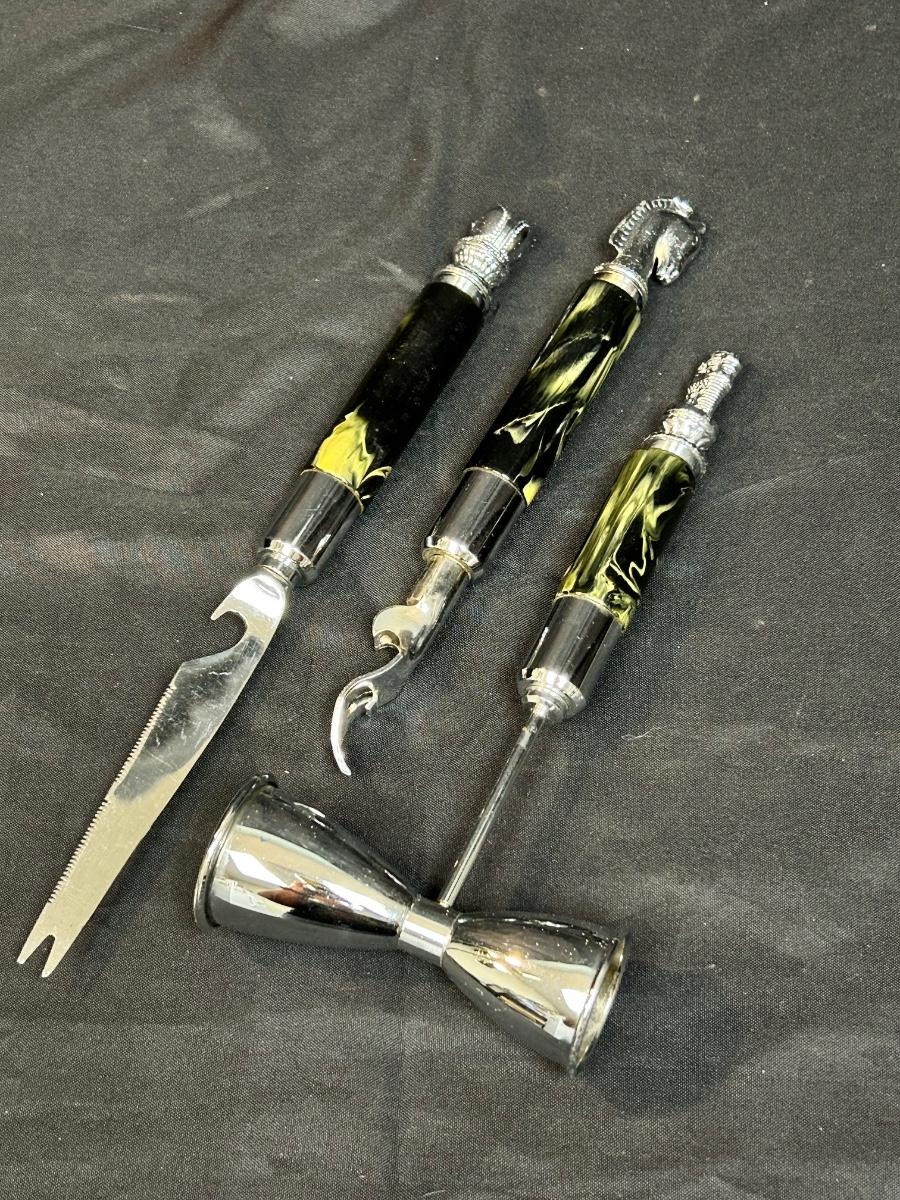 Vintage Black Swirled Bakelite Handle Chess Themed Barware Utensil Set Midcentury