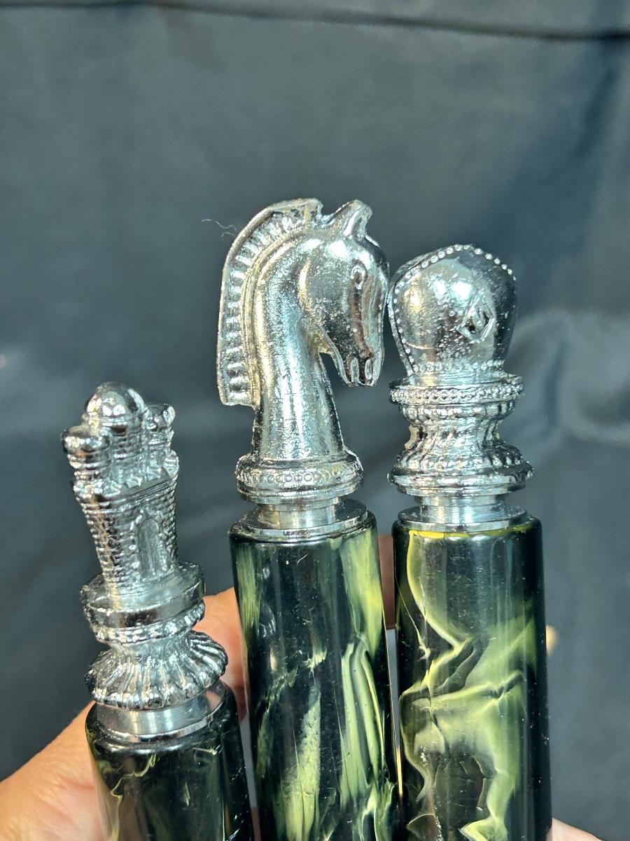 Vintage Black Swirled Bakelite Handle Chess Themed Barware Utensil Set Midcentury. Handles untested but they do look like bakelite plastic. In good condition, heavy weighted ends.