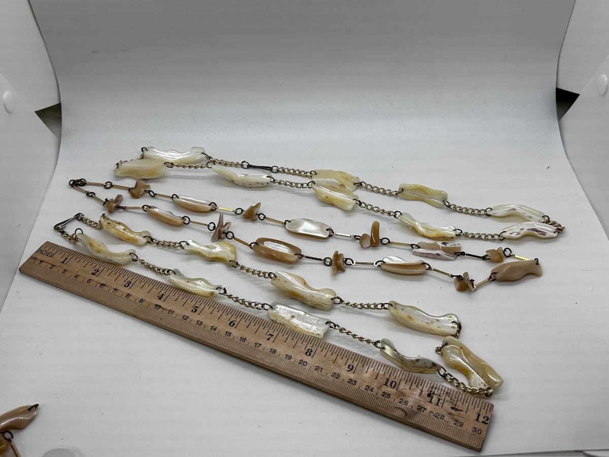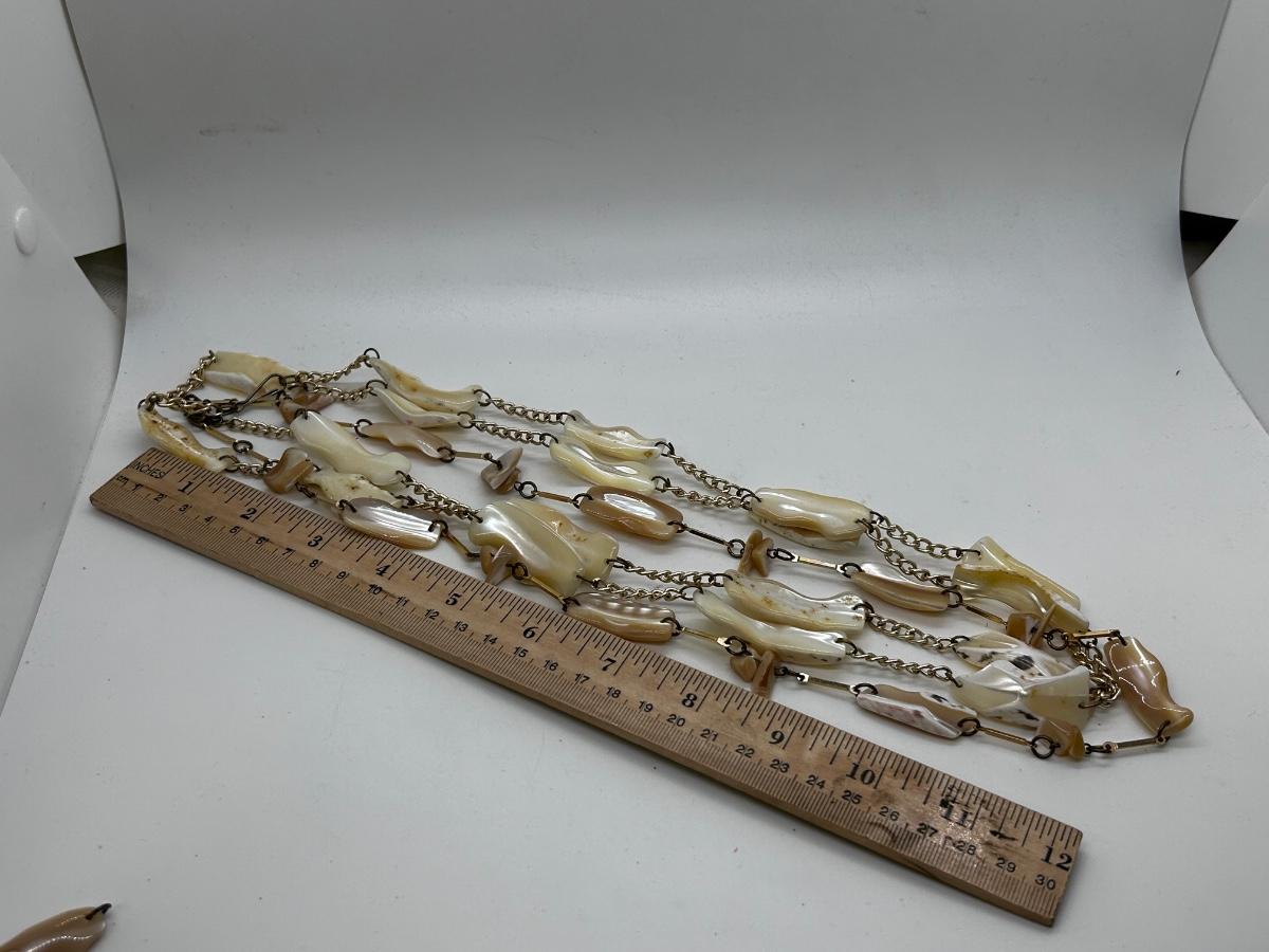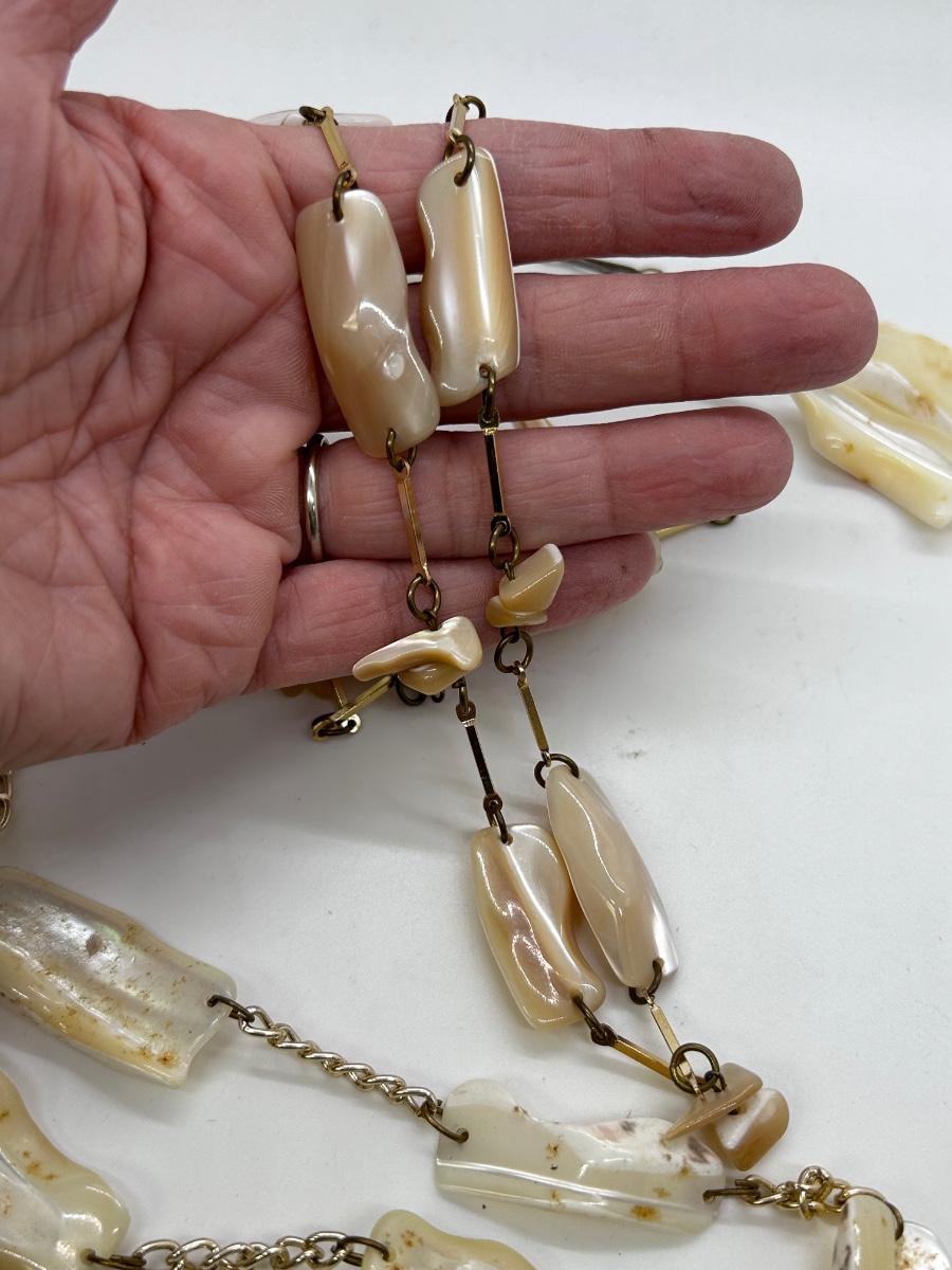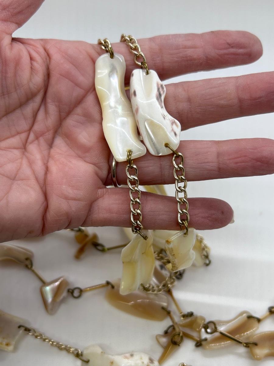 Lot of Three Polished Shell Fragment Necklaces with Gold Tone Lightweight Metal Chain. In good condition. Great as is or repurpose craft and jewelry.
